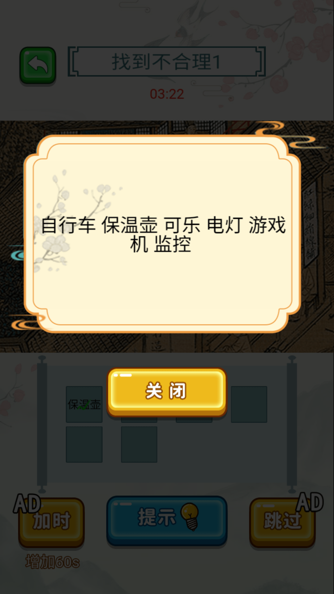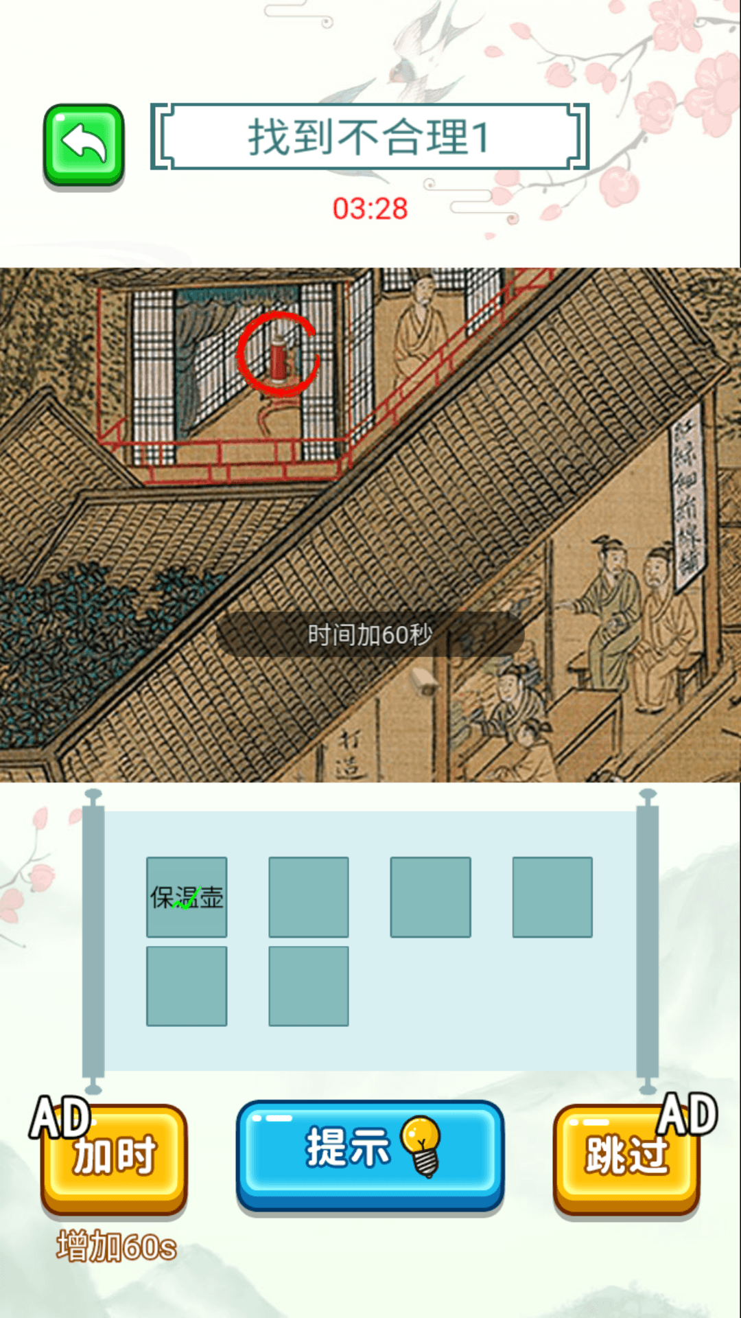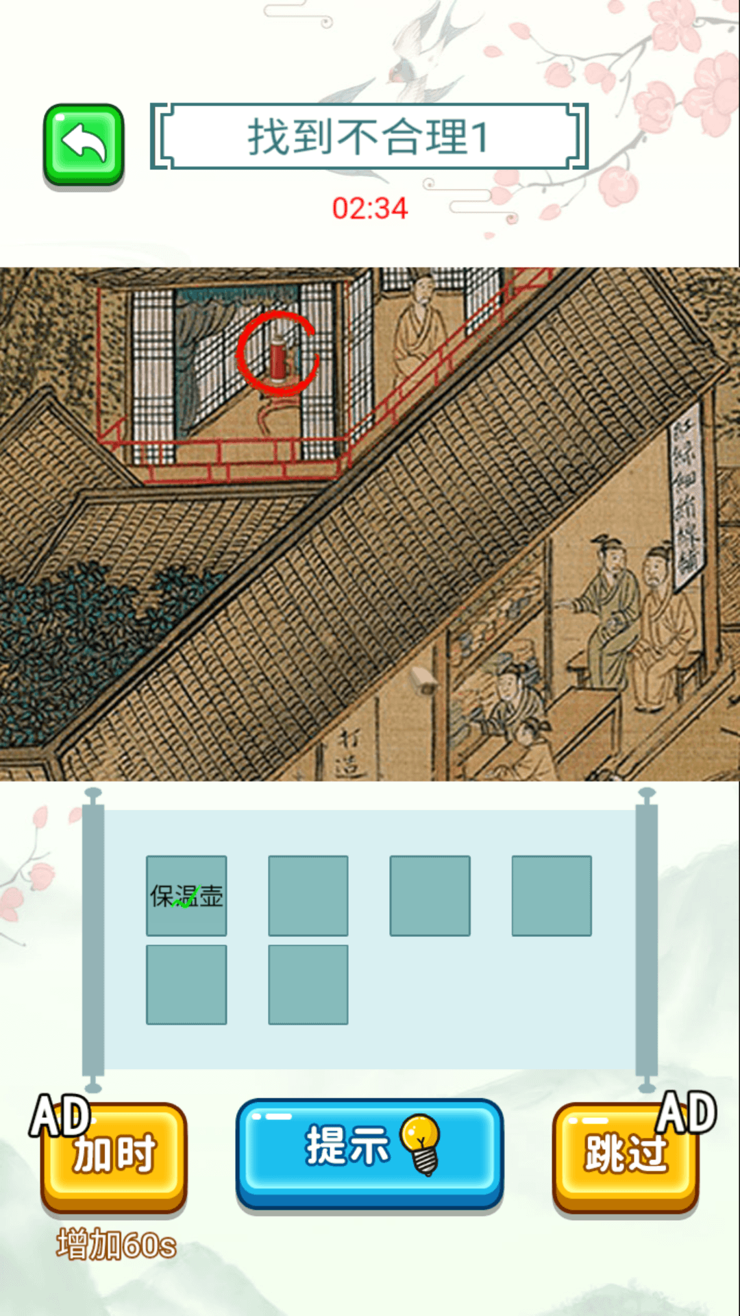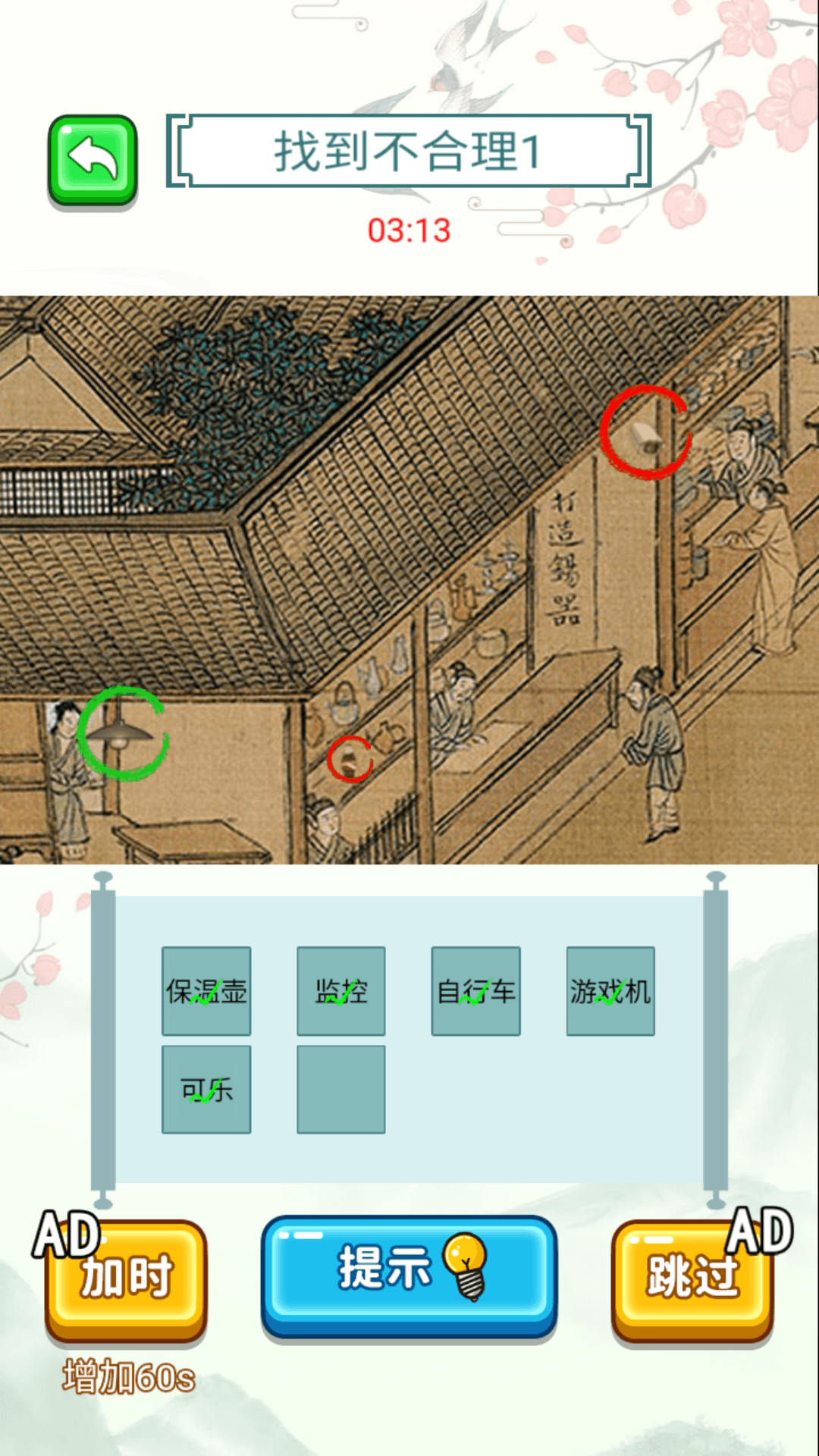 一款休闲益智找茬手游,在这里你要在一幅幅画面中找出不对劲的物品,比如存在古代的电线杆,自行车,笔记本等奇怪的物品。以及各种各样的找茬图等着你来挑战!