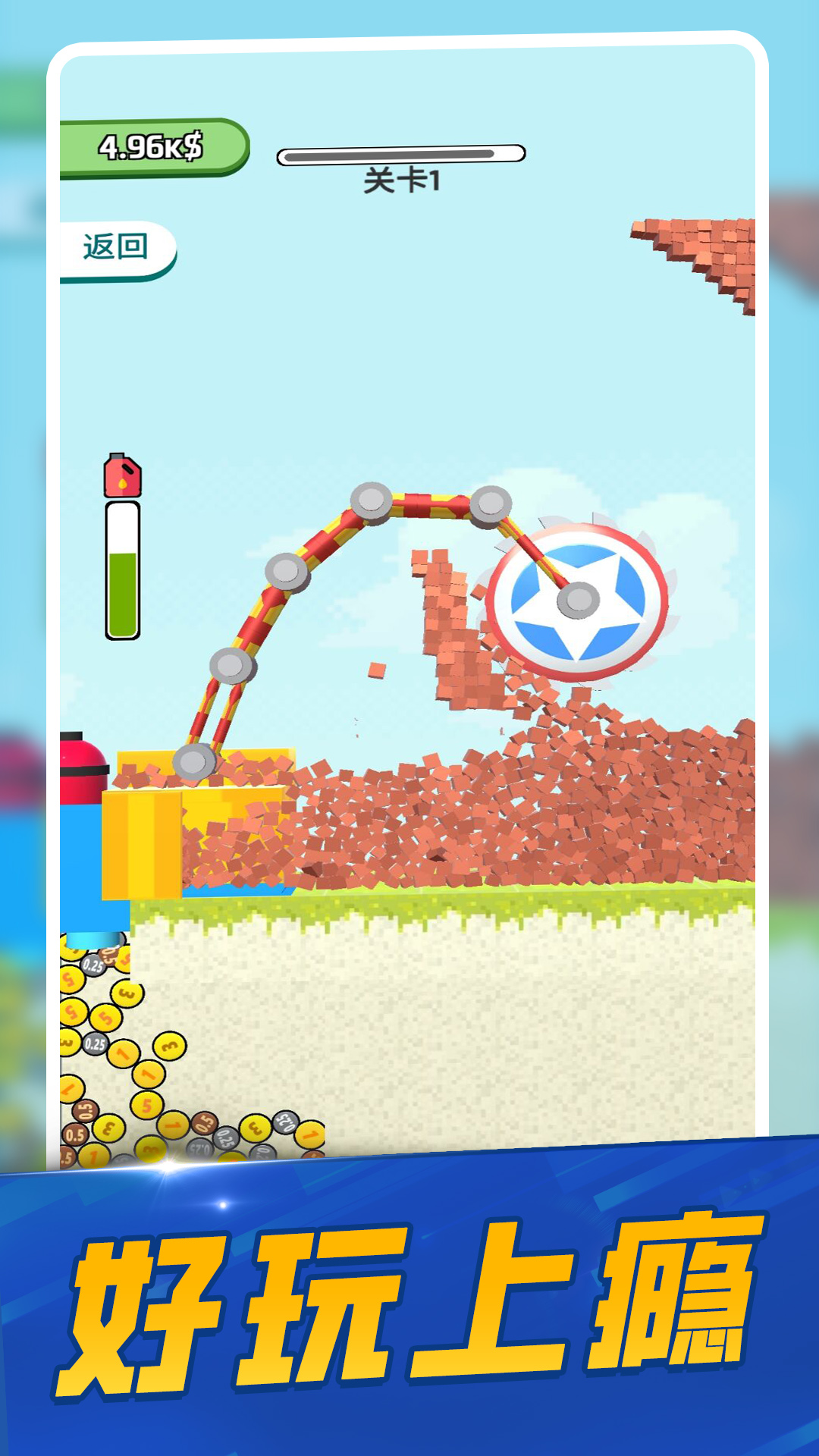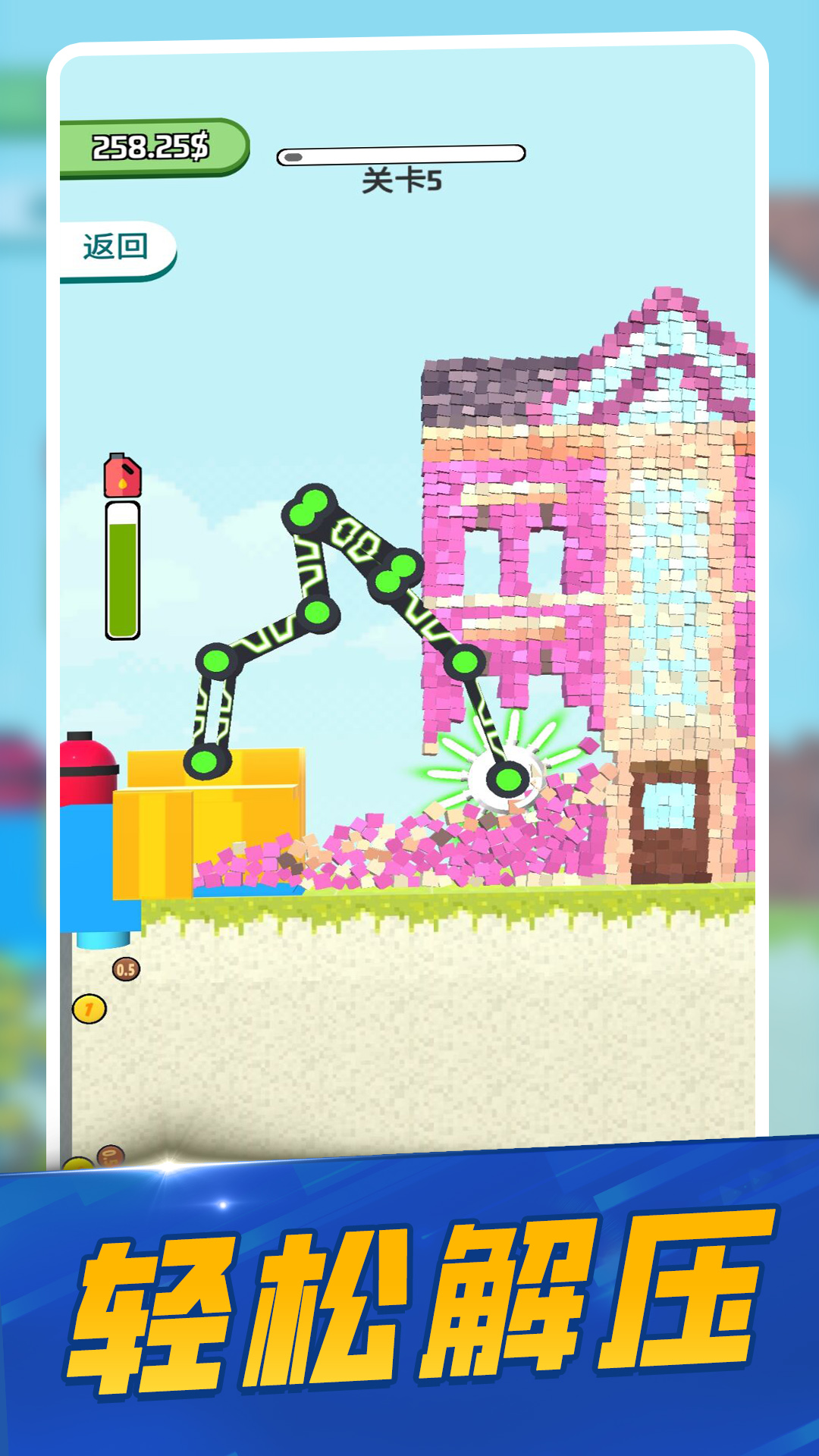 模拟拆墙,解压你的心情,舒快的玩耍,轻松的体验到底,拆掉的砖块越多获得的奖励越多。游戏的操作非常的简单,在你撞碎物品后还可以拿到奖励,你还可以升级你的钩子,让它钩得更远并且更具有破坏力。这个吊车不好控制呢,想要拆掉所有的墙体,需要适当的练习,而且要在时限内完成所有的拆除工作。
