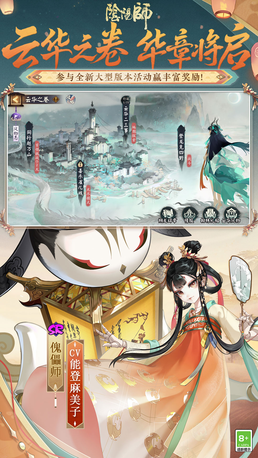 天有龙,载地行。八周年全新版本「云华之卷」9月11日正式开启! ● 全新式神:全新SSR阶式神 龙珏(CV:佟心竹 / 石见舞菜香)、SP阶式神 心友犬神(CV:巴赫 / 关俊彦)降临平安京!多重召唤福利助力各位大人与新式神结缘! ● 周年庆版本活动:大型活动「云华之卷」开启!参与活动还可获取随机SP/SSR式神召唤券、傀儡师新皮肤·闲影春衫、御行达摩等丰厚奖励! ● 周年庆典福利放送:式神新装、全新庭院皮肤、全新氏族英杰皮肤免费放送!更有每日免费召唤次数限定活动,前往八周年时光机免费领取随机SSR/SP式神!山蛙祭福、对弈竞猜等活动陆续开启! ● 新区开启:全平台新区「有龙则灵」开启,多重新区福利上线!完成新区相关活动,可得自选SSR、式神皮肤等新手福利!限时免费试用多个5星强力SP/SSR,自选强力六星式神协战!