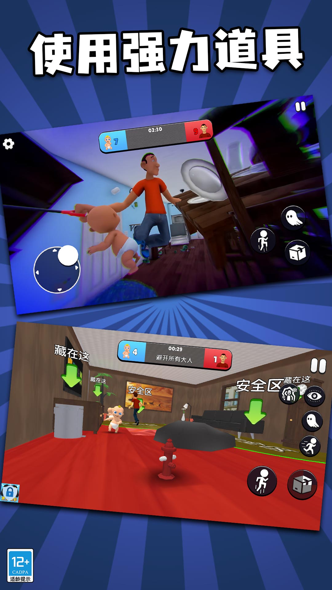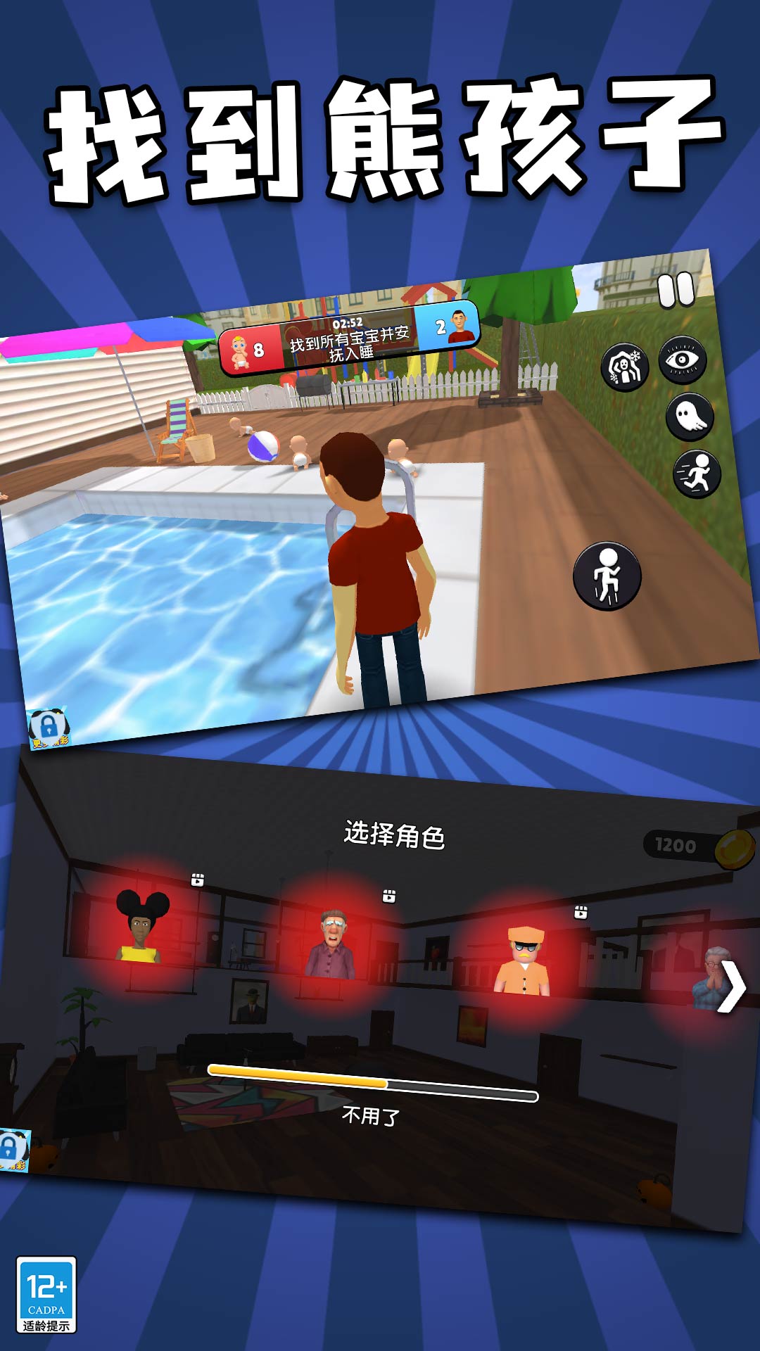 《找到熊孩子》是一款趣味解压,刺激好玩的休闲游戏。玩家将参加令人兴奋的家庭游戏,全家躲猫猫。在游戏中可以扮演任一角色,宝宝,爷爷,奶奶,爸爸,妈妈,姐姐,叔叔。宝宝需要在限定时间内躲藏,避开所有大人;而其他大人则需要在限定时间内找到调皮的宝宝。快来享受一起游戏的乐趣吧!
