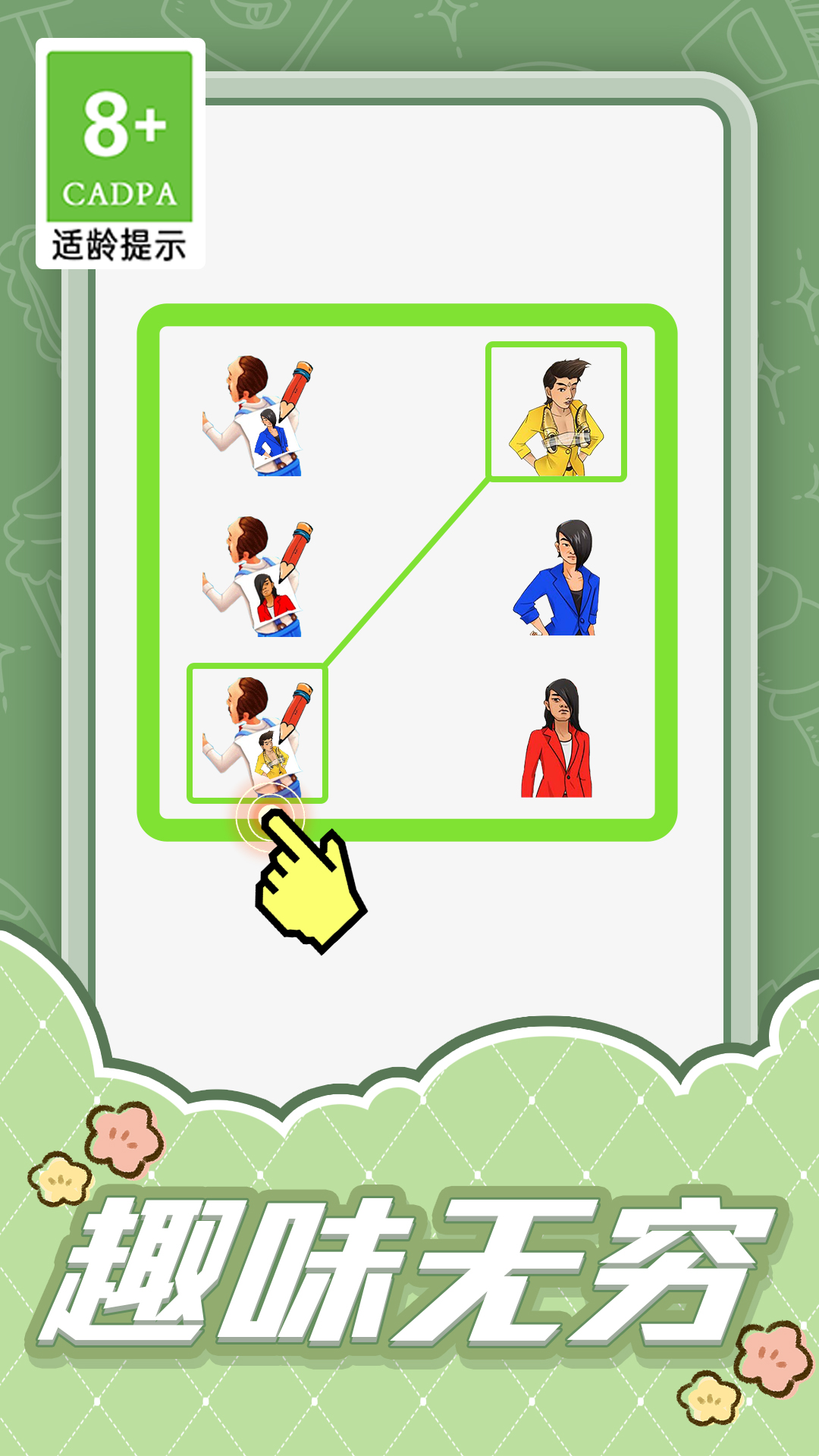这是一款表情文字链接大挑战的连线小游戏,通过分析它们的特点,正确并快速地进行两两配对,让表情找到它们的搭档。解压,好玩,非常容易上手哦