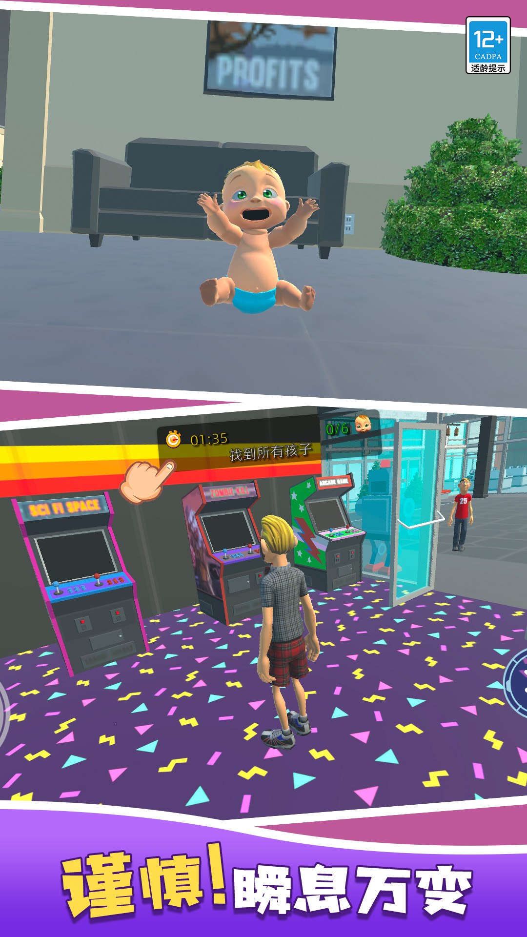 爸爸来抓我是一款3D风格的趣味角色扮演躲猫猫游戏,你将要去进行一场非常独特的躲猫猫闯关冒险,在躲猫猫闯关中每局都由多名玩家组成,随机抽中其中5人扮演宝宝。当你作为宝宝时,你可以在游戏中与其他宝宝组成捉迷藏小队,在广场、商店、卧室等各种场景里隐藏好你的身形并躲避大人的寻找,有时还需要完成一些寻宝任务,被抓到的人直接出局,展开一场紧张刺激的捉迷藏挑战,赢取战斗的胜利!