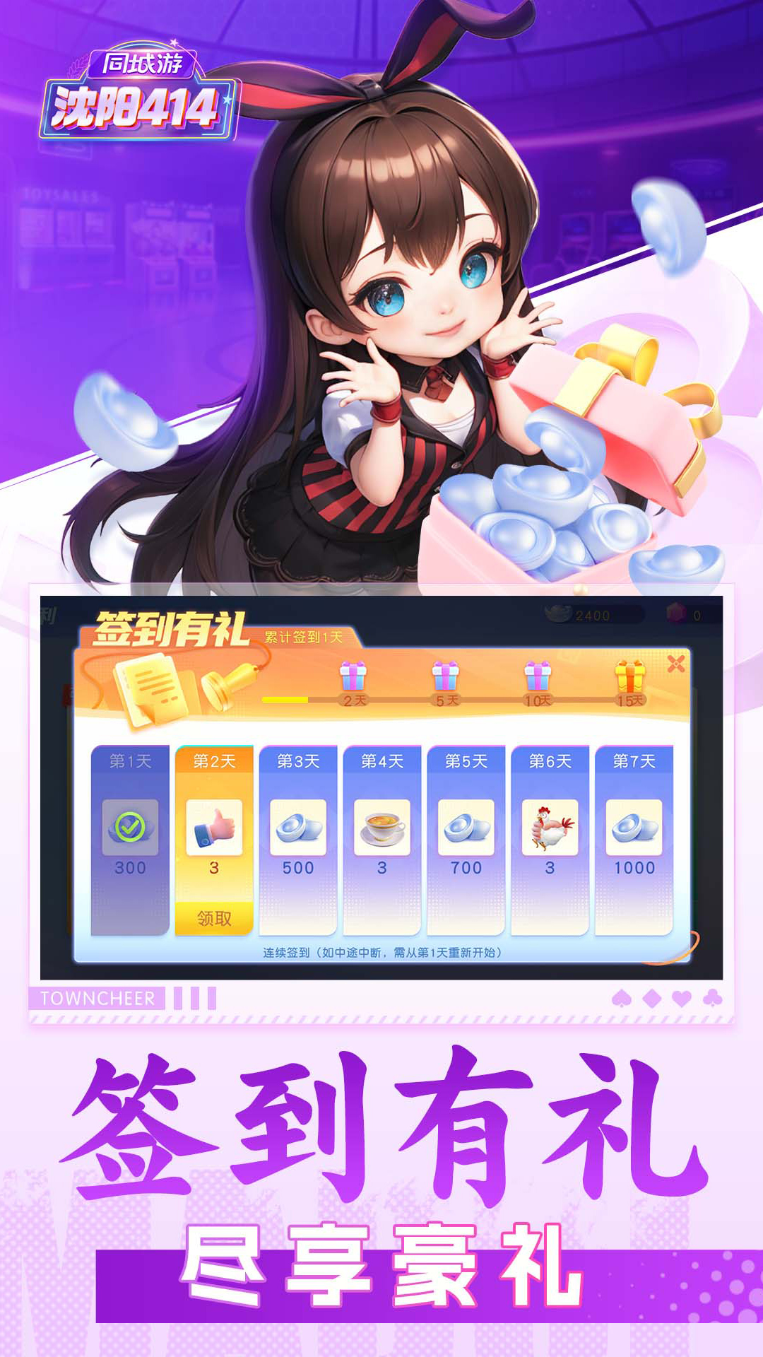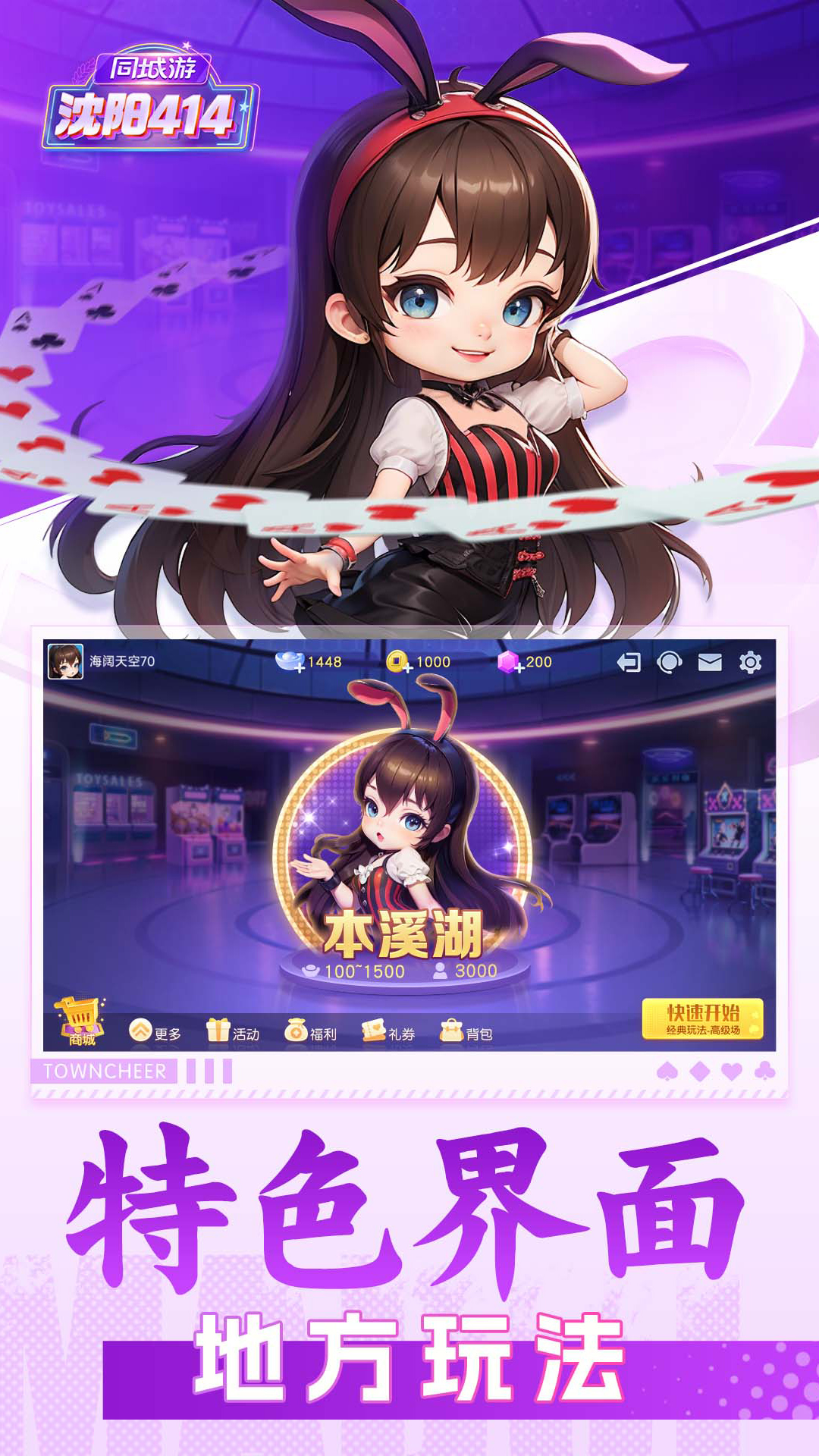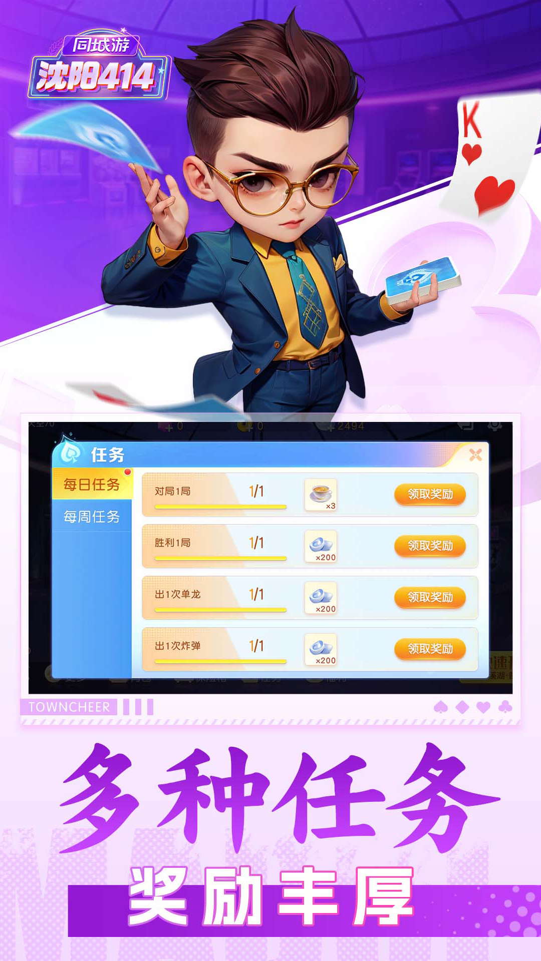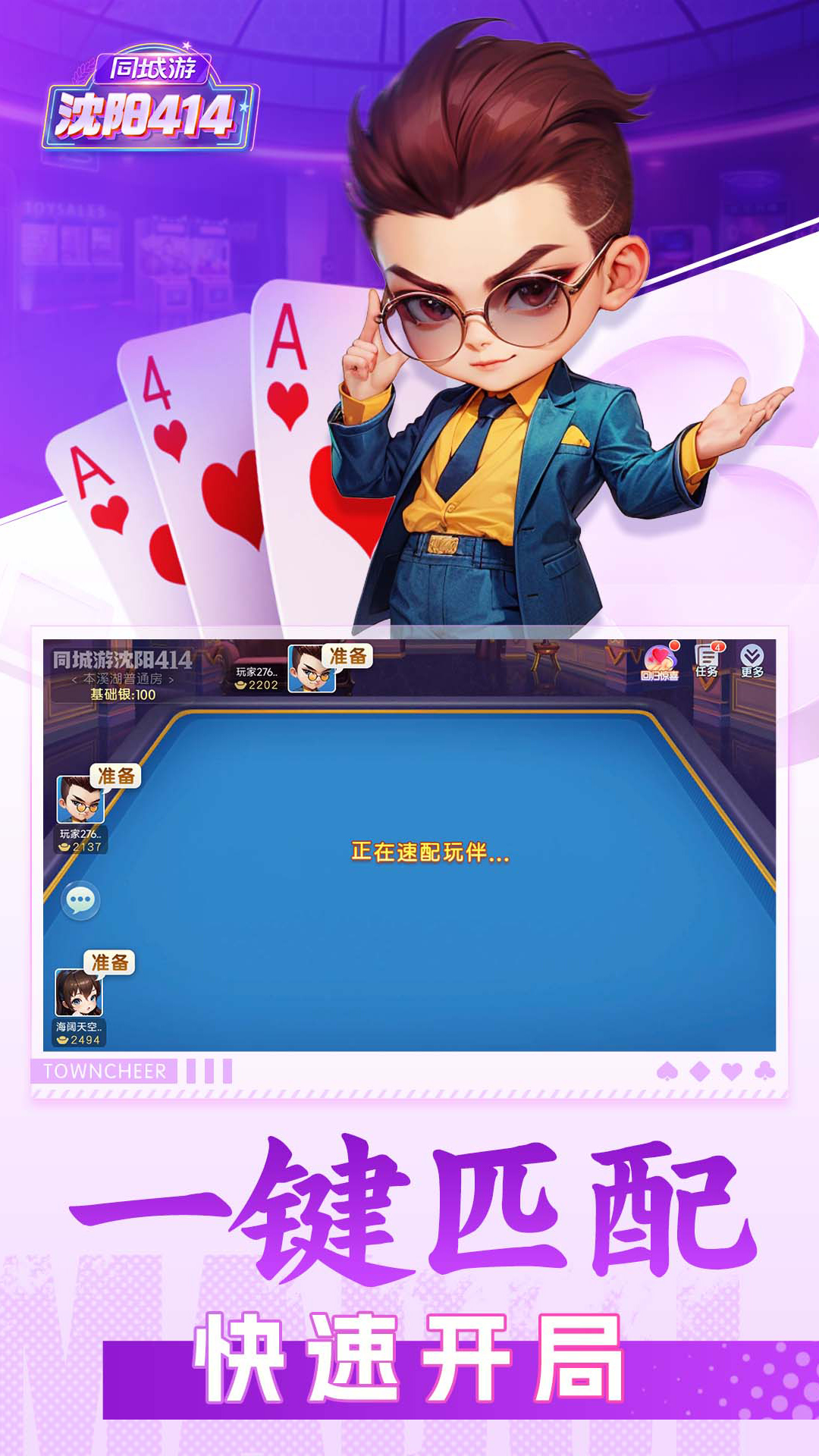 同城游沈阳414(窜火箭),根据沈阳当地的规则开发,更符合当地人的喜好。特殊的“勾”“叉”规则,4A4为最大的牌型。同城游沈阳414共1副牌,4位玩家,前两家14张牌,后两家13张牌,各自为战。