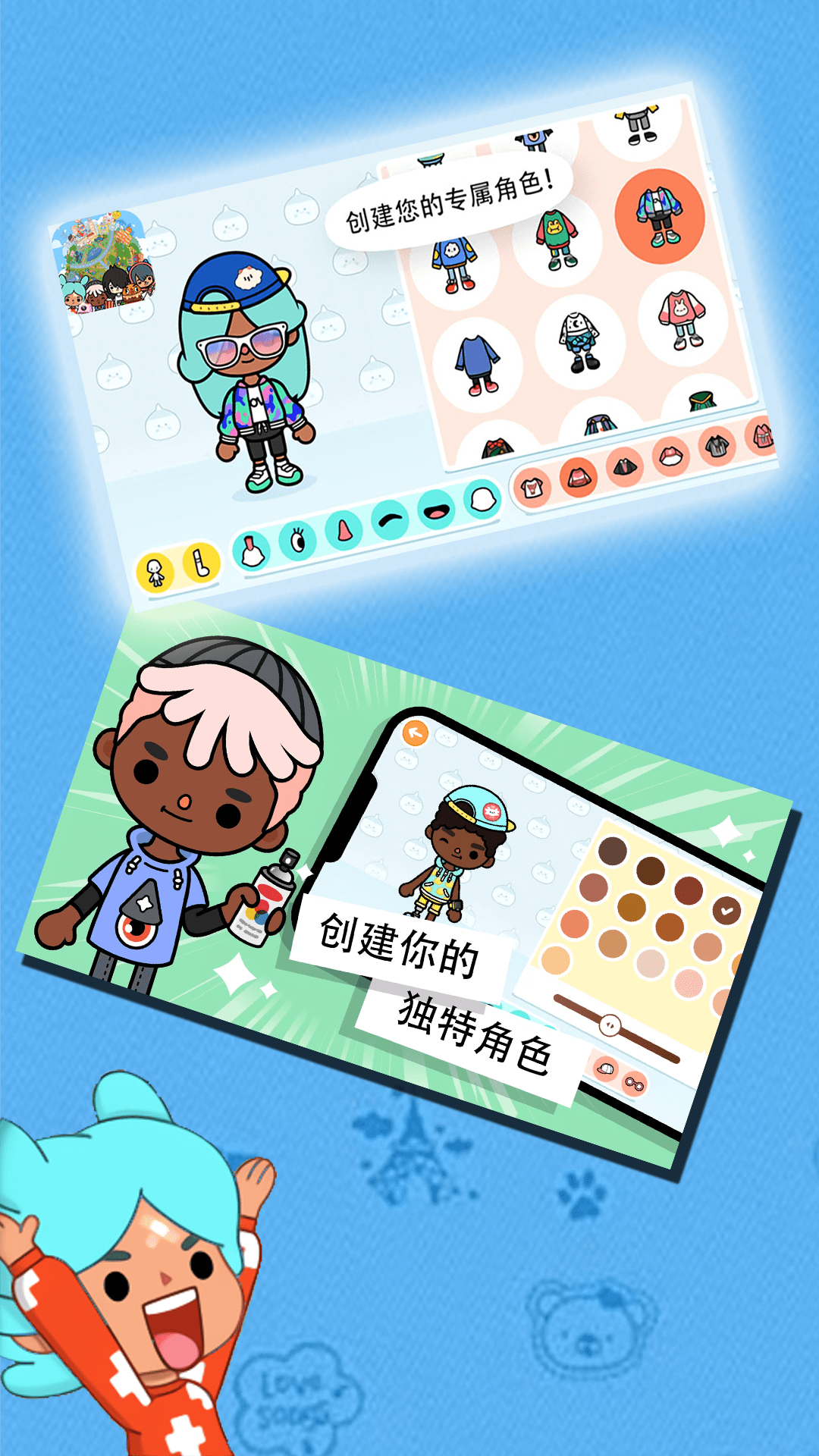 4.多达300多个角色供你选择,可以认识全世界的小伙伴,一起玩耍。