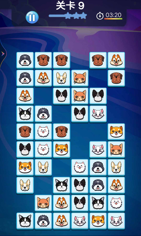 宠物连连看单机游戏属于益智休闲类游戏。游戏中,玩家要挑选一对相同的图案进行连线,不过这条连线需要在避开其他图案的情况下,其呈现的路径转弯次数不超过两次。如果满足这样的规定,就能消除这对图案从而得分。在每一局里,玩家得在规定时间内把所有图案都消除掉,只有完成这个任务,才可以进入下一关。这款游戏画面精致,充满了卡通趣味,玩法十分简单,操作也便捷,休闲性很强,各个年龄层的玩家都适合玩,快来体验吧!