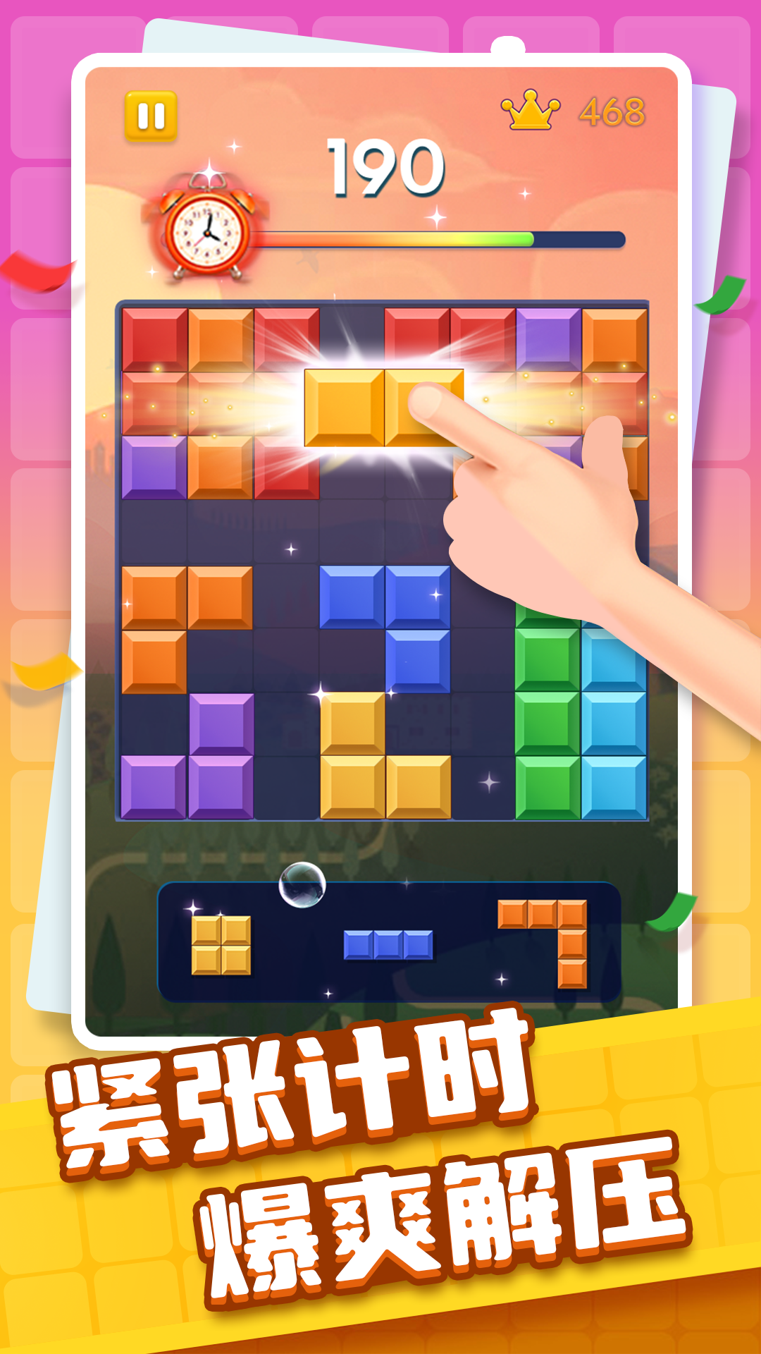 目前超火的经典方块消除游戏,相比于怀旧之作“俄罗斯方块”,此游戏无论在游戏体验还是效果上都让玩家感到舒适,游戏内融合了多种方块消除玩法,还可以分享给你的好友一起来玩! 玩法:将屏慕下方的三个方块拖入宫格中,一行或一列铺满即可消除。在确保后续方块可放的情况下,实现消除!变幻莫测的出块模式,营造出紧张刺激的消除体验!好玩根本停不下来 拖动各个形状的方块放入棋盘中,如果填满任意一行就可以产生消除,而连续消除会有额外加分。棋盘上再也无法摆下任意一个横竖组合的时候,游戏就会失败,游戏规则简单,但趣味无穷。玩转不一样的方块消除!