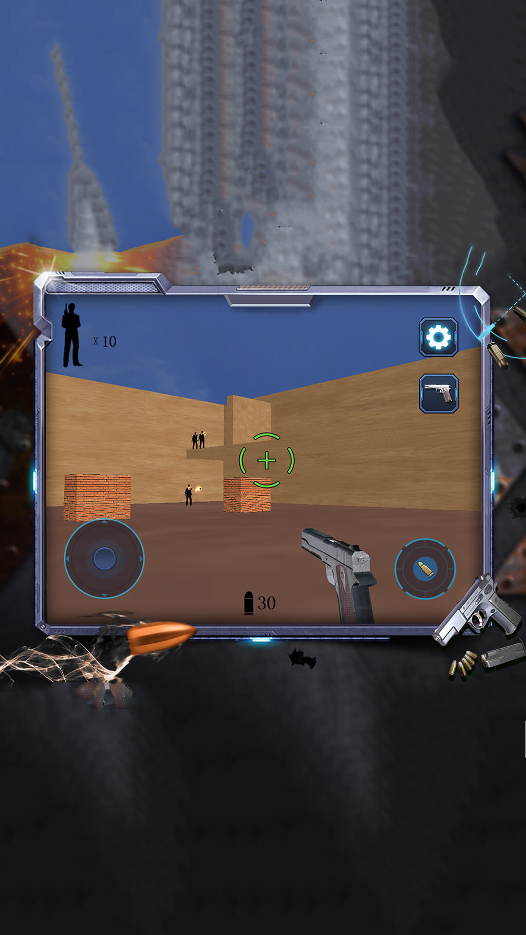 玩家在游戏中通过操控枪支的移动,一方面找准角度,另一方面攻击看准时机开枪,从而剿灭黑帮恶匪。消灭完场景中的敌人后,则获得胜利,同时获得相对应的金币奖励。玩家可以使用奖励的金币来购买新的枪支,从而提升杀伤力力,进一步带来更好的游戏体验。