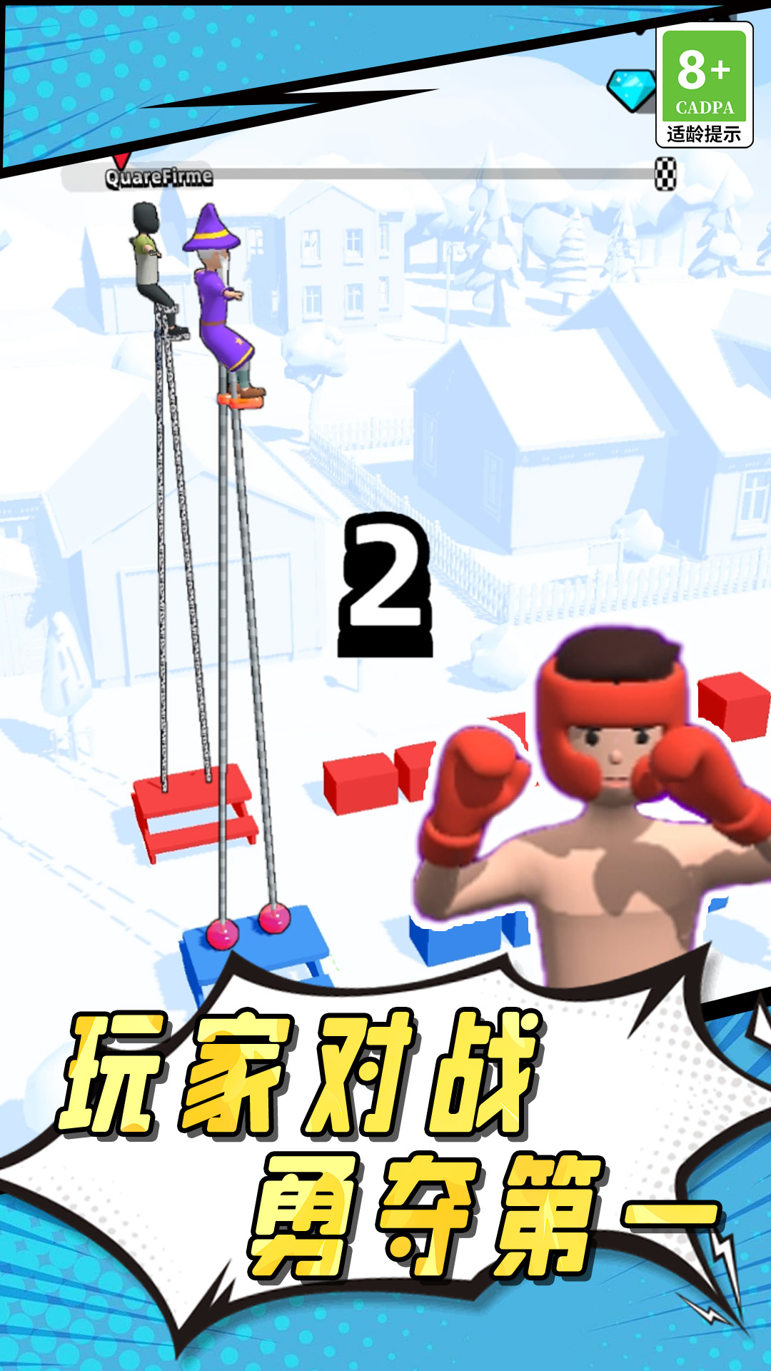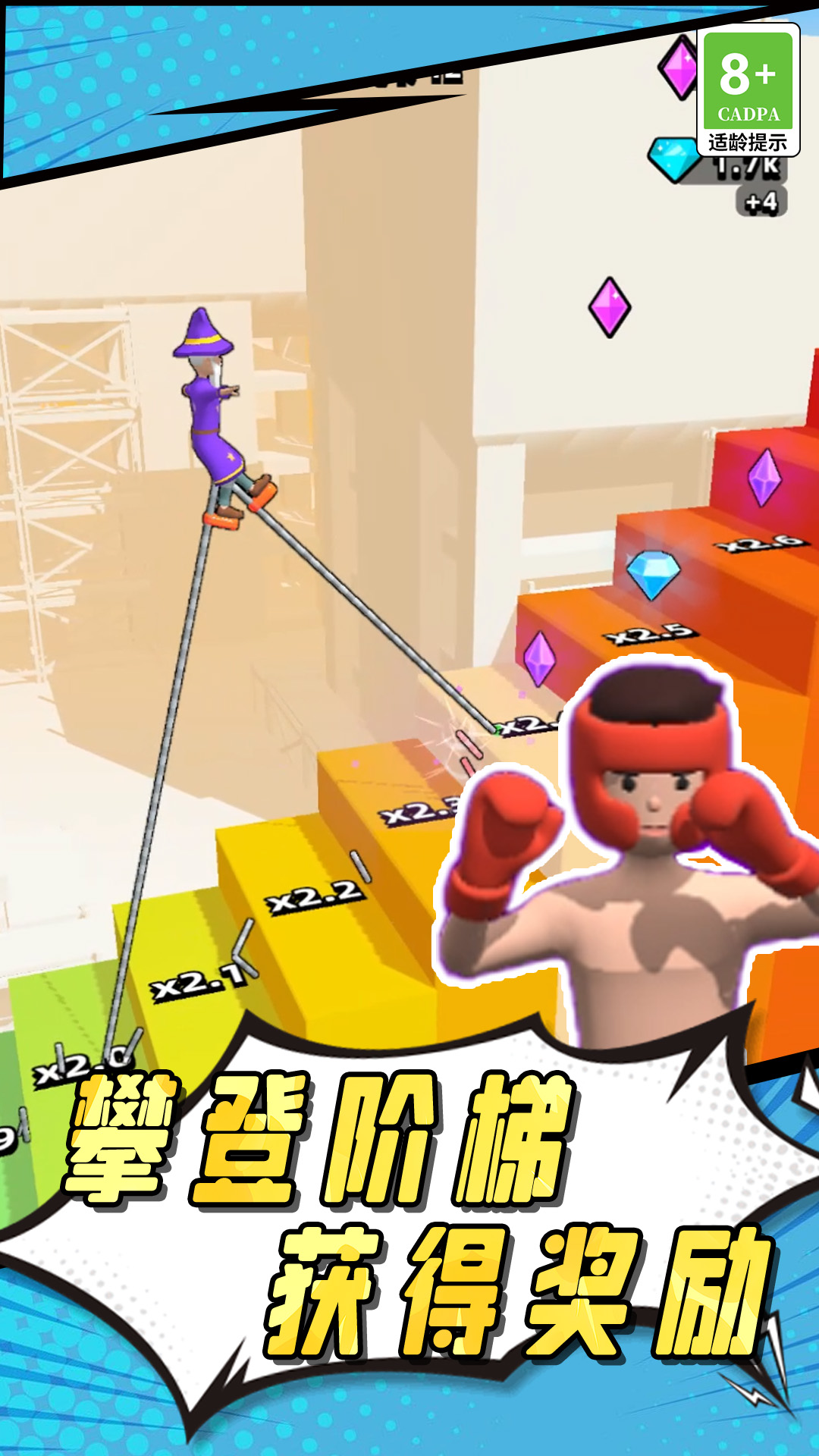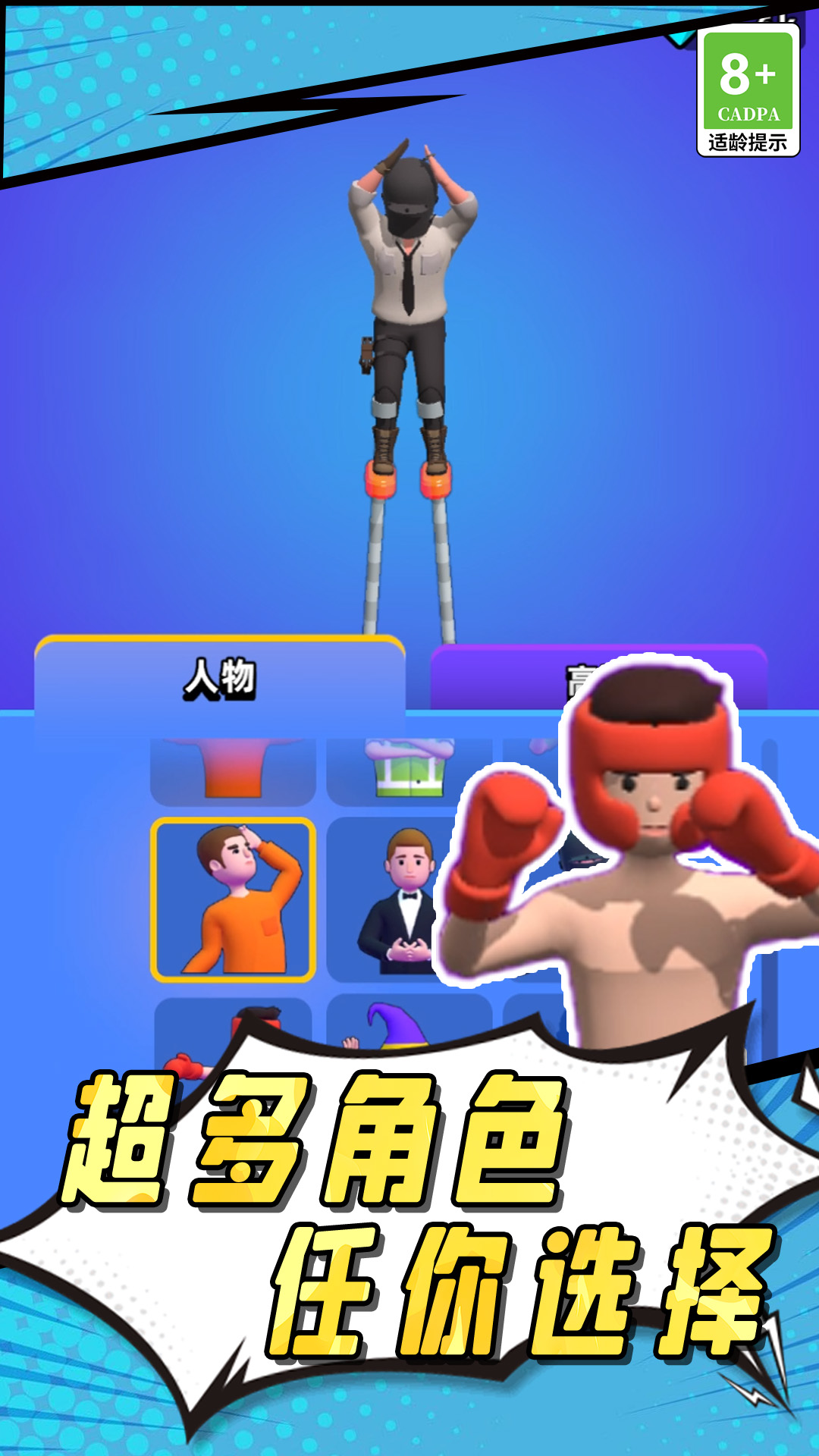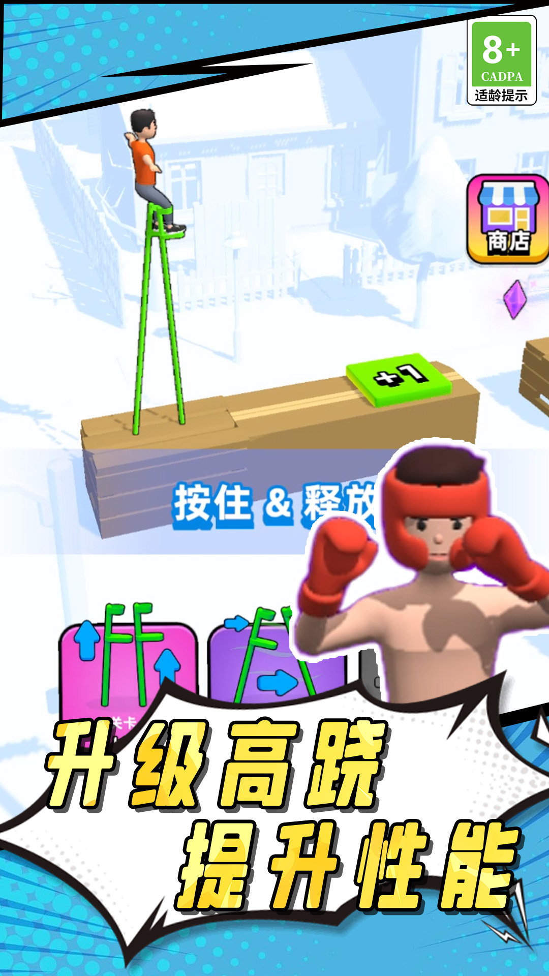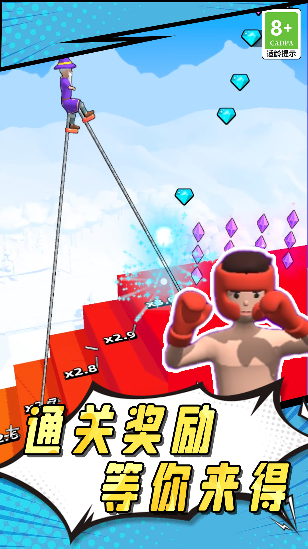 一款十分有意思的休闲益智高跷闯关竞赛玩法,在游戏中玩家使用高跷穿过障碍重重的关卡达到重点后利用高跷向上攀登跑酷,同时玩家需要收集木板来补充搭桥资源,看谁登顶!