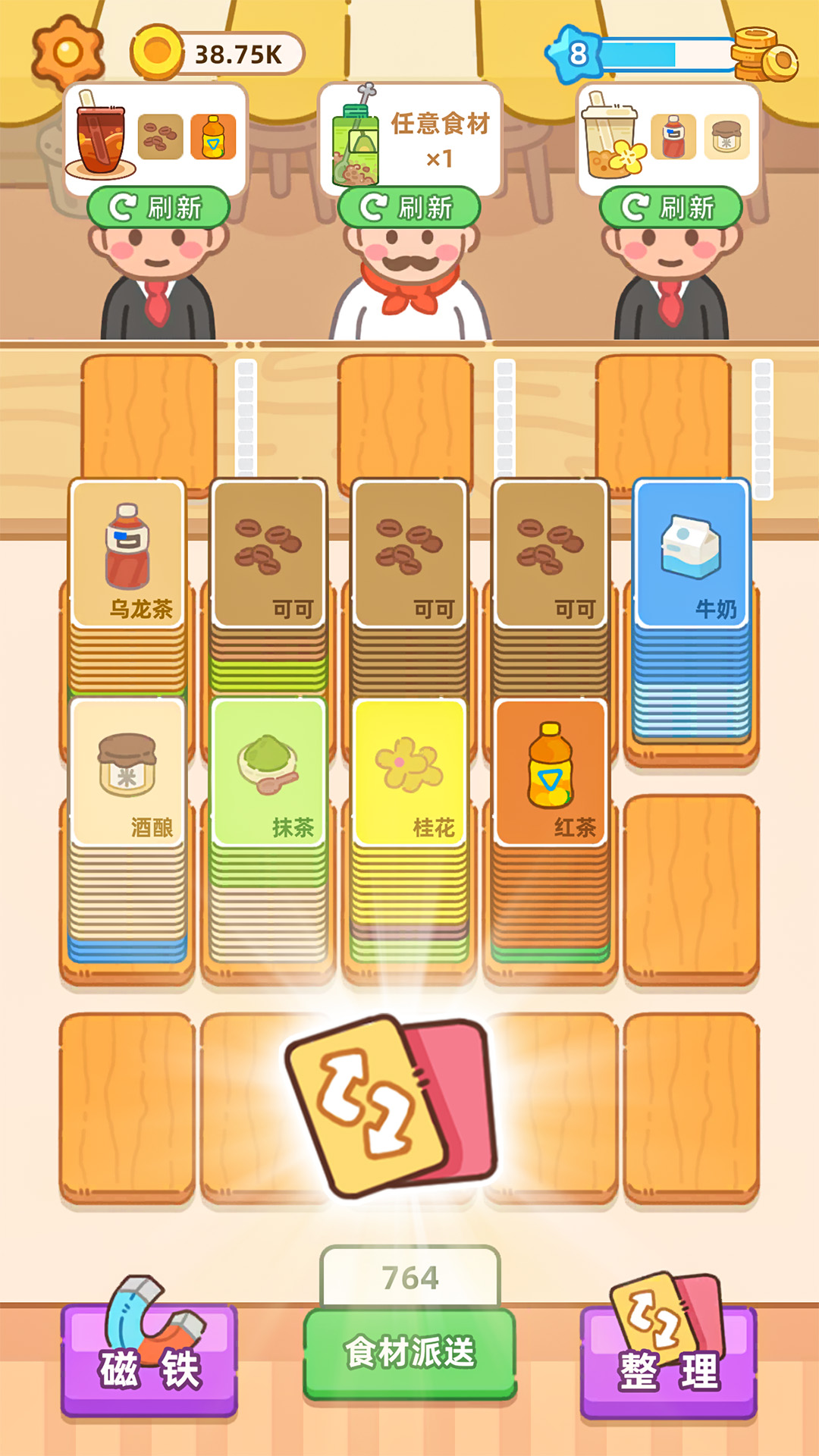 在这个可爱温馨的奶茶店里,根据订单需求,排序整理并提交正确的奶茶原料卡牌,制作出种类丰富的奶茶!