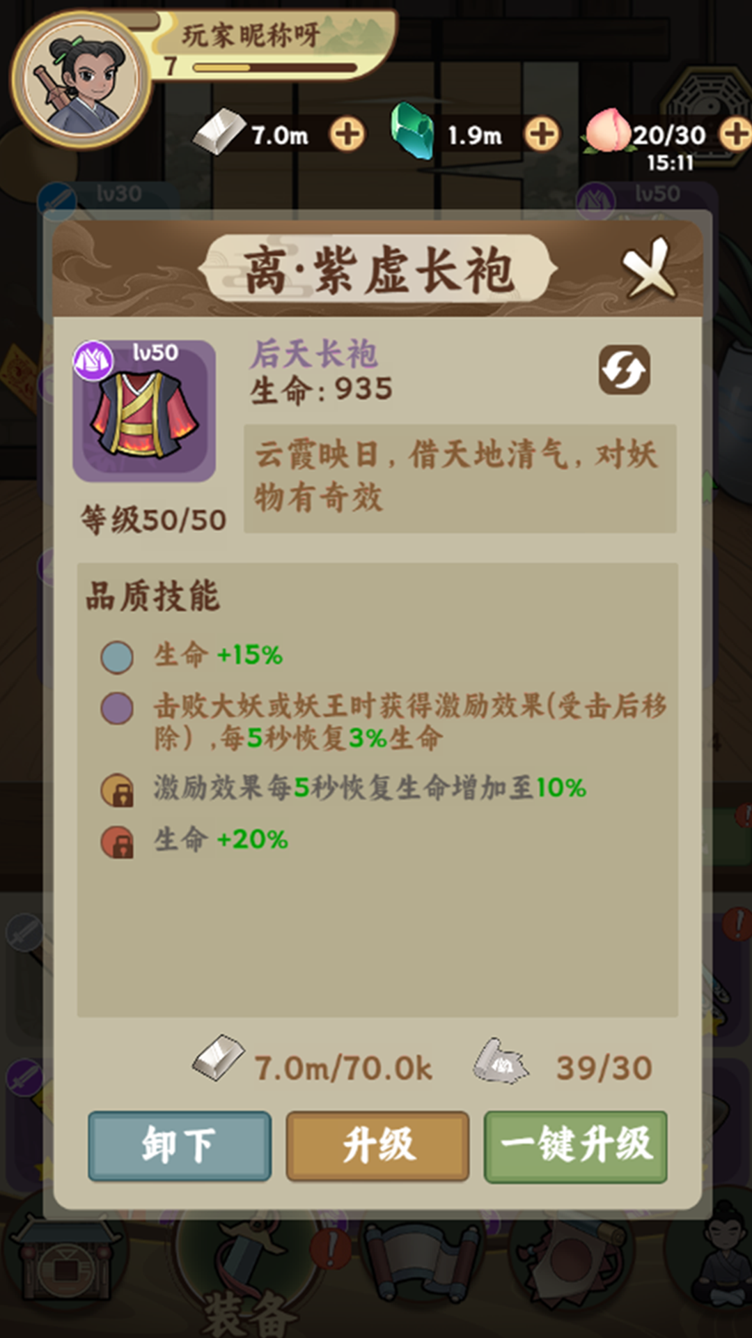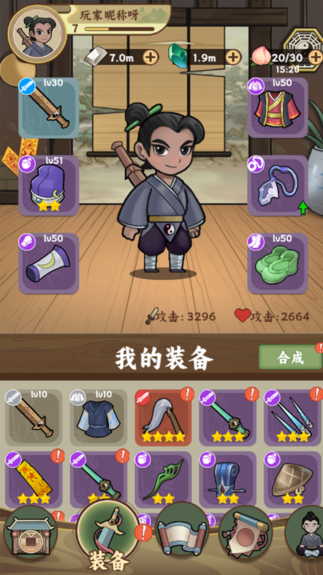 装备系统:一共有6个部位装备,武器、衣服、帽子、腰带、护腕、鞋子、项链。装备可以提升玩家的攻击力和血量,从而提高玩家在副本中的生存能力。