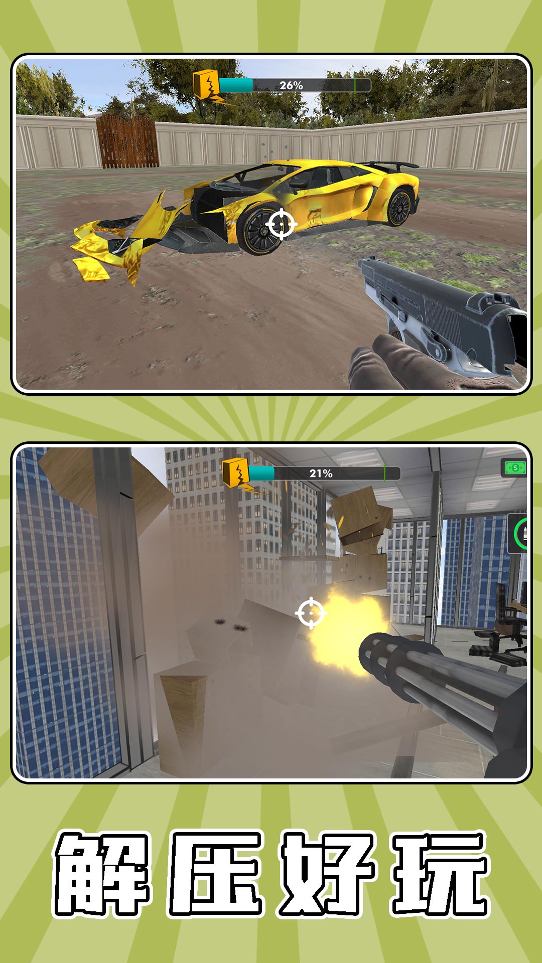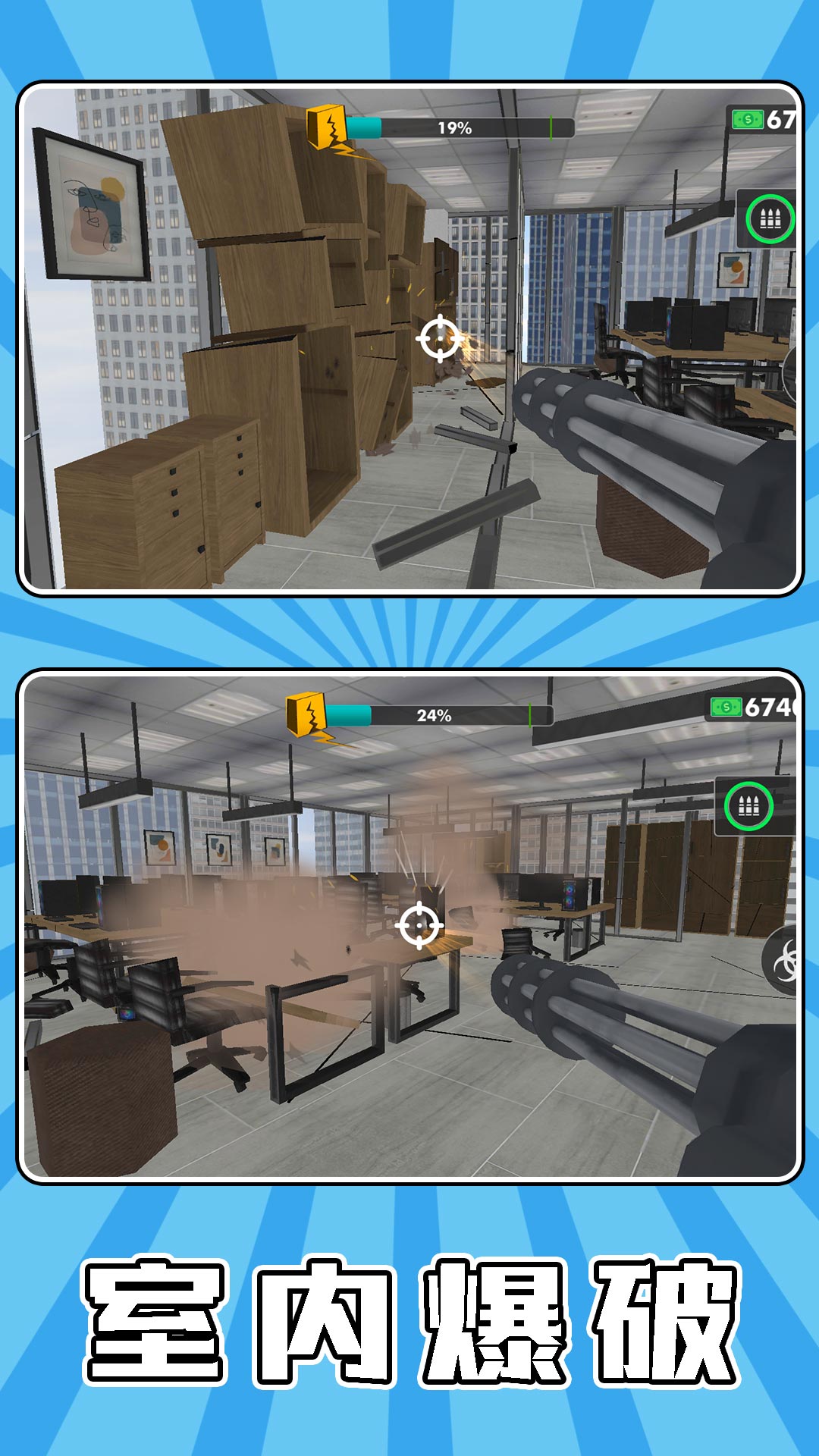 战场爆破求生是一款解压类型的休闲游戏,游戏中有多种武器可供使用,模拟使用武器攻击城市时。每个建筑物、建筑或车辆都根据物理规律粉碎。尽情体验游戏快乐,释放压力。游戏好玩有趣,画风优美,操作简单,快来下载体验吧