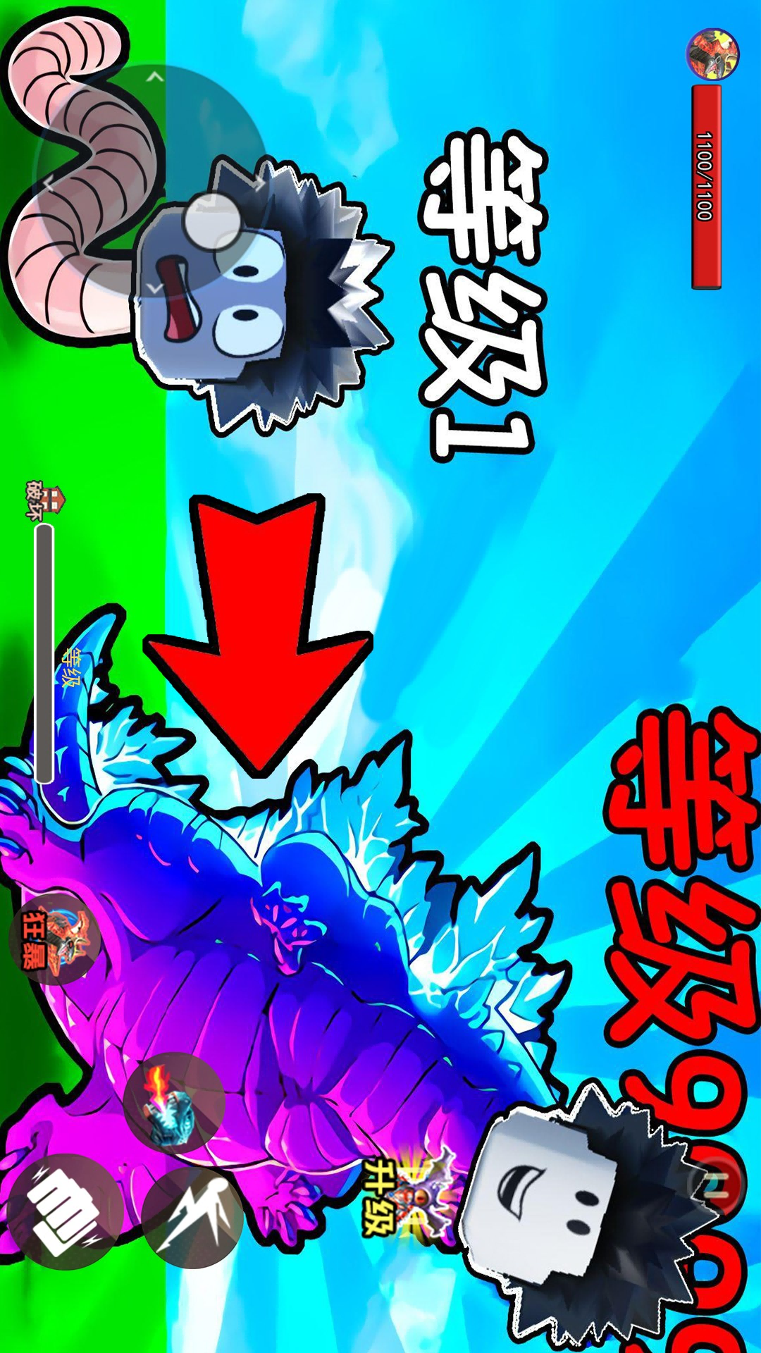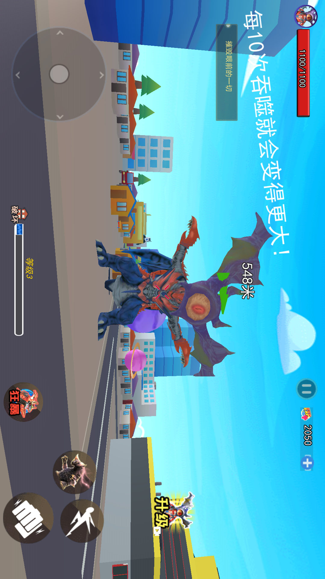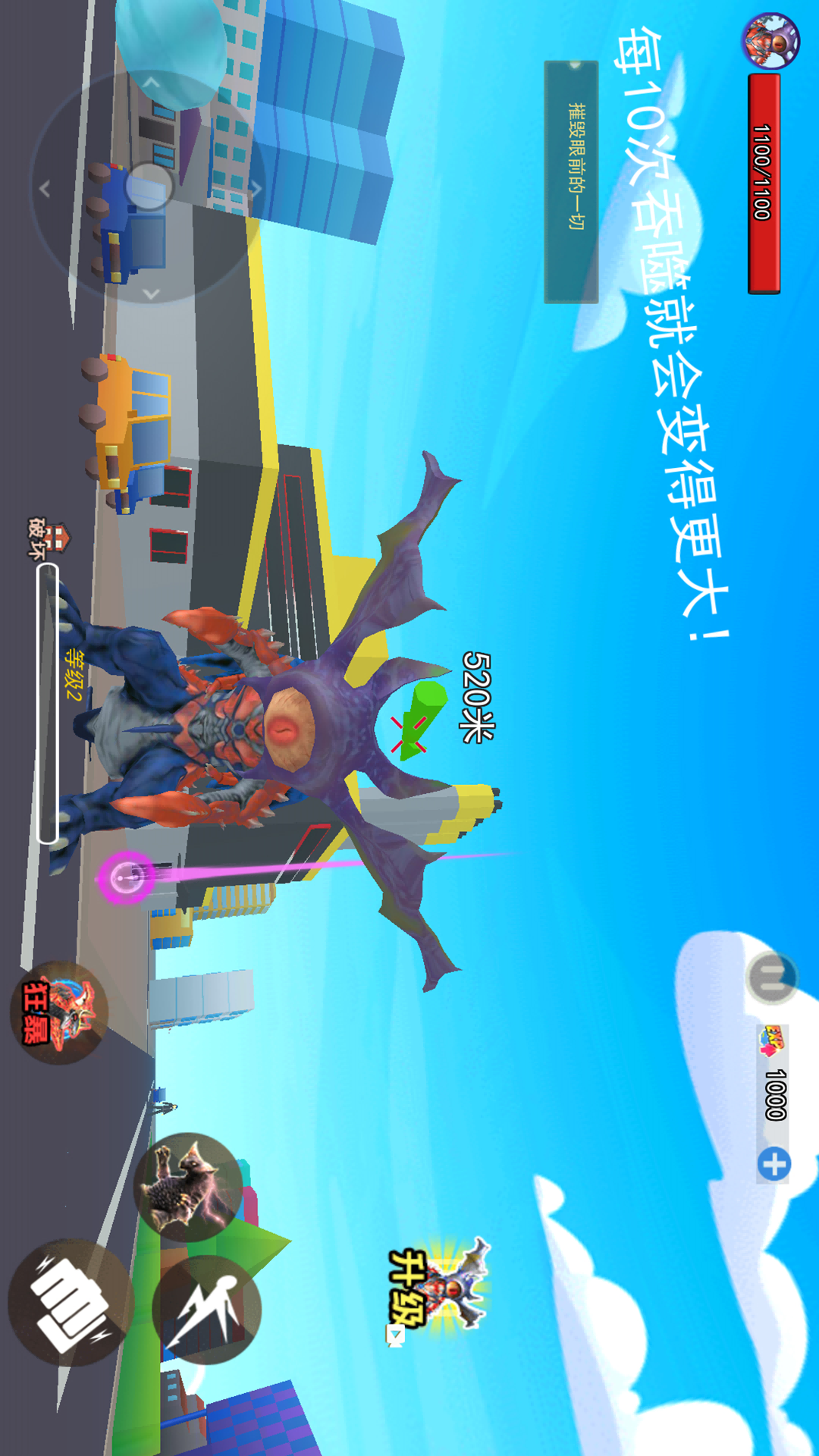 《地球毁灭怪兽来袭》是一款动作冒险游戏,游戏中你将操控一只弱小的怪兽,通过不断地吞噬或者打败敌人破坏道具来获取进化能量,当你的能量充足时就可以变大进化。