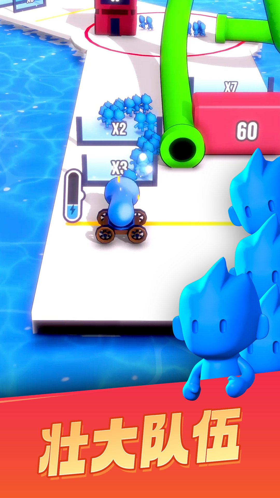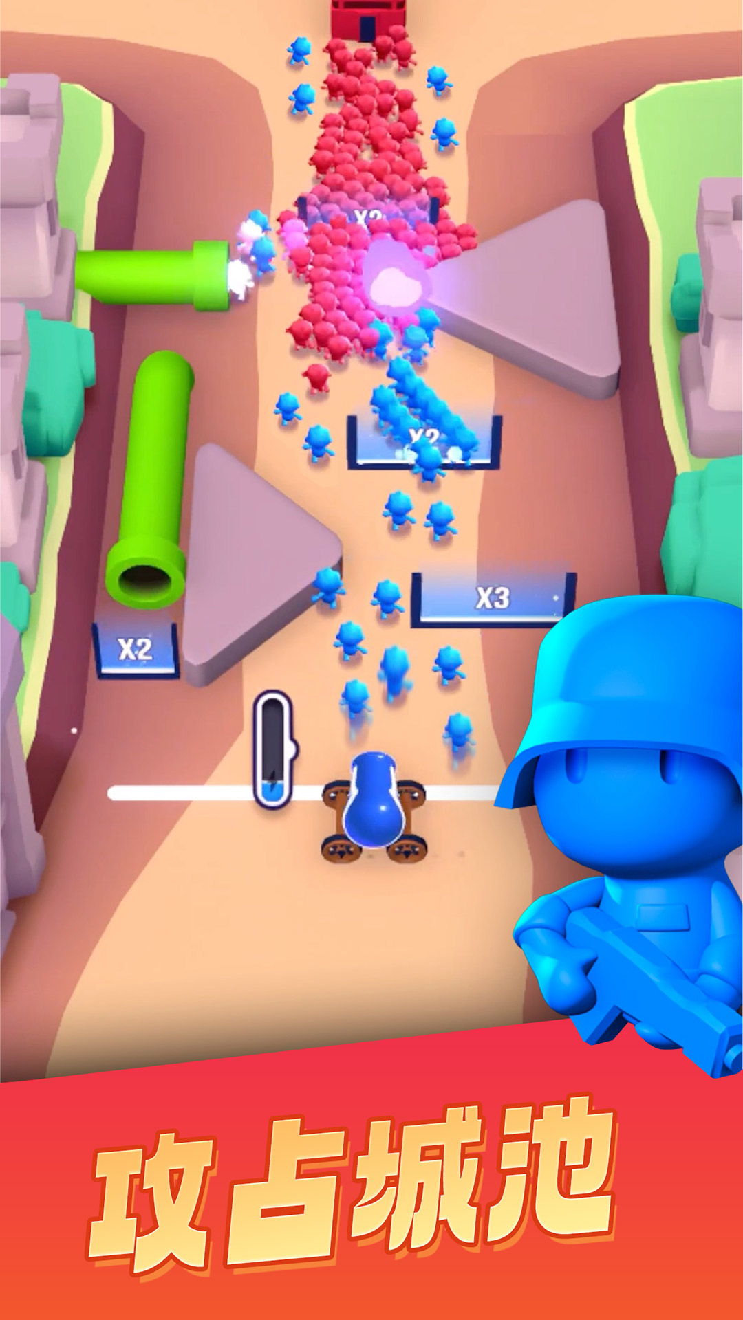 每个玩家都可以利用大炮等武器喷射大量的士兵,并带领这些士兵进攻敌人获取胜利。但这不仅是一场简单的行动,而是一次真正意义上的挑战:行动路线中会出现各种不同形式并且会变换的倍增门,帮助玩家增加士兵,并且也会有一些障碍物消耗士兵,迫使玩家随时作出明智的决策,才能保持领先优势。