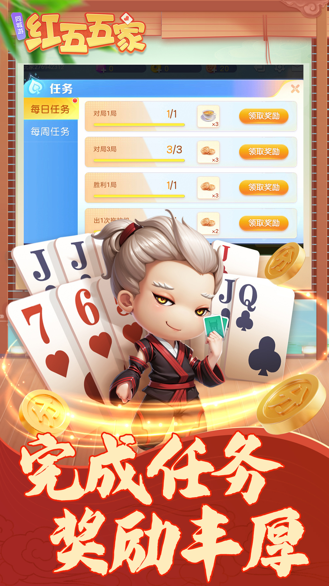 红五五家是一种扑克牌游戏,属于同城游升级类扑克牌类型,一般情况五位玩家参与游戏,在台州黄岩及浙江各地都较为受欢迎。红五五家级牌永远打2,且红五最大。每一轮由第一个亮牌的玩家坐庄。在叫主结束后,庄家抓进7张底牌,再选出7张不要的牌扣下。埋下底牌后,底牌只能由庄家查看,且不能更改。庄家出牌前指定A、K、红桃五、大王中得一张来寻找伙伴。第一轮牌由庄家方首先出牌,按逆时针顺序轮流出牌,以后每轮牌都由前轮获胜方首先出牌。玩家可出的牌型有单张、对子、三条、二拖拉、三拖拉、带柄拖拉、甩牌。各方都出牌后,计算获胜方,下一轮牌由获胜方首先出牌。首家甩牌,则需要优先跟同花色的相同牌型的牌。没有同花色的牌则可以垫牌,毙牌。所有人出完牌时,游戏结束,在出最后一回合牌时,如果是抓分方获胜,则底牌被“抠底 ”。底牌中的分乘以2计入闲家抓分。