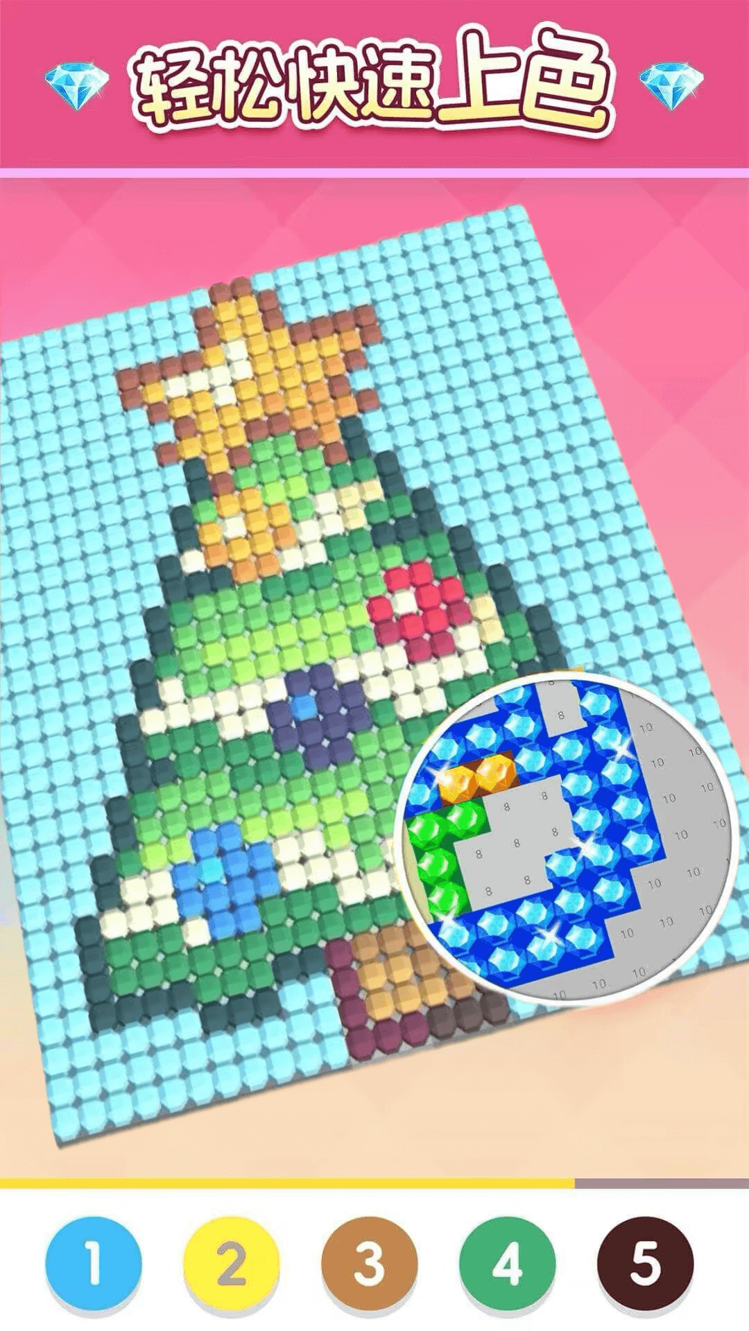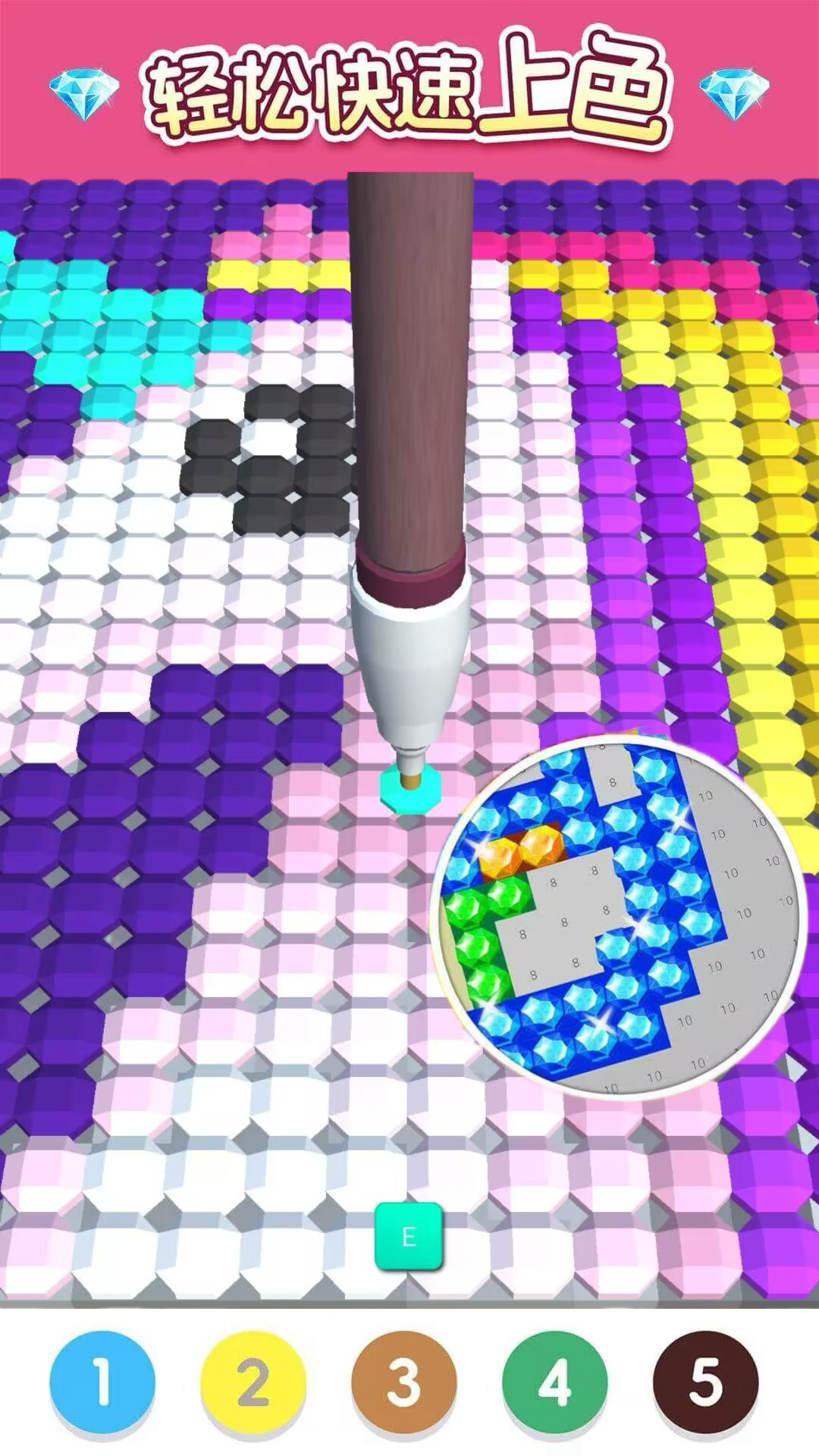 只需依照数字操作和涂色,可快可慢,体验刺激的过程,给钻石找到合适的位置时,感受“咔哒”声带来的快意。每次完成涂色,欣赏自己精彩纷呈的杰作。