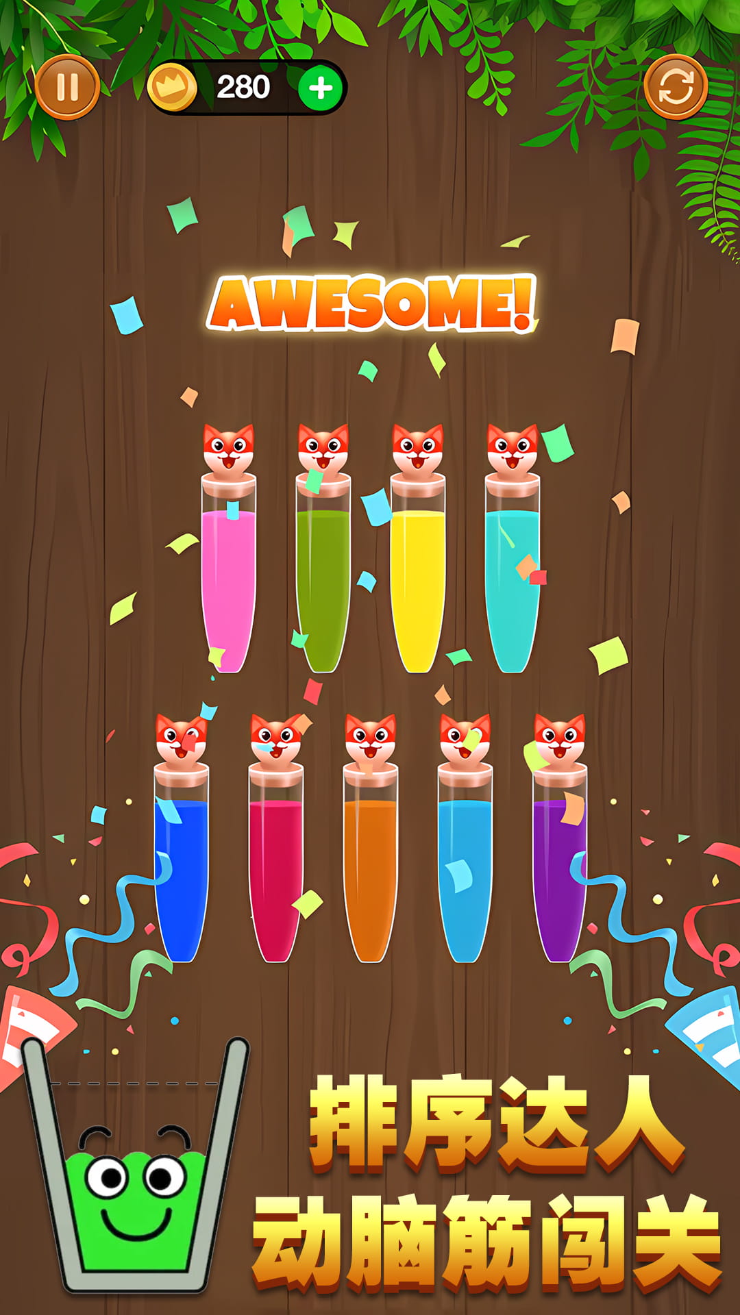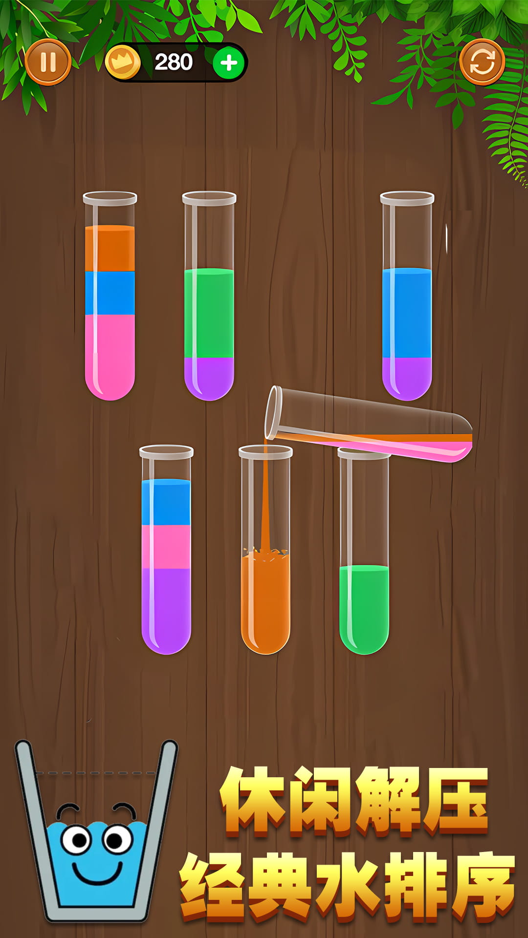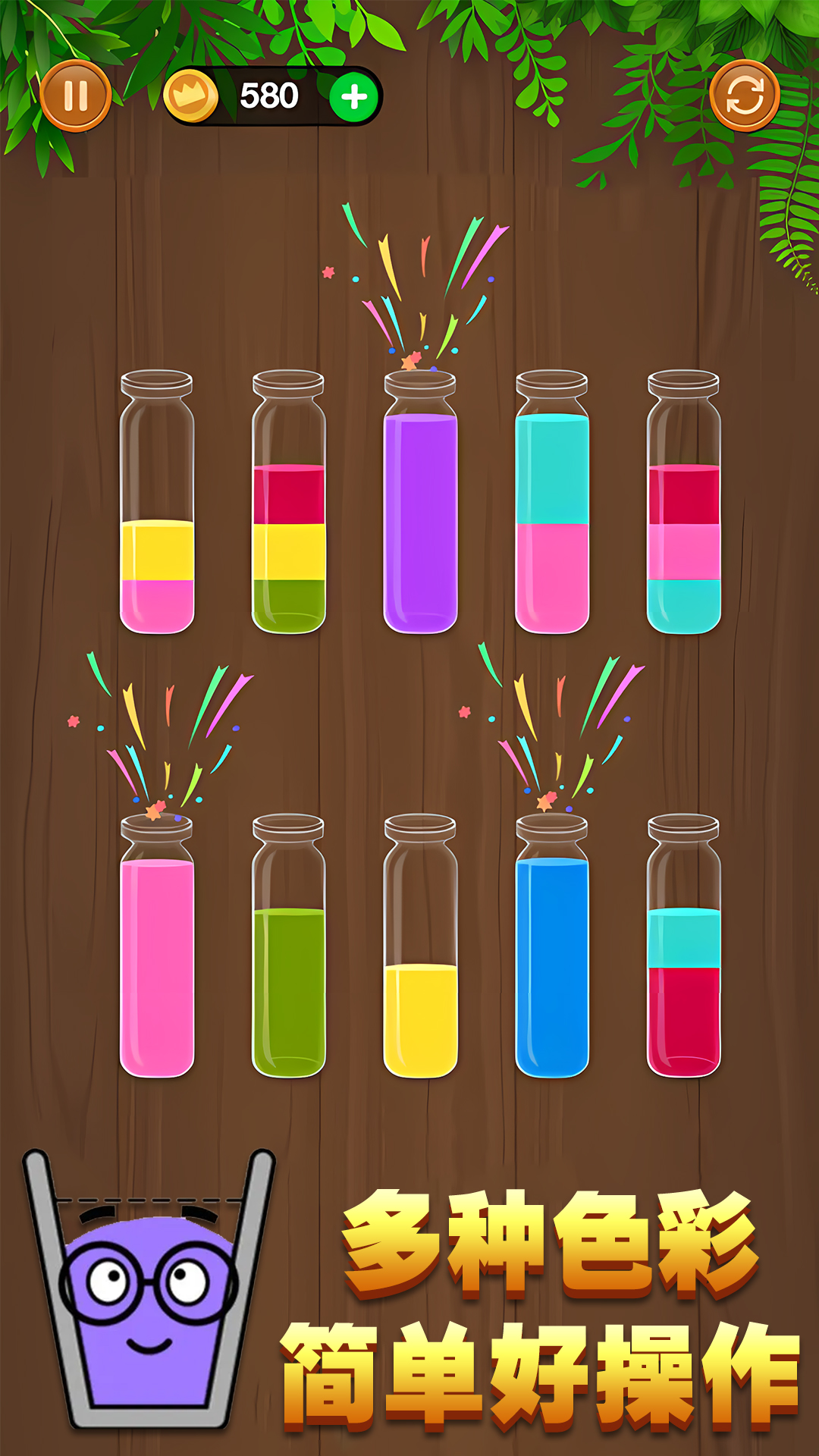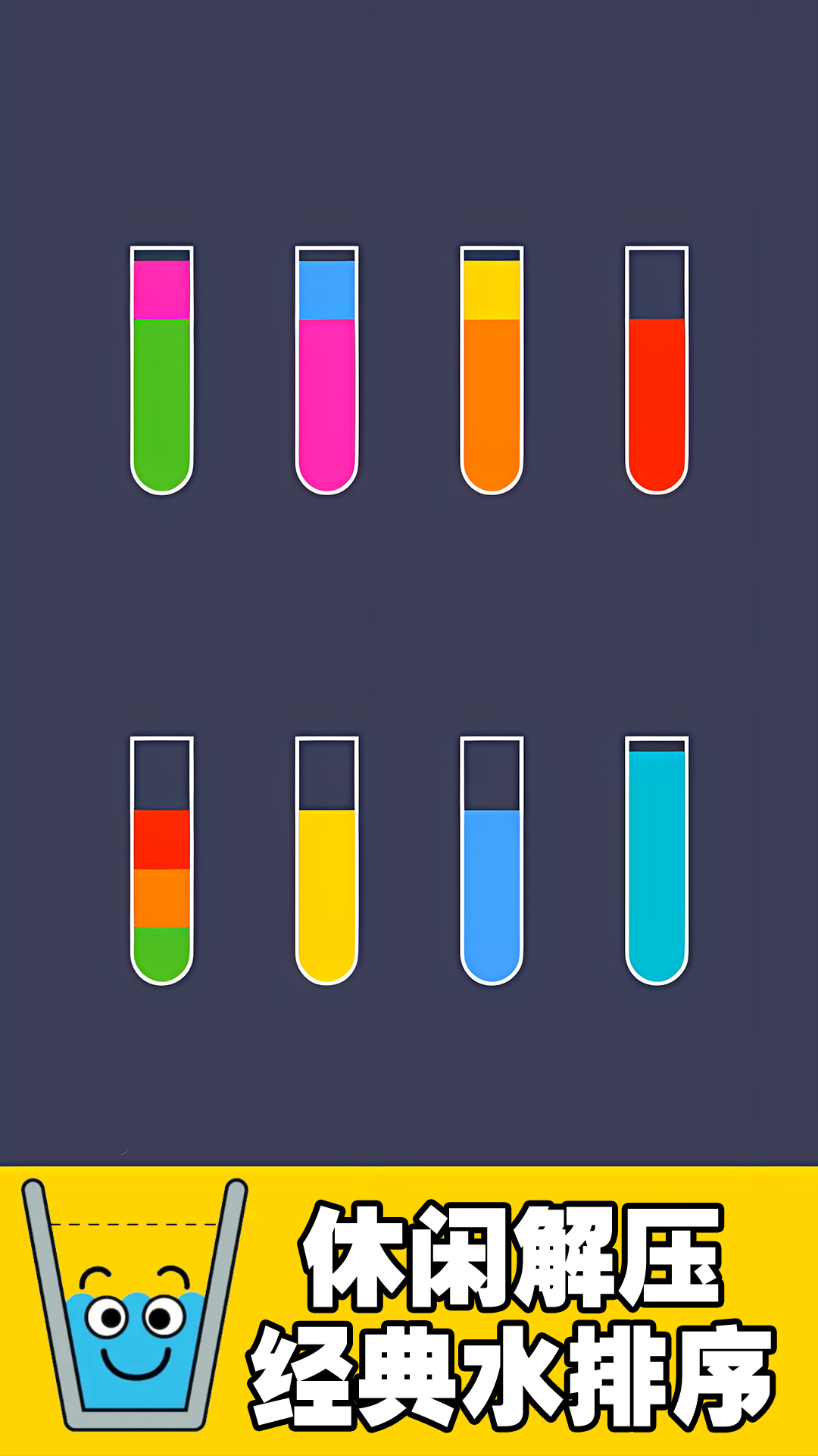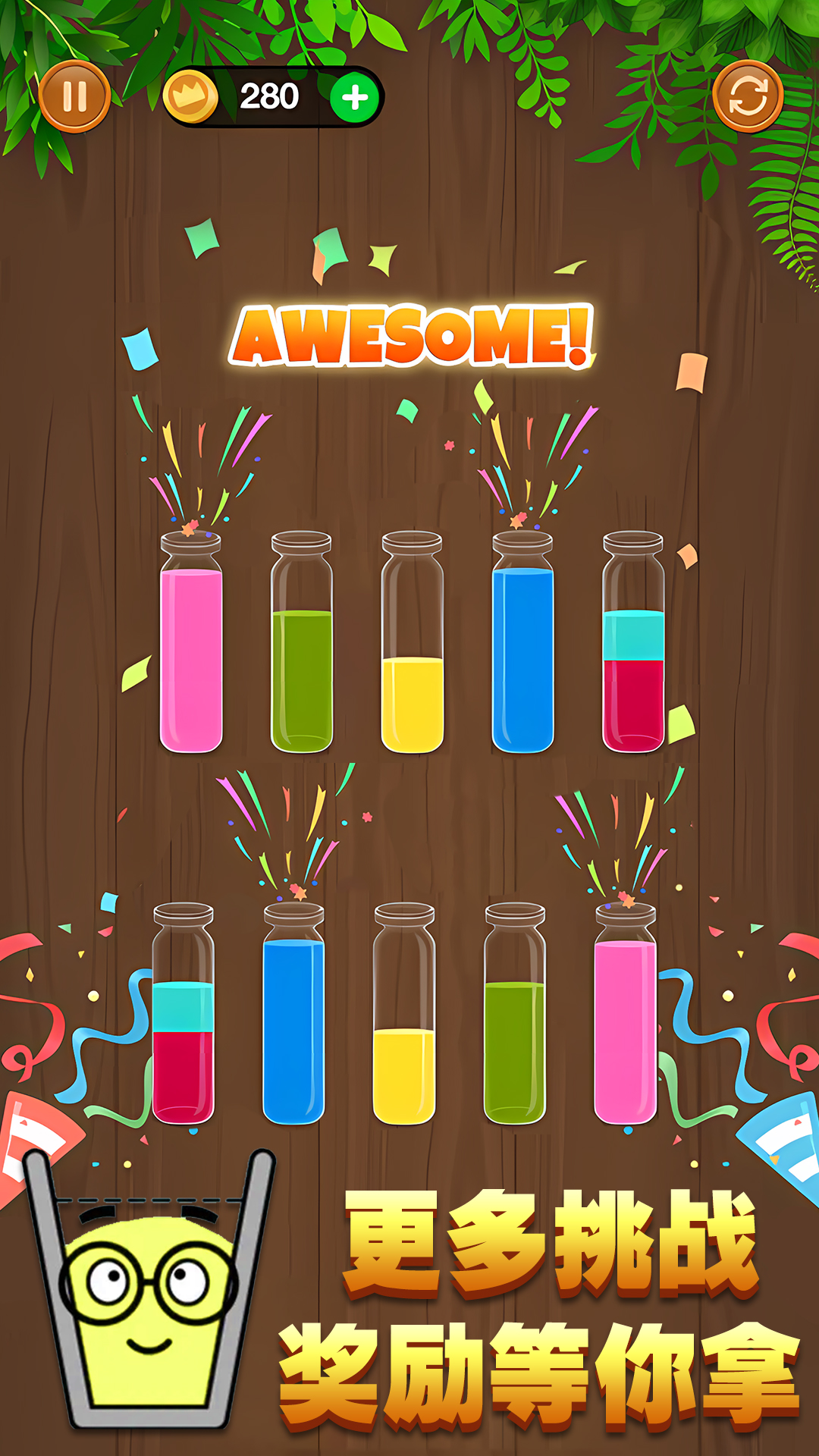 随着游戏的进行,关卡难度逐渐升级,水的颜色种类增多,杯子的数量和形状也变得复杂多样。您需要充分发挥自己的智慧和耐心,解决一个又一个的难题。