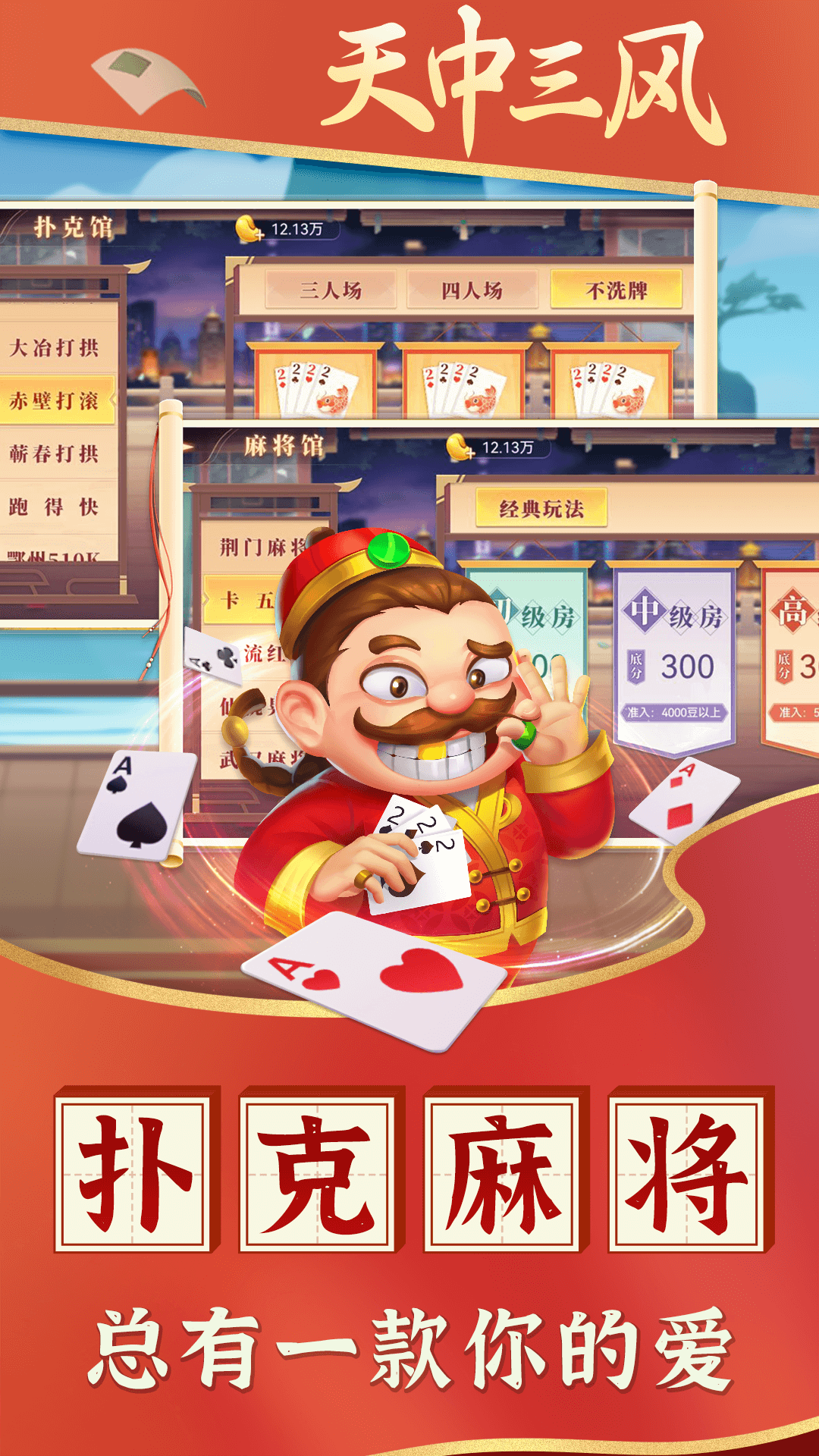 《天中三风》集合了湖北各地麻将、扑克玩法,武汉麻将,血流红中,晃晃,斗地主,卡五星,真人2v2,打拱,五十K等多种玩法任你选择!