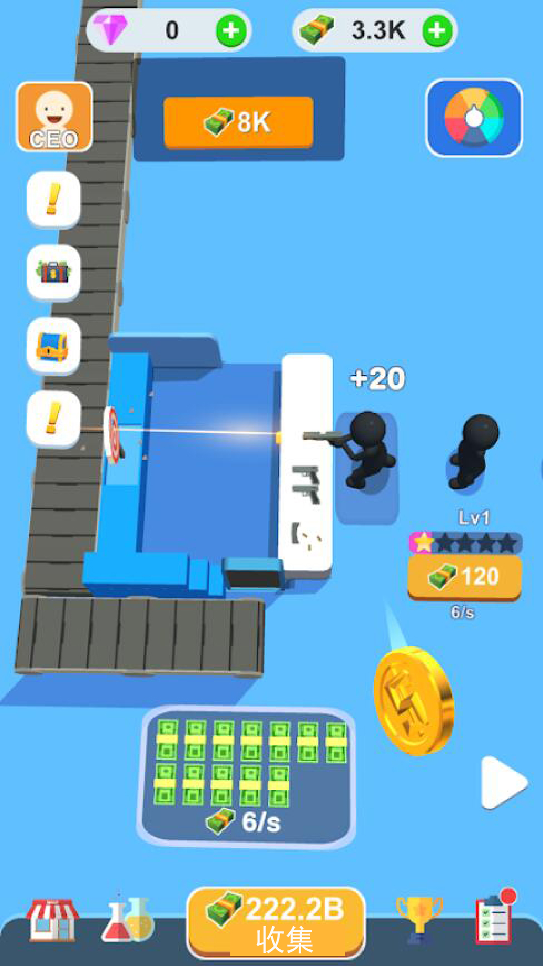 从一个射击目标开始。吸引客人体验射击。您可以从中受益。用收入升级射击目标,为客人提供更好的体验。然后你可以购买一些新的目标来扩大你的商店。不断扩展,直到您成为射击场大亨。