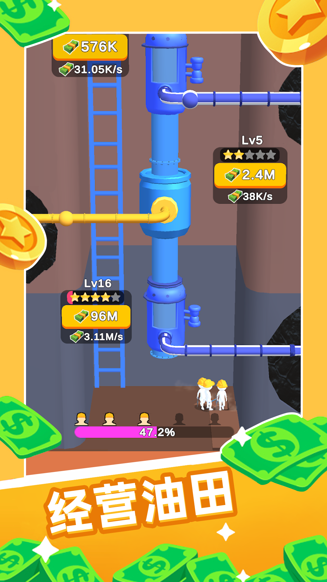 这是一款模拟经营的游戏,在这里你经营着一家石油公司。你很幸运地在沙漠中找到了一个油田。现在让设备开始工作,为你挖出石油。源源不断的石油意味着财富。你可以不断升级你的设备,让它们更有效率,还可以雇佣工人为你工作,获得更多财富。积攒足够的财富,可以扩大你的工厂,将你的油井挖到心脏地带。快来扩大你的石油帝国吧!