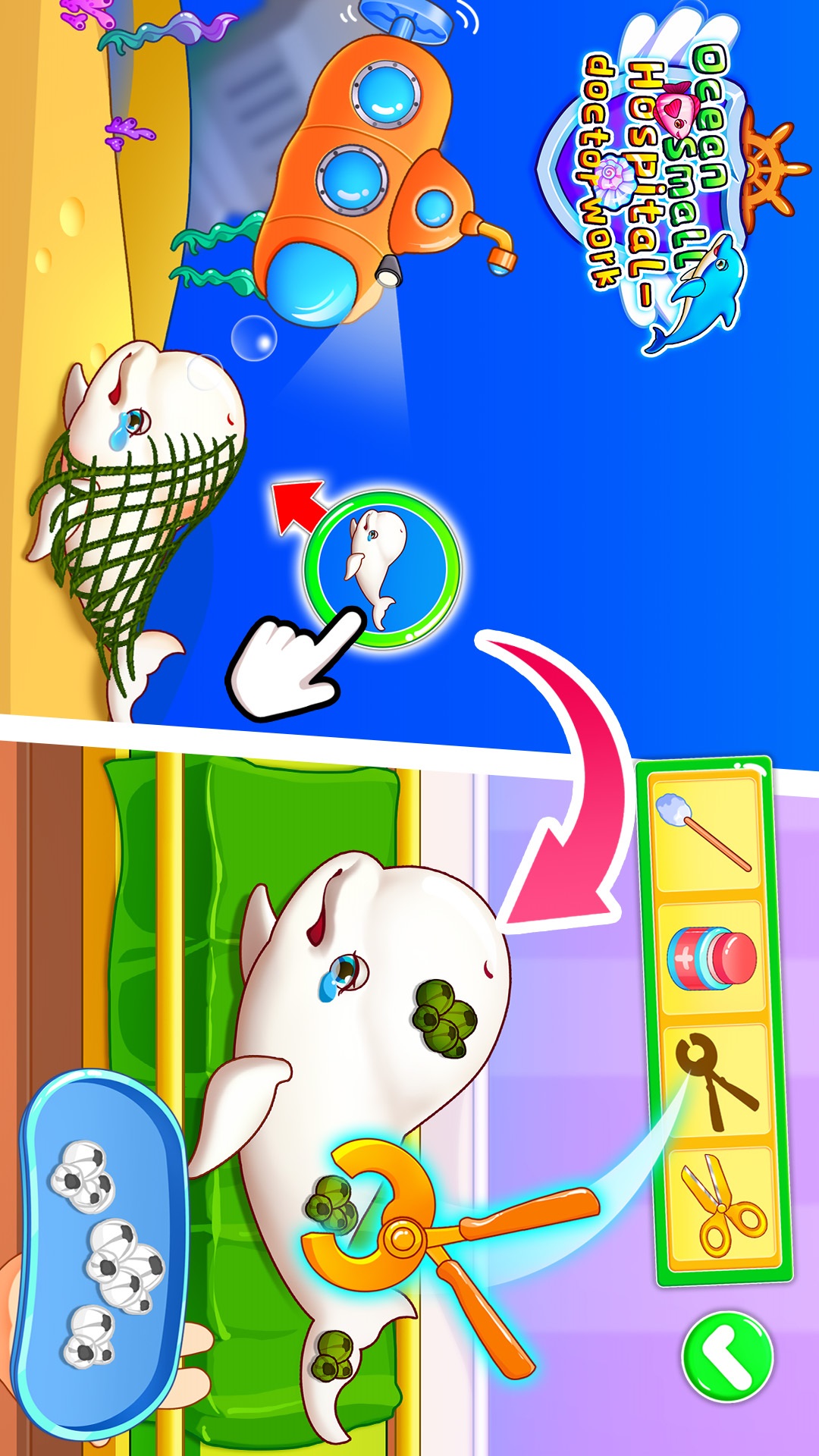 发现受伤的小动物要及时治疗哦,驾驶潜艇,跟随地图上的动物图标,就可以找到小动物的搜救地啦。快看,原来是一只小海豹被海草困住了,快来帮它把海草剪掉,让小海豹自由的在海底遨游吧。