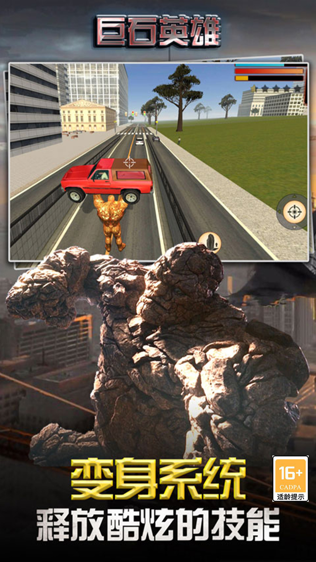 巨石英雄是一款以超级英雄为主题打造的沙盒城市冒险游戏,在游戏中玩家在游戏中扮演一个可以随时变身的巨人,外表覆盖橙色的石头,拥有无穷的力量和抗击打能力,可以摧毁一切物体和敌人。