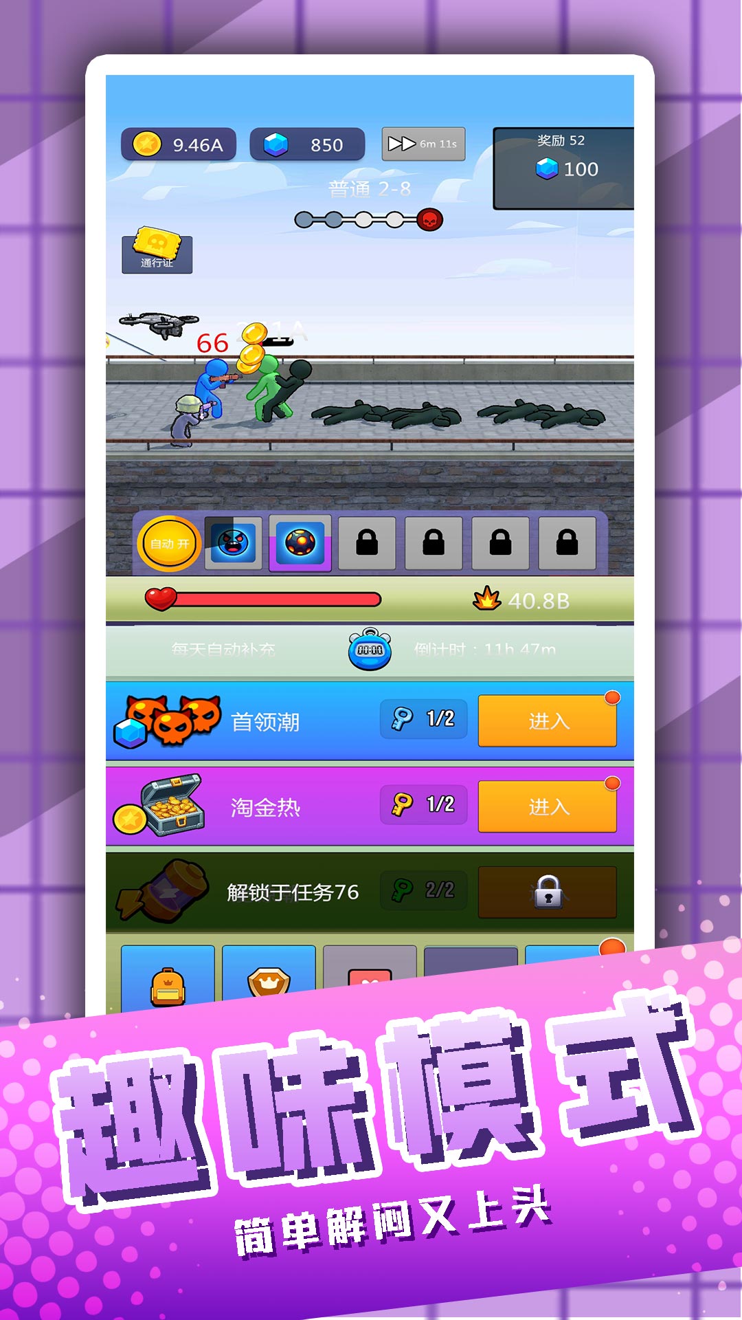 《一冲飞天火柴人》一款永不停止的现代射击战斗游戏,玩家通过控制游戏中的火柴人来躲避敌人的射击,直到打败对手,不仅能够提高玩家的技巧,还能选择多种炫酷枪械,解锁火柴人的皮肤品种,关卡进行的越高,角度也会越来越奇葩,考验玩家技术的时候也就到来了。