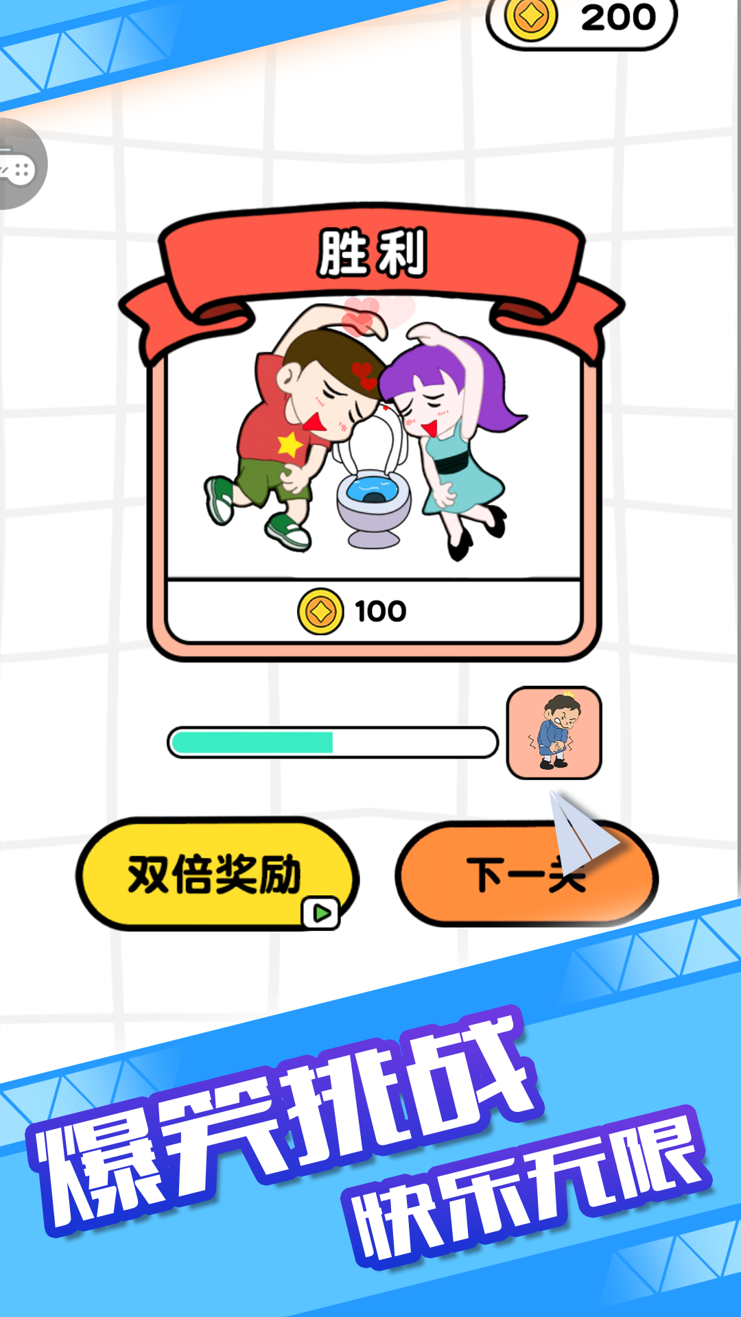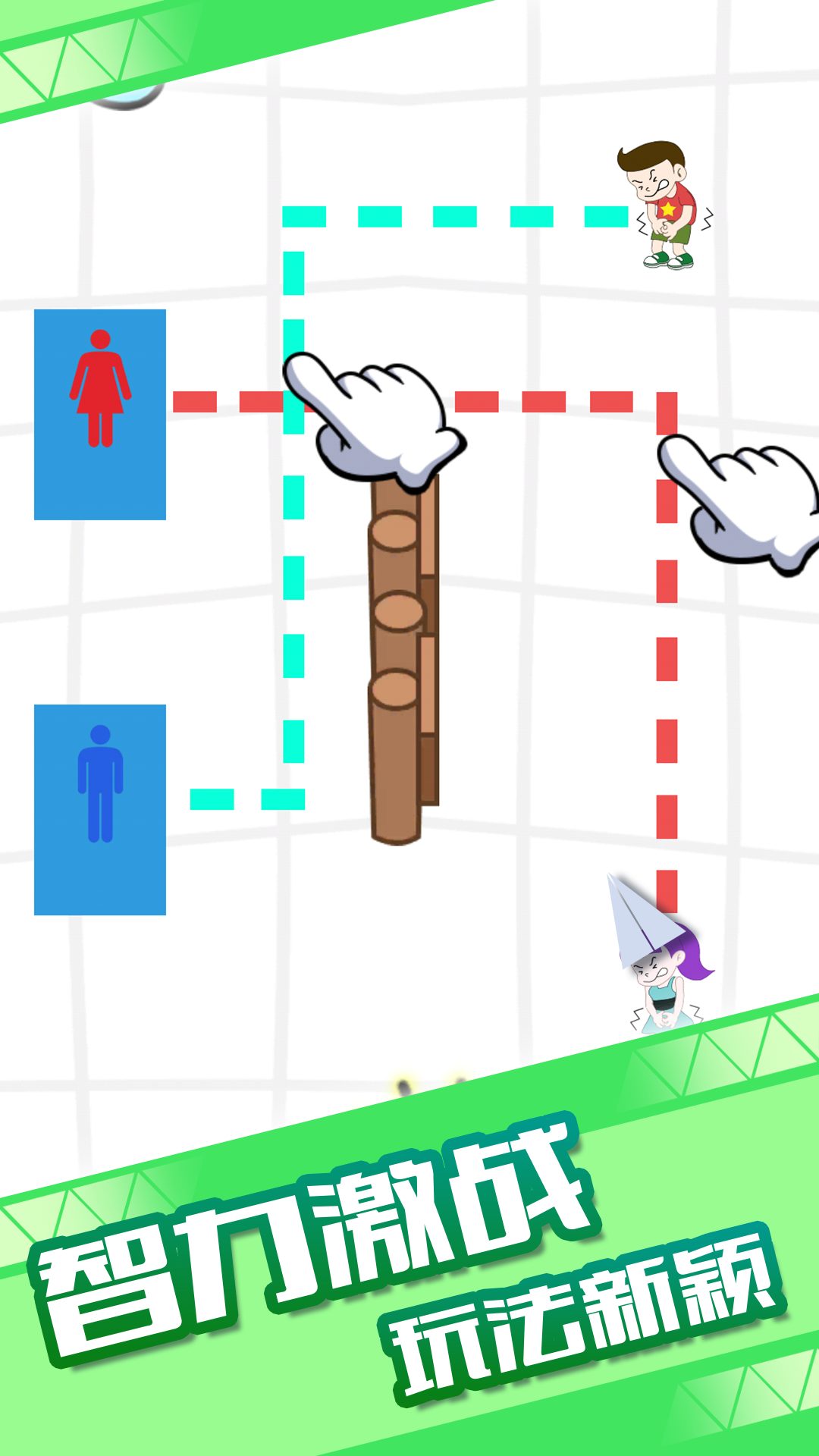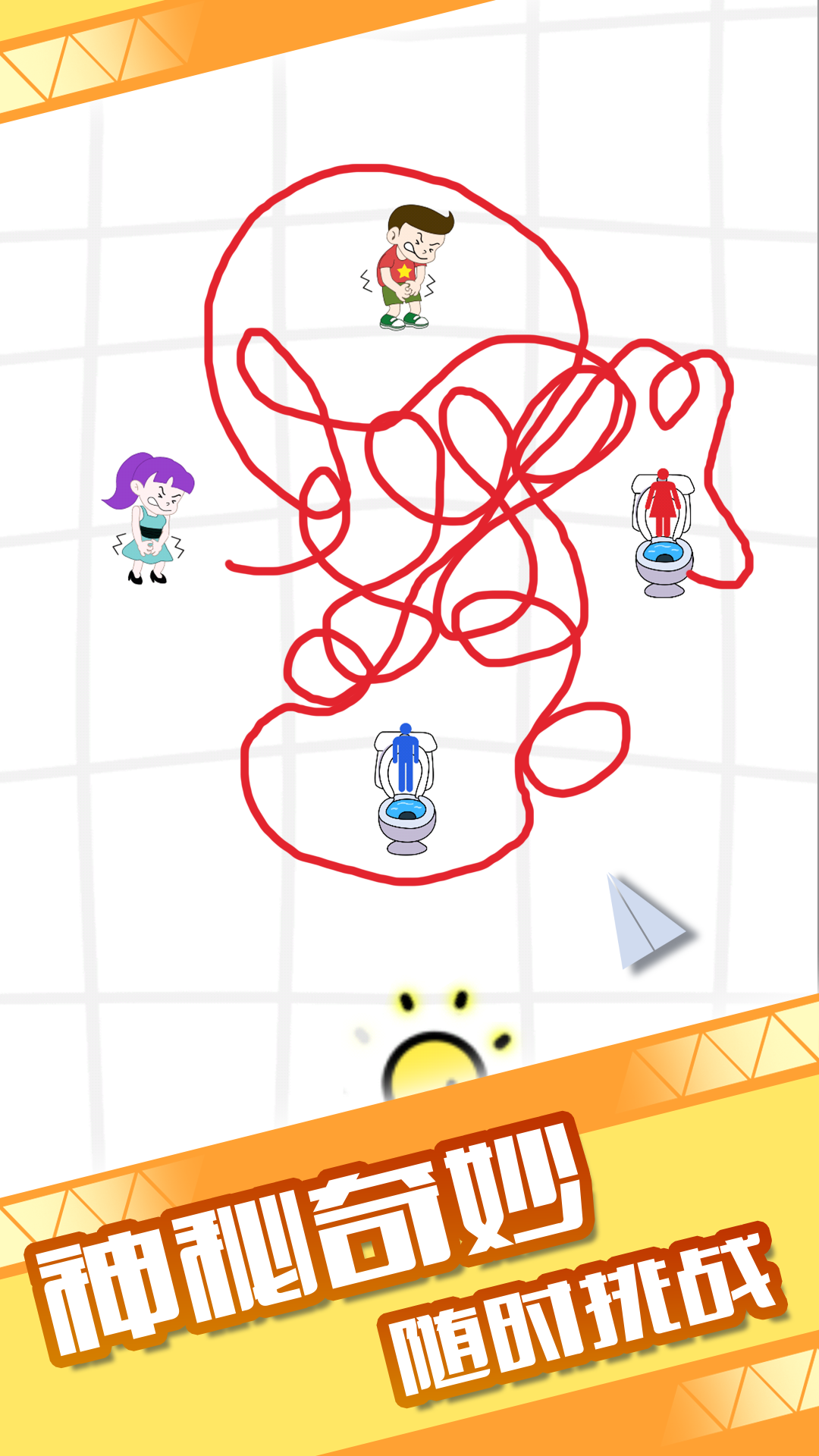 一款轻松有趣的益智闯关类游戏,帮助内急的他划出路线迈向厕所方向,成功抵达目的地——马桶。