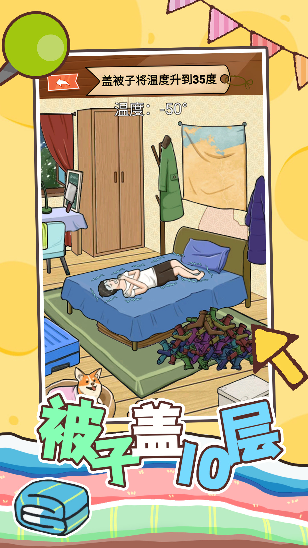 “冻死我了,快给我盖被子!”寒冷的冬天,小老弟只穿了一件背心在床上,快帮他盖上被子吧!在房间中找到所有能盖的被子,给小老弟盖上,帮助他度过这个寒冷的冬天吧!