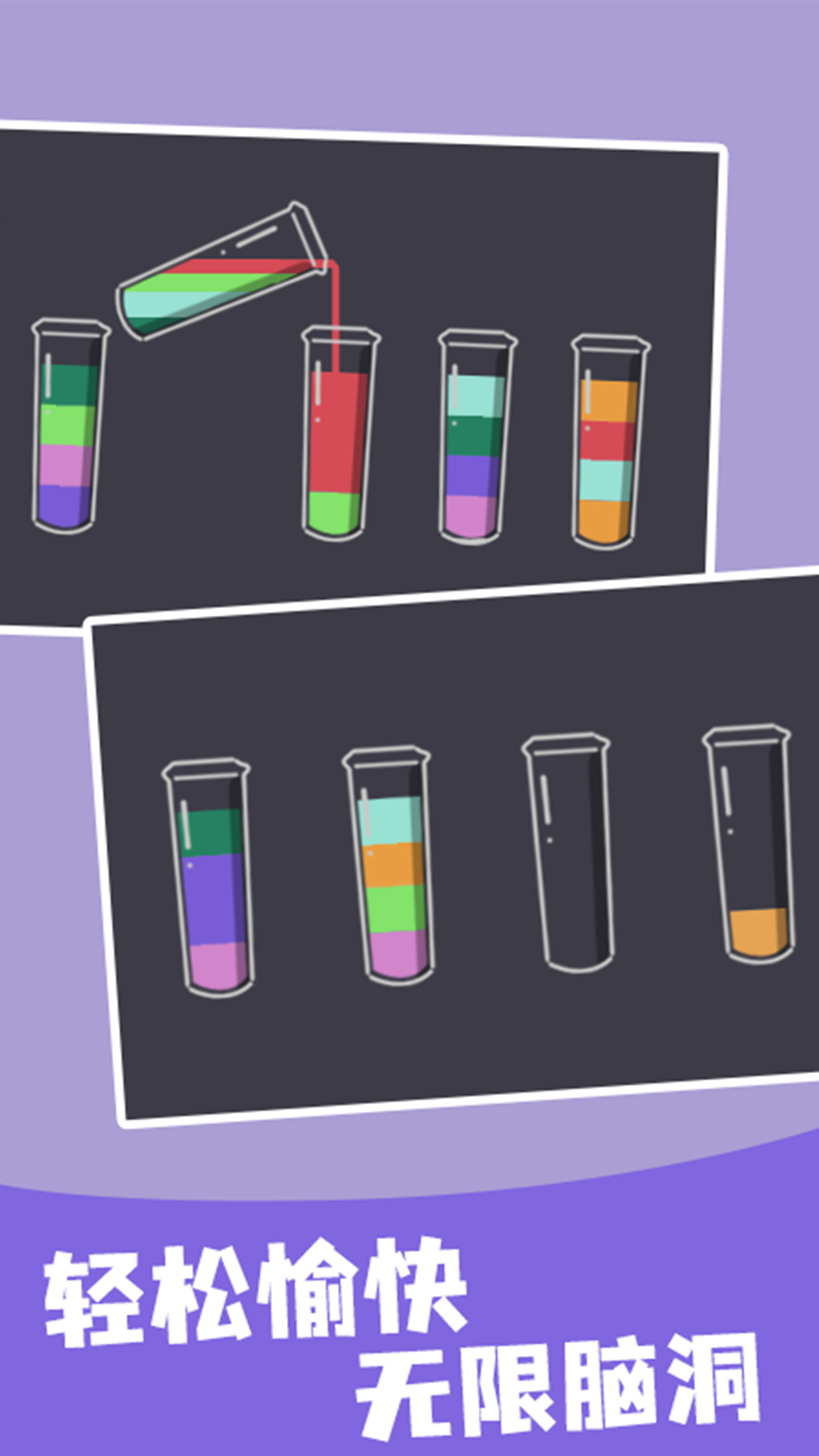 趣味益智的颜色排序游戏,玩法简单,玩家只需要将玻璃杯中的水按照颜色进行排序,让不同颜色的水聚集在同一个玻璃杯中即可过关。游戏里设计了十分丰富的关卡,这是一个具有挑战性且休闲解压的小游戏,娱乐的同时还可以锻炼你的大脑。