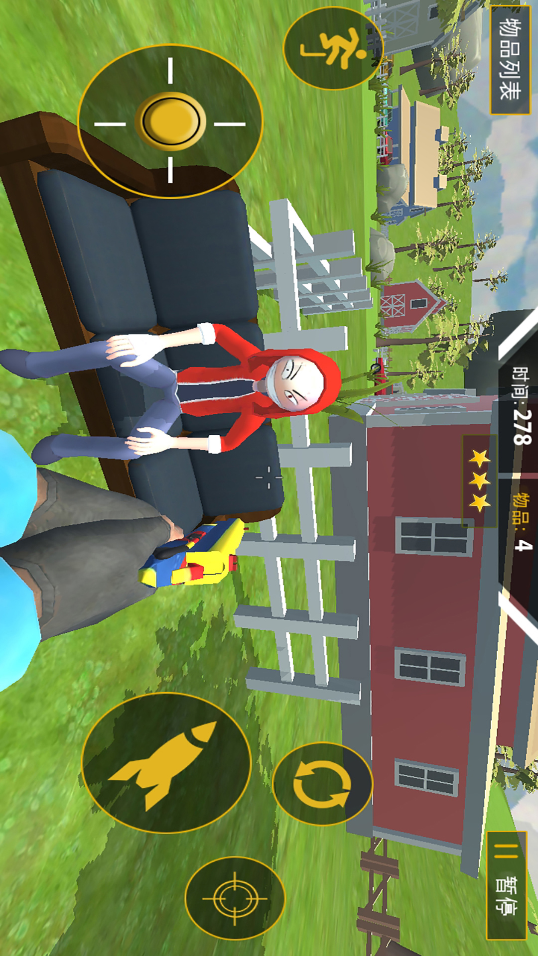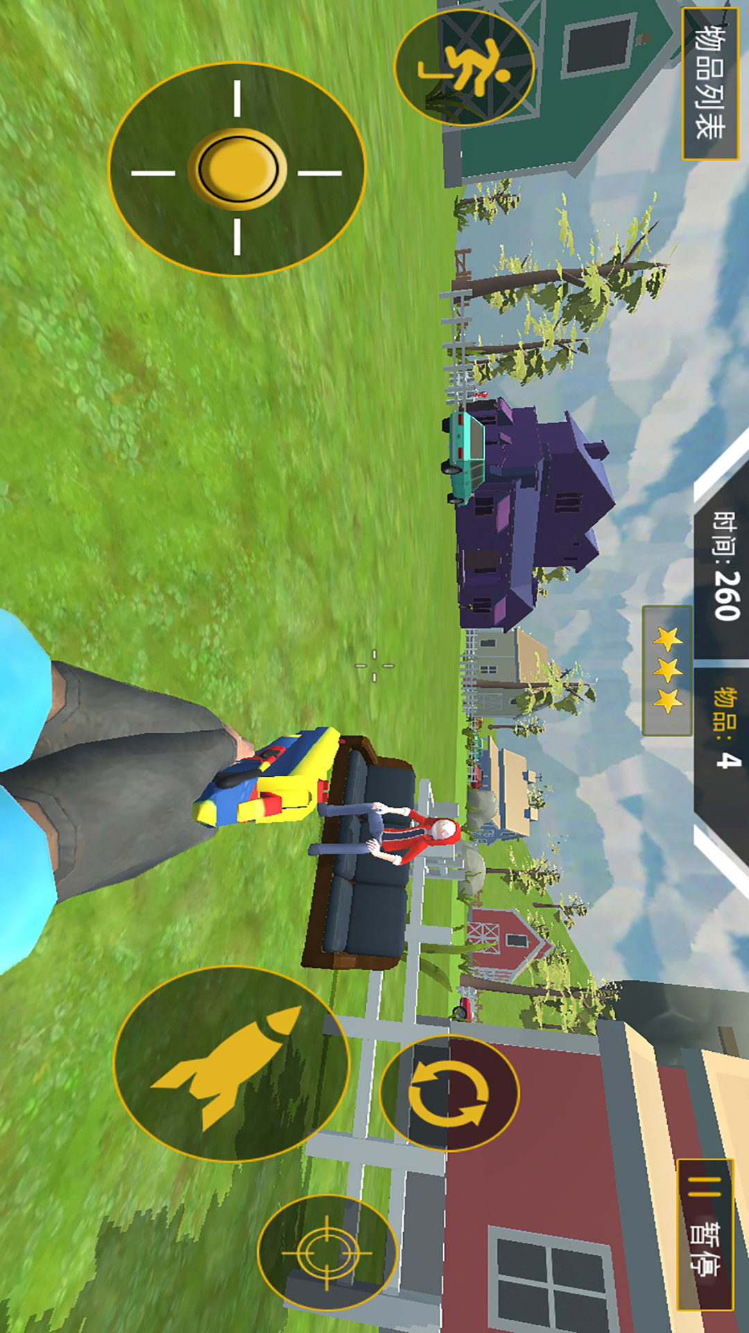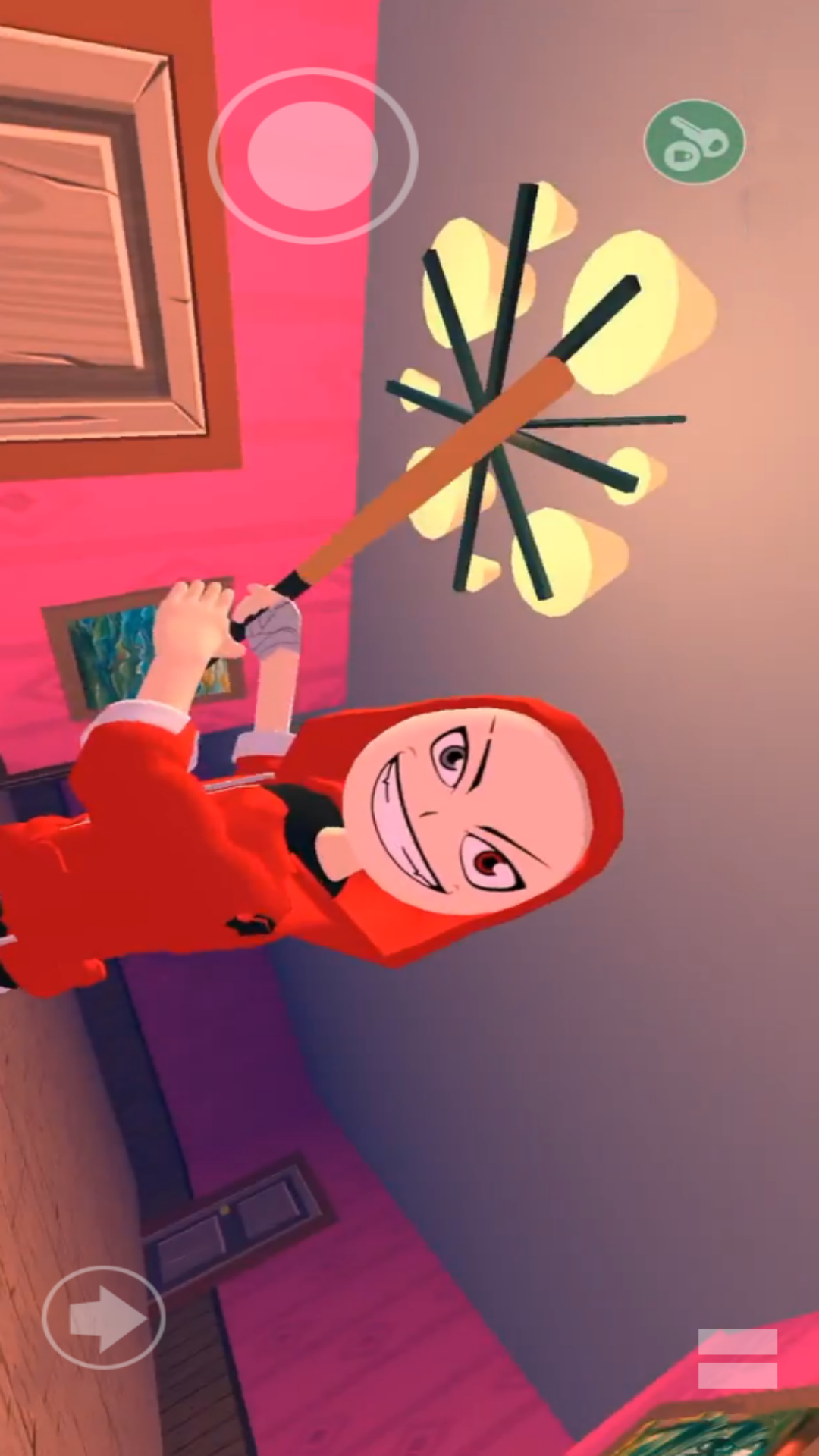 《逃出去疯狂大作战》是一款代入感非常强的解谜探索逃生游戏。在这个游戏中玩家将被一名捣蛋恶霸追击,他手中挥舞着武器想要伤害我们,为了能够逃出去,我们需要在不同的地图场景中进行探索,找到能够逃离别墅的钥匙,躲避佩罗德的追击