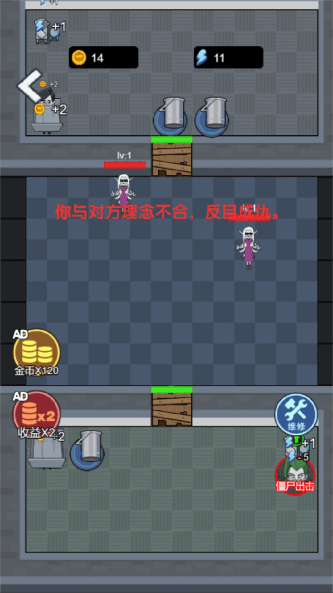 《躺平故事会》该游戏是一款有趣的生存小游戏,在公司大楼内,老板突然发生了变异,你需要赶紧找房间躲起来不被发现,偷摸发育赚钱购买大炮,持续生存,击败变异老板,快来挑战吧!