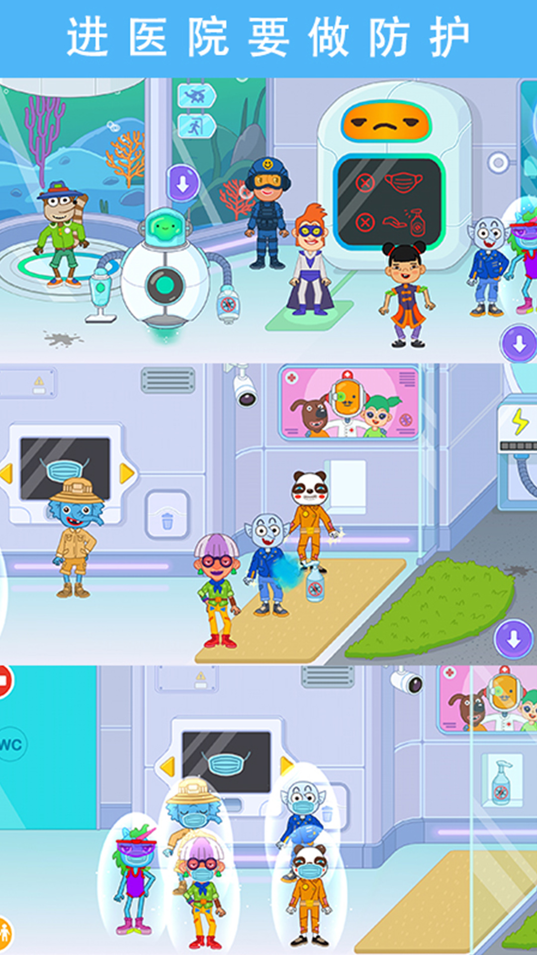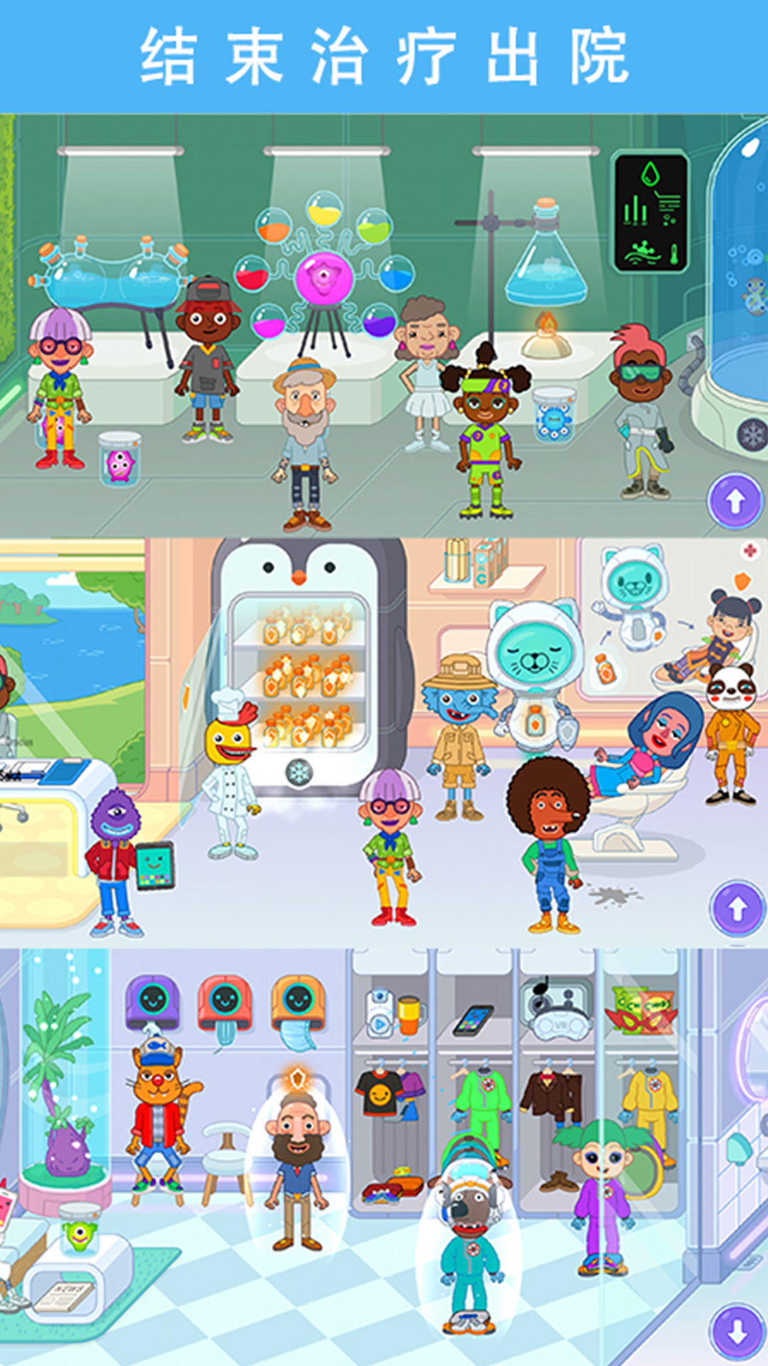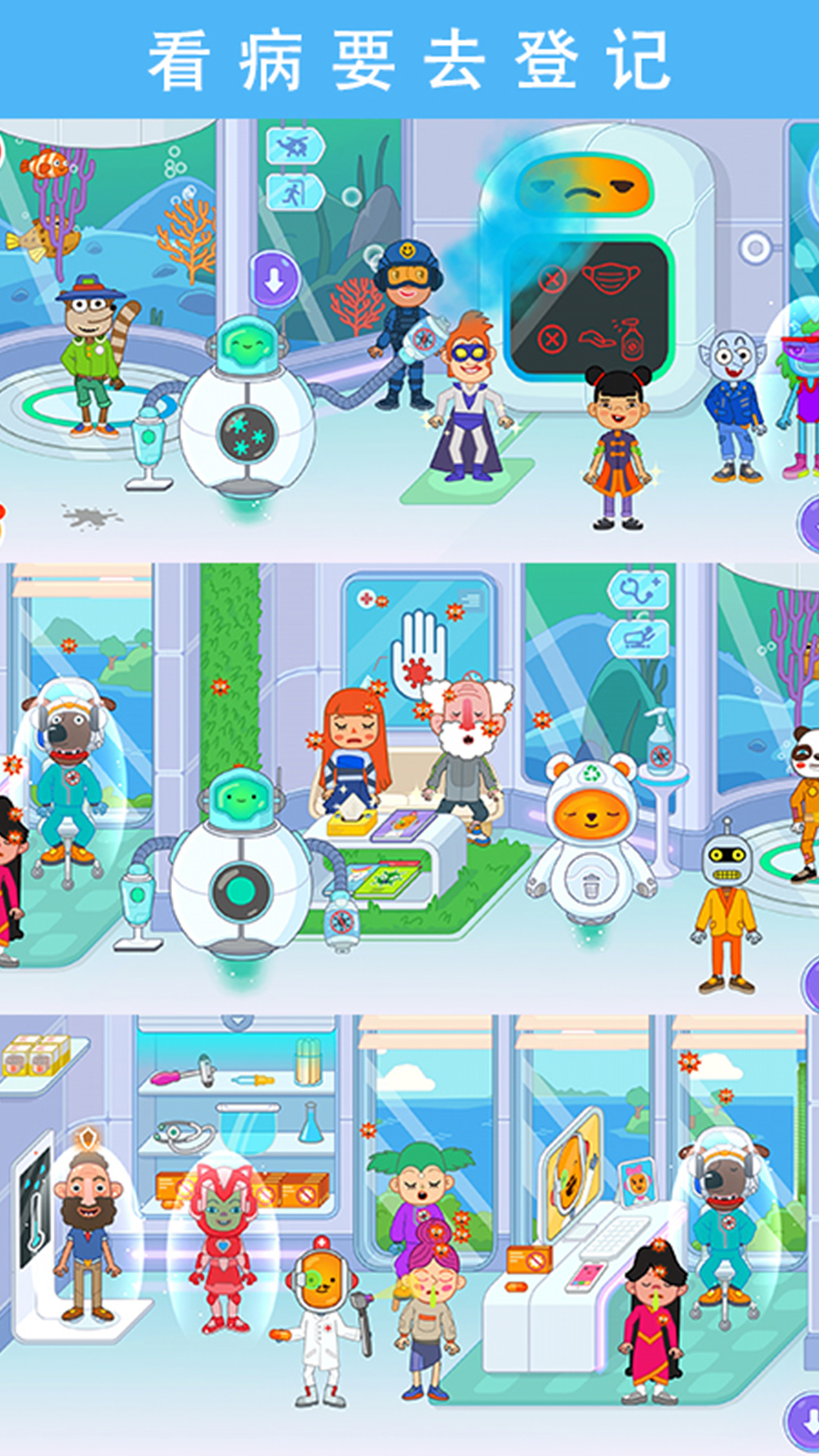 未来的流感诊室期待您书写独特故事,丰富新活动等您体验:化身医生,用新式互动设备为患者治疗,以抗病毒疫苗预防感染;扮演科学家,借助科学实验室设备对细菌实验;或者充当患者,接受可爱的机器人照料。我们为医疗中心融入独特游戏元素,每个房间都有众多互动区域,如智能屏幕、现代实验设备和迷你游戏屏,让您在未来流感诊室的故事里收获无尽愉悦与难忘回忆。