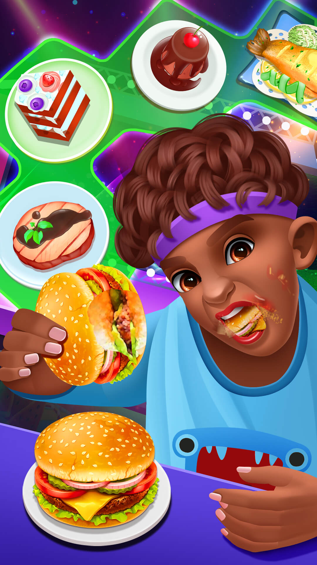 巧克力奶油蛋糕、牛肉芝士汉堡、炸猪排、煎鱼、煎牛排。巧克力布丁等等,根据每位顾客想要的目标体重,为他们精心搭配准备食材,烹饪出美味的料理。还可以自己diy装饰食物,让食物看起来更有食欲。