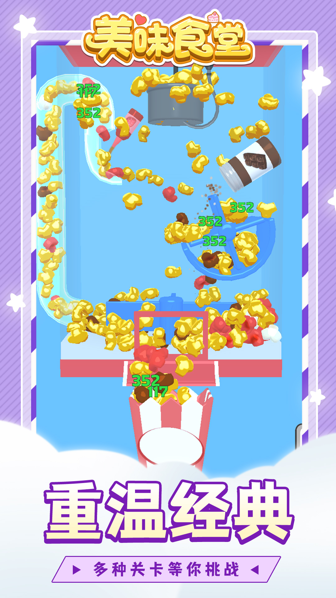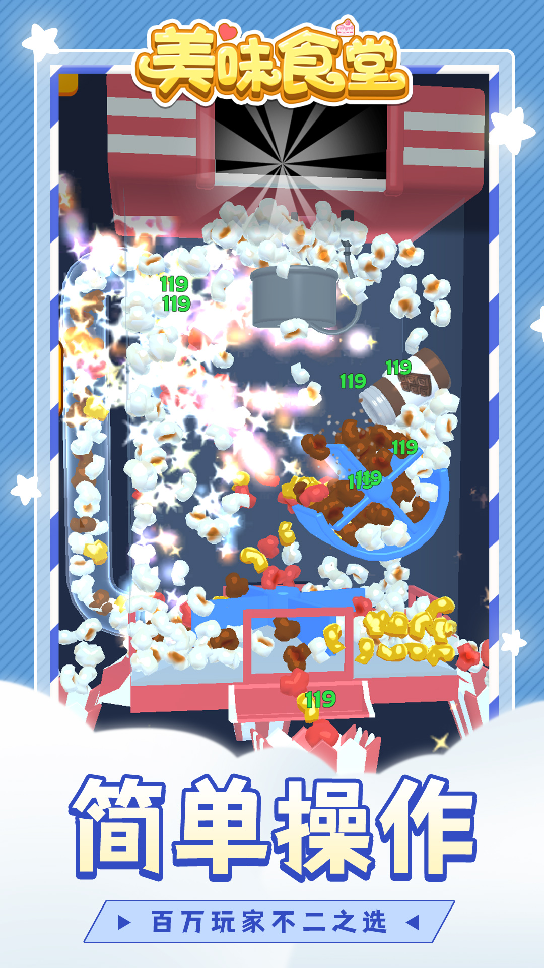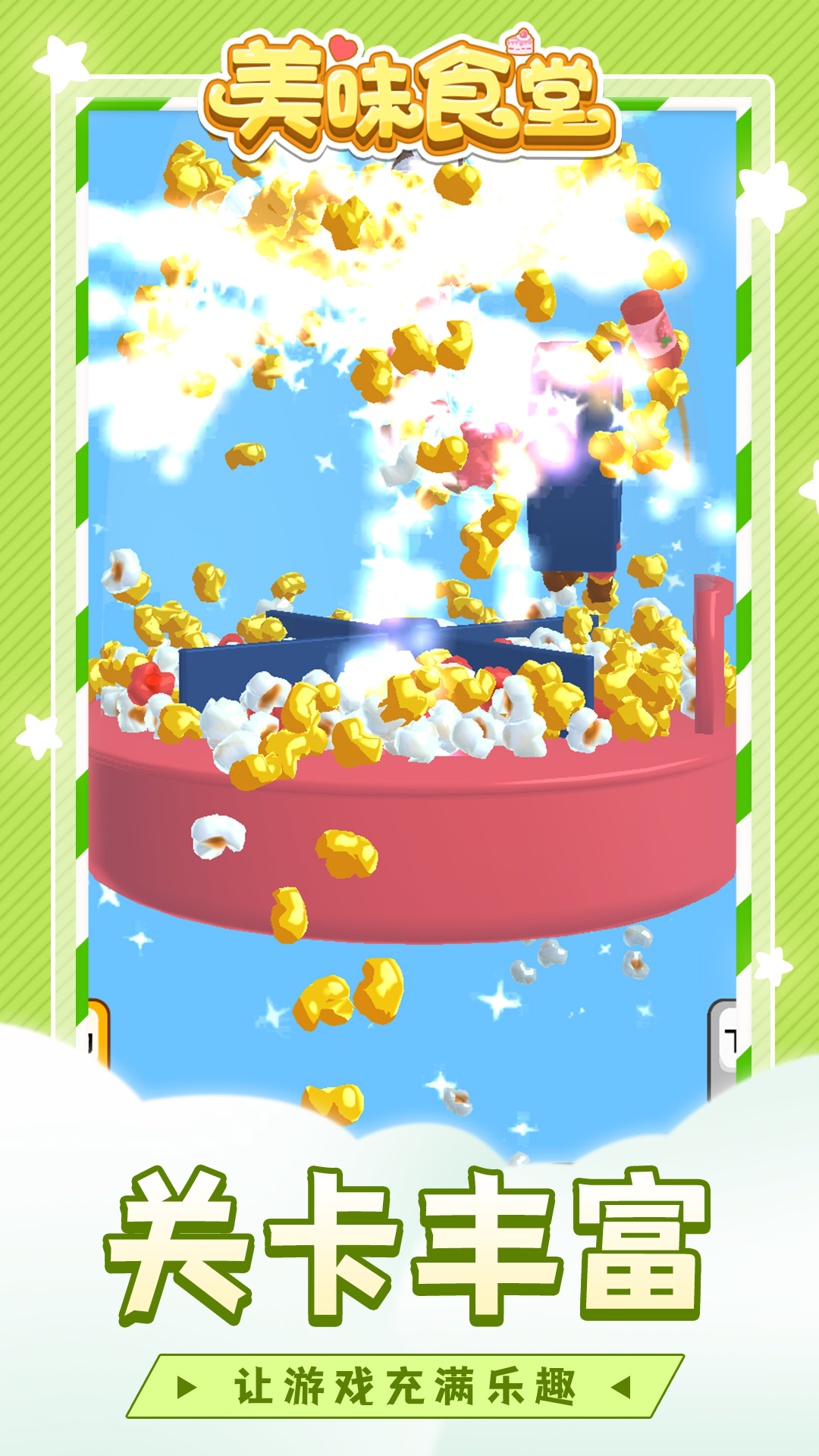 《美味食堂》作为一款标准的放置休闲游戏,你只需要点击屏幕进行升级,就能收获源源不断的美味爆米花,轻松休闲的玩法跃然纸上。游戏中设计了各种不同形状和功能的爆米花机,等待你的挑战。游戏开始之后,你将拥有最基础、最简单的爆米花机,不断努力升级,提升收益效率,获取功能更加多样的爆米花机。