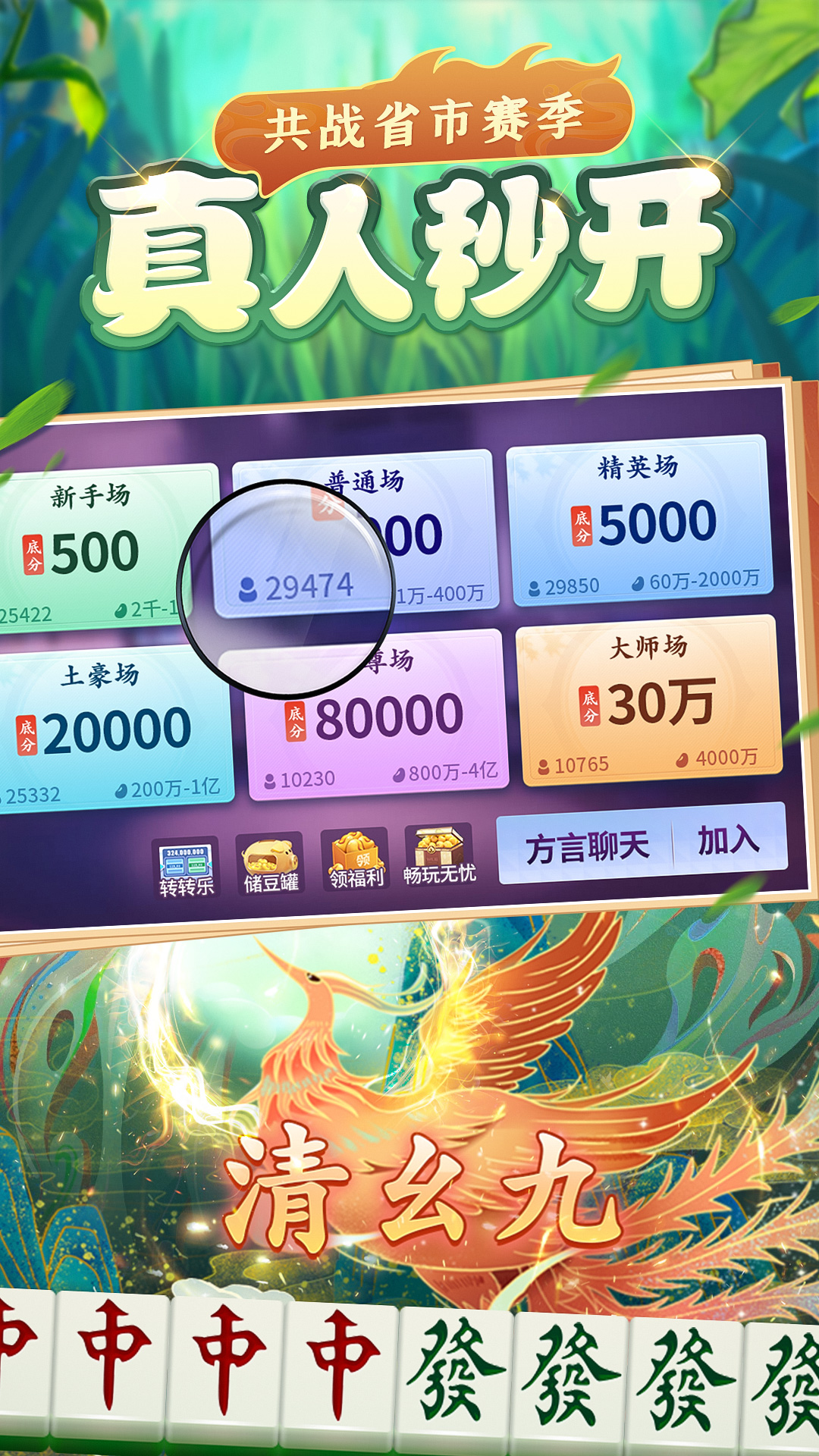 百变国标、血流红中、至尊八喜、经典免洗...全国各地正宗玩法应有尽有,不同地区省市赛季更新,争做地方牌神雀神!