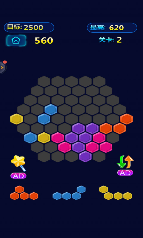 这是一款休闲消除游戏。打破传统,全新六角布局,独特的合成机制,体验前所未有的挑战,游戏分为两个模式:一种是将不同规则的小图标拖入六角形中拼图,完成拼图则过关。另一种是我们通过将不同规则的小图标放入到六角形中,当连成一条横线的时候就可以被消除。这种消除模式的主界面是一个大六边形棋盘,六边形的每一边又由5个小六边形组成,构成共有61格的棋盘空间,玩家拖动系统自动输出的各种六边形组合置于大六边形的空白处,使之排列成完整的一行或多行并且消除得分,而连续消除会有额外加分。直到棋盘上再也无法摆下任意一个六边形组合的时候,游戏就会失败