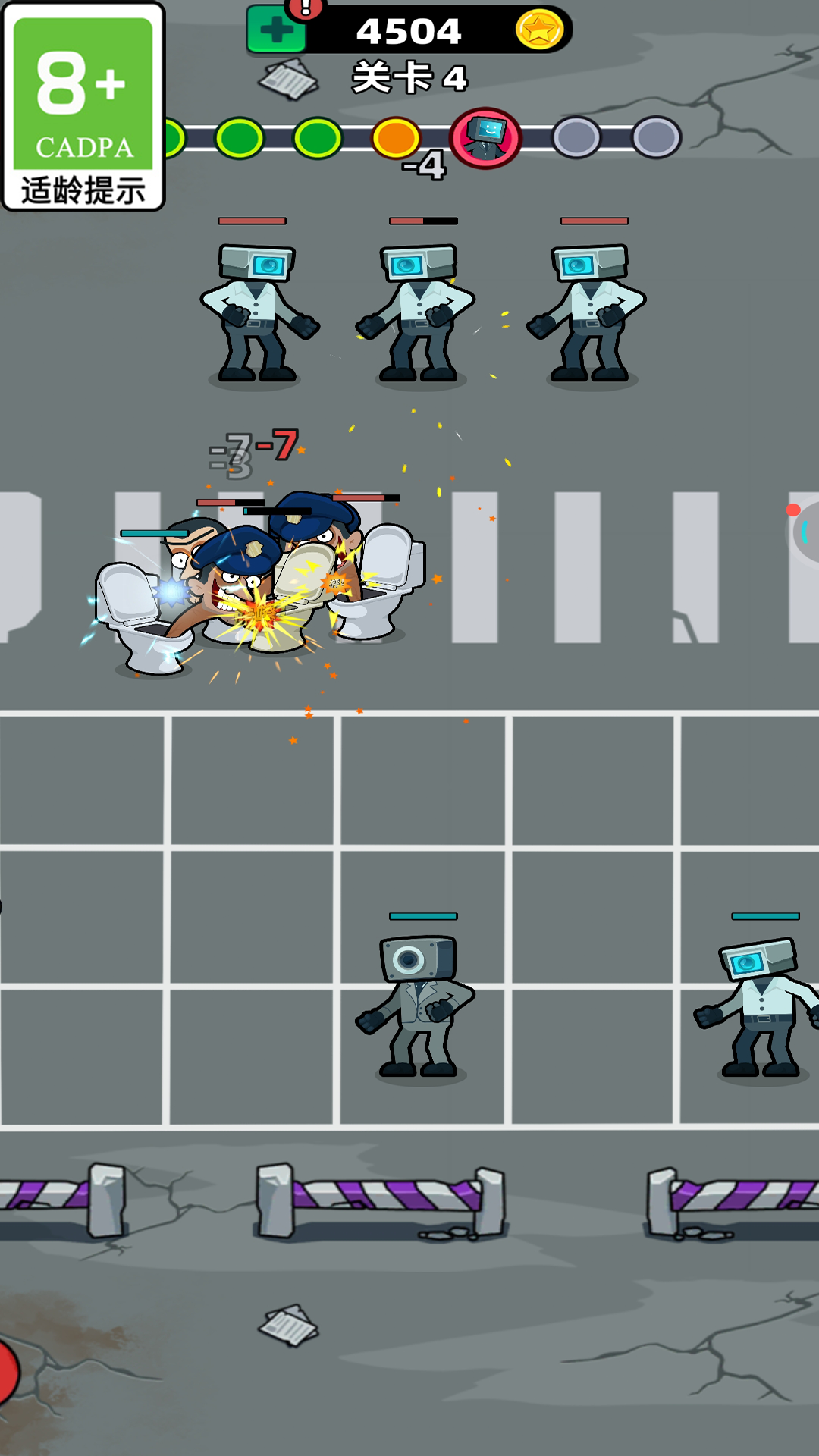 合并马桶人决战敌人,移动自己的怪兽进行调整。争取对决的胜利,赢得奖金,利用奖金购买新的怪兽,然后合成升级,成为强的那一个吧!
