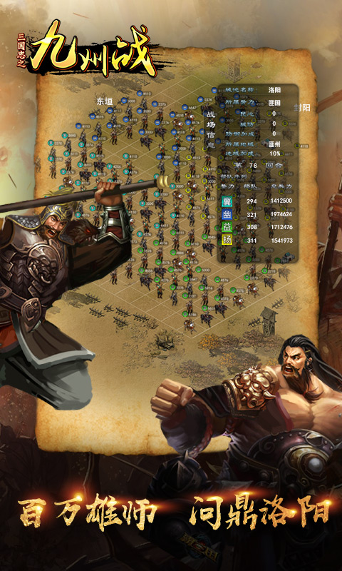 《三国志之九州战》是一款策略类手机网络游戏,它以三国时代的文化作为背景。这款游戏有着诸多引人入胜之处:其画面风格精美细致,游戏场景真实细腻,战争场面恢宏壮阔。它真实地还原了三国地图以及历史名将,而且能够实现十万部队同屏作战。
