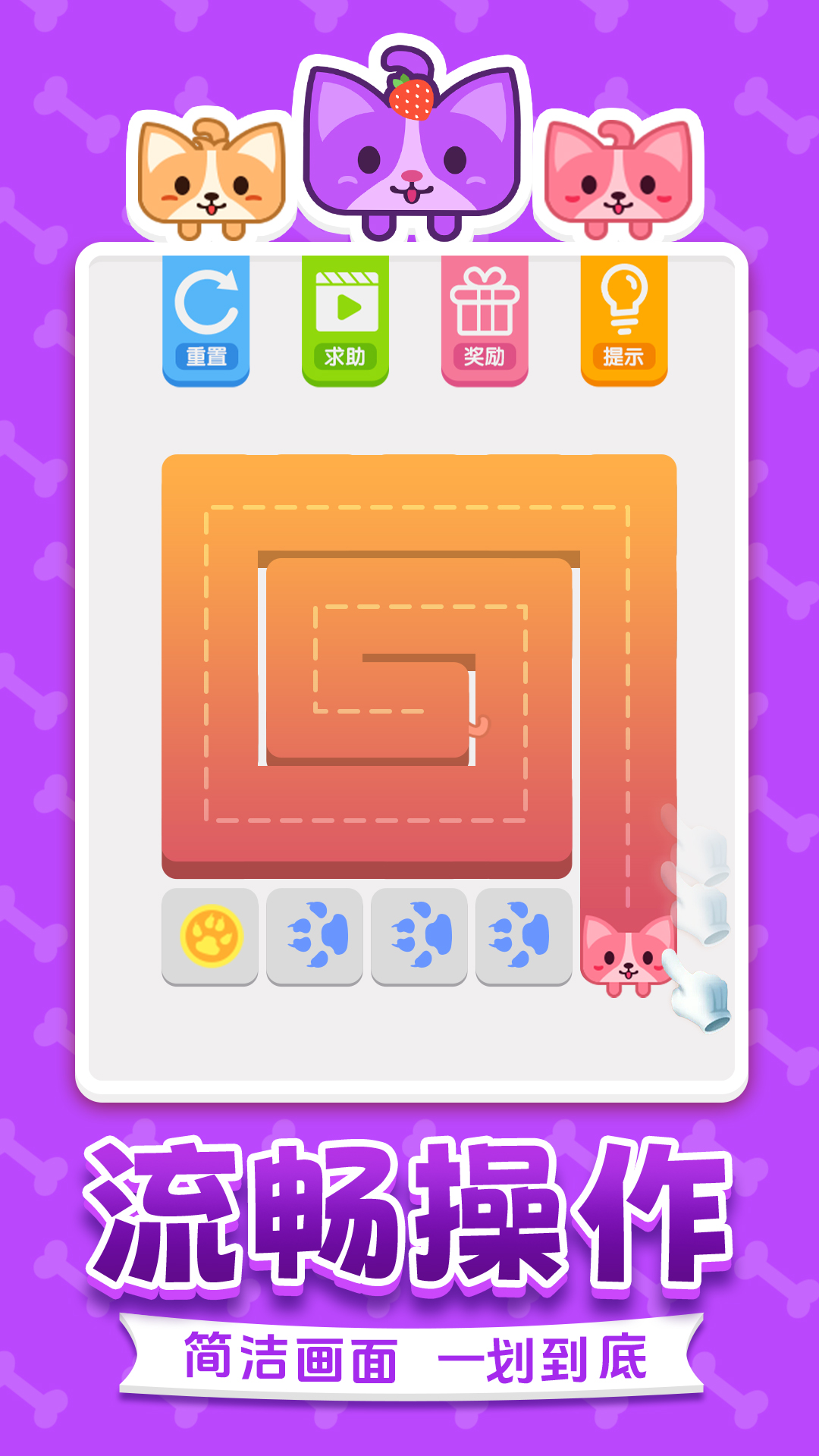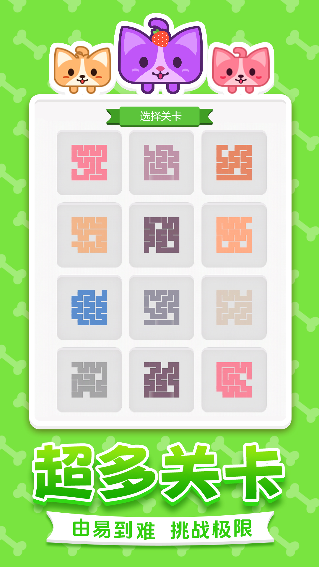 数百个由易到难的关卡设计,开动你聪明的小脑瓜,带领可爱汪汪一笔走完所有格子吧!