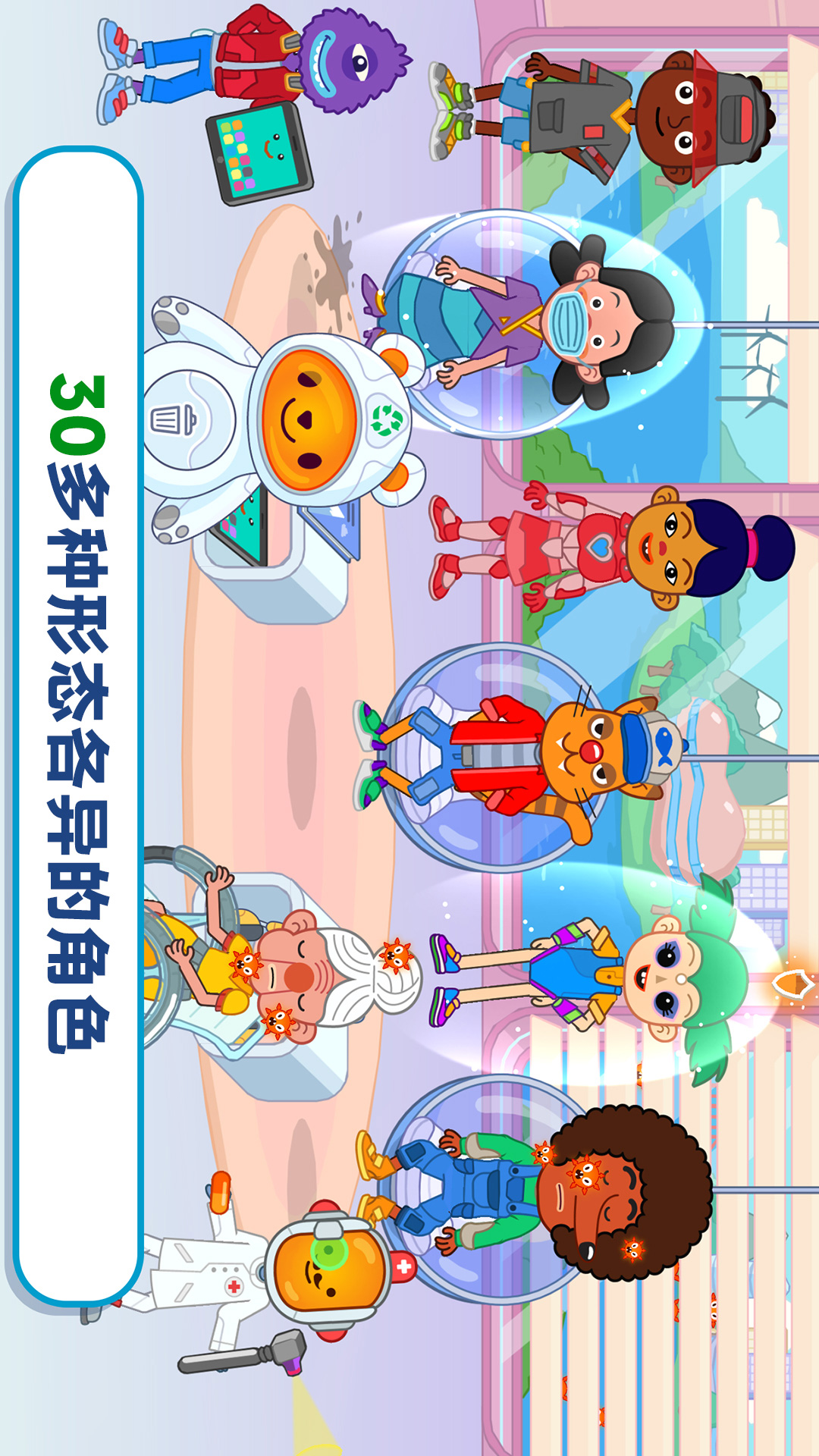 发现和探索现代医疗中心,续写你作为医生、病人或科学家的故事!高度自由的游戏玩法,以有趣和互动的方式学习如何通过疫苗、口罩和手部消毒来预防感染。该游戏将带您前往未来的流感诊所,在那裡您将遇到 7 个友好的机器人,他们是医生和医务人员。这个现代化的医疗中心在建筑的每个部分都充满了新的互动技术,供您探索和创造您的故事:从细菌实验室到直升机救护车,从充满迷你游戏的大厅到科学实验室。