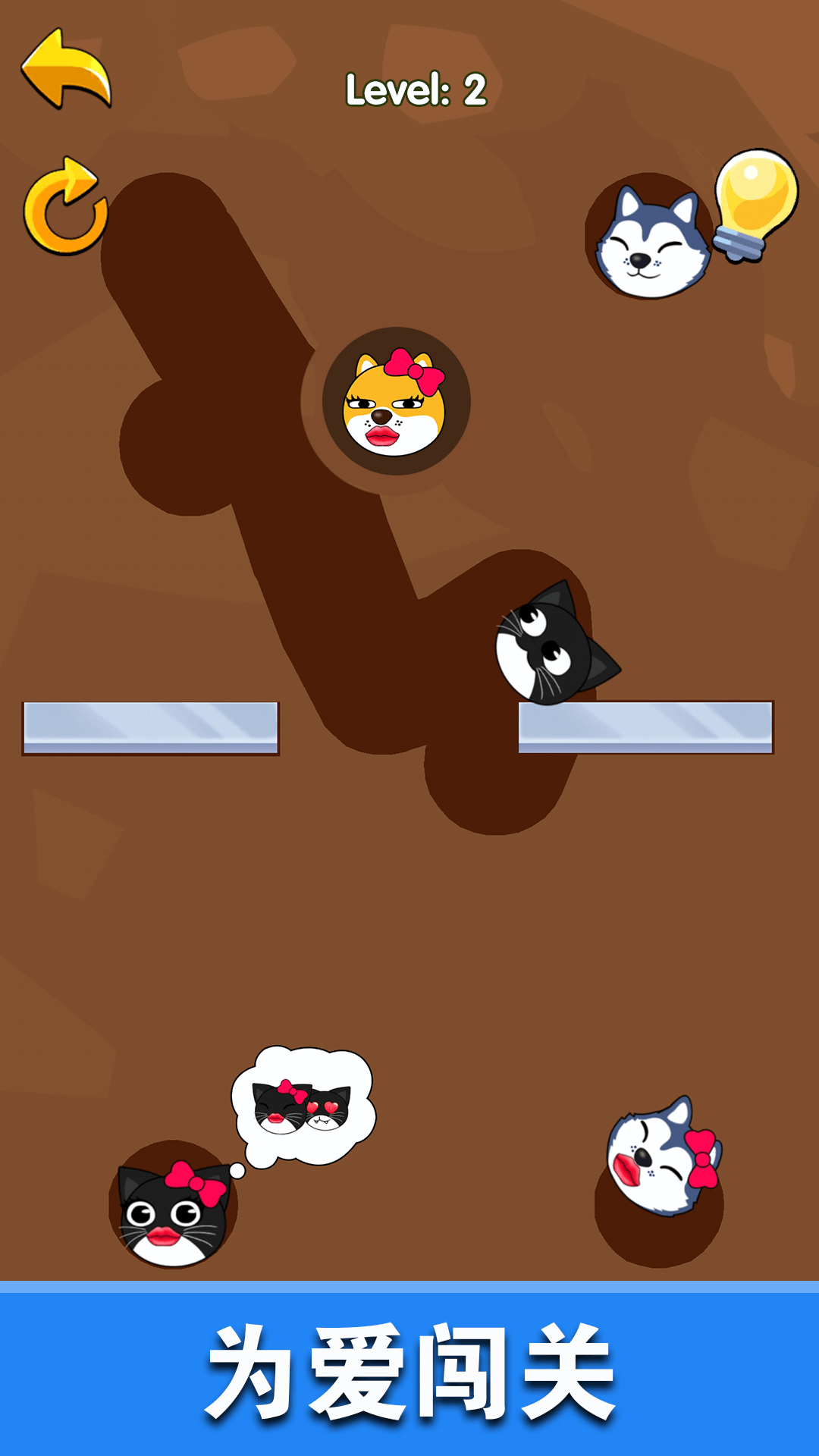 游戏简介:《恋爱也疯狂》是一款让你欲罢不能的休闲闯关类游戏。通过动动手指挖通泥土,将可爱的狗蛋们正确配对,让它们成功么么哒!游戏配置丰富的关卡,操作简单,让你尽情体验游戏乐趣。此外,还有许多精美又魔性的皮肤等着你解锁,赶紧下载游戏,开启无尽乐趣!