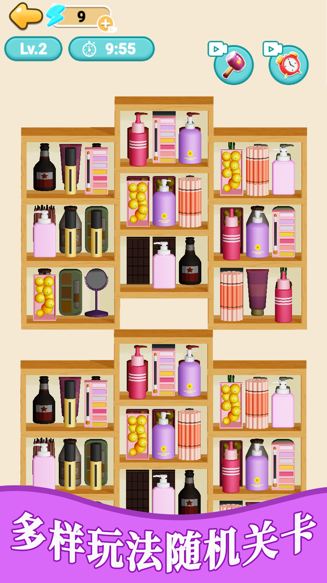 - 每个关卡中都会又不同的物品可以放置,大多是不规则的物品,需要合理的全部放进冰箱之中
