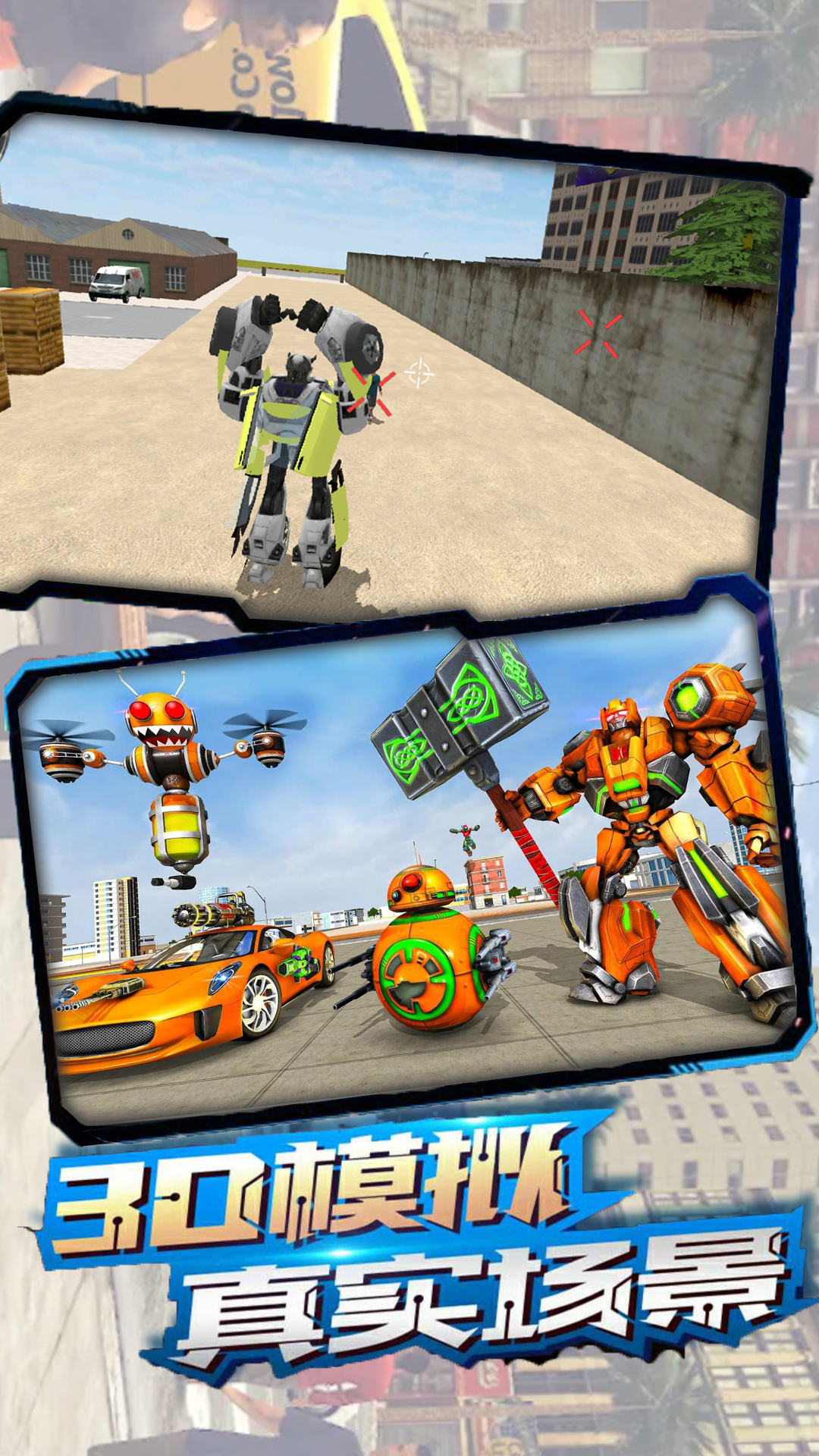 游戏玩法:玩家可以选择变身成机器人或者变身汽车驾驶,展现您的超能力,并在这场城市大战中以机械战士的身份应对无尽的机器人大战。