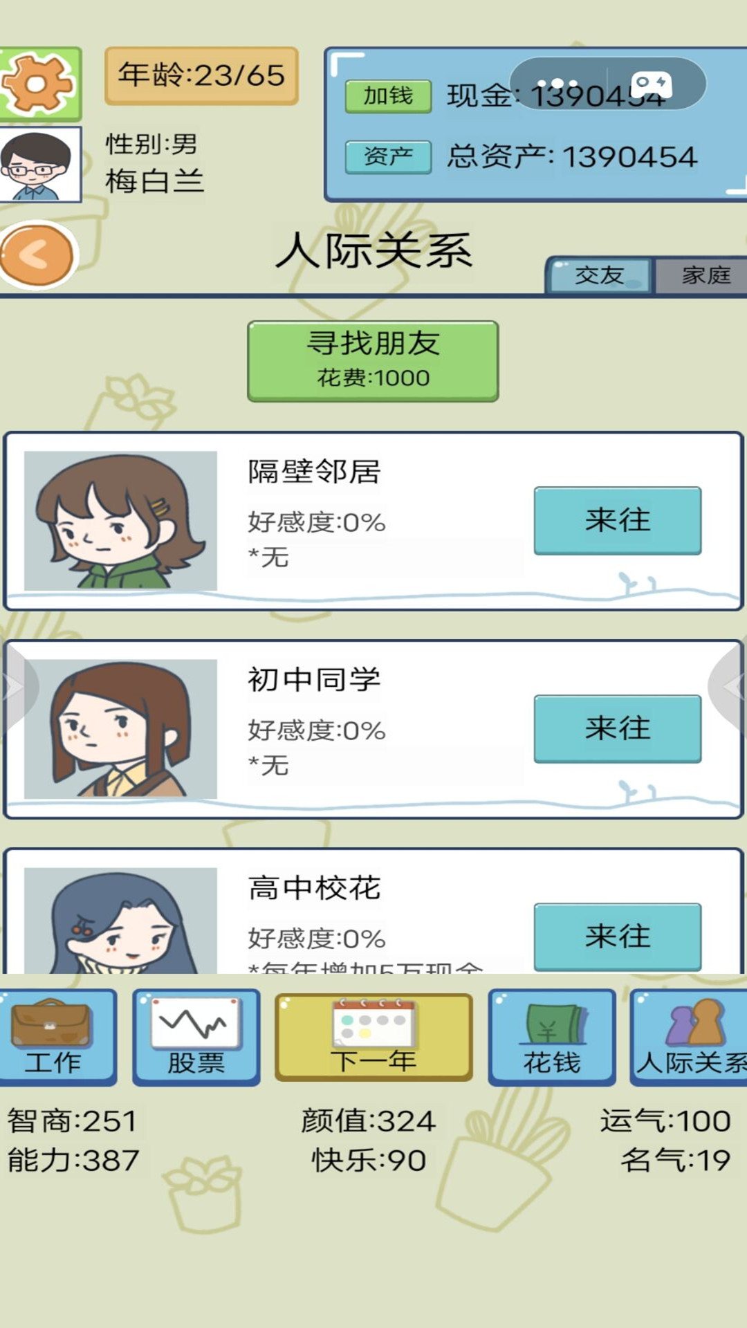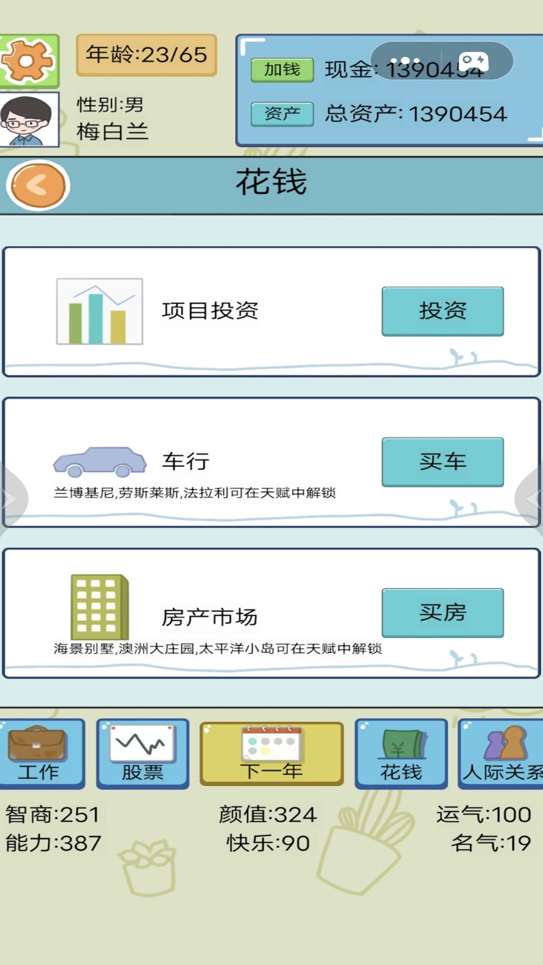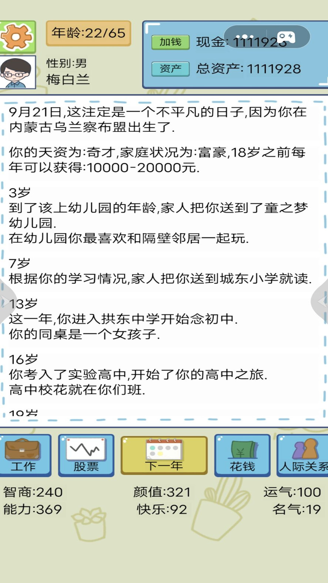 一款有趣的人生模拟游戏,在游戏开始时,你可以自由分配自己的天赋和属性,之后游戏会自动开始模拟你的人生,每次模拟都会有不一样的结果。