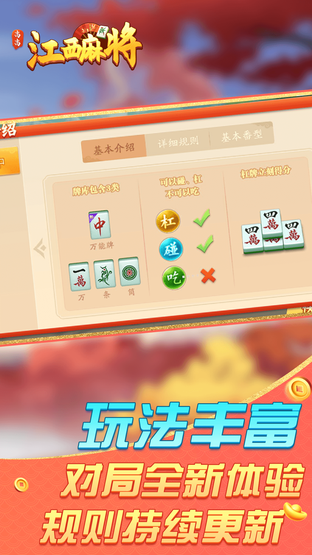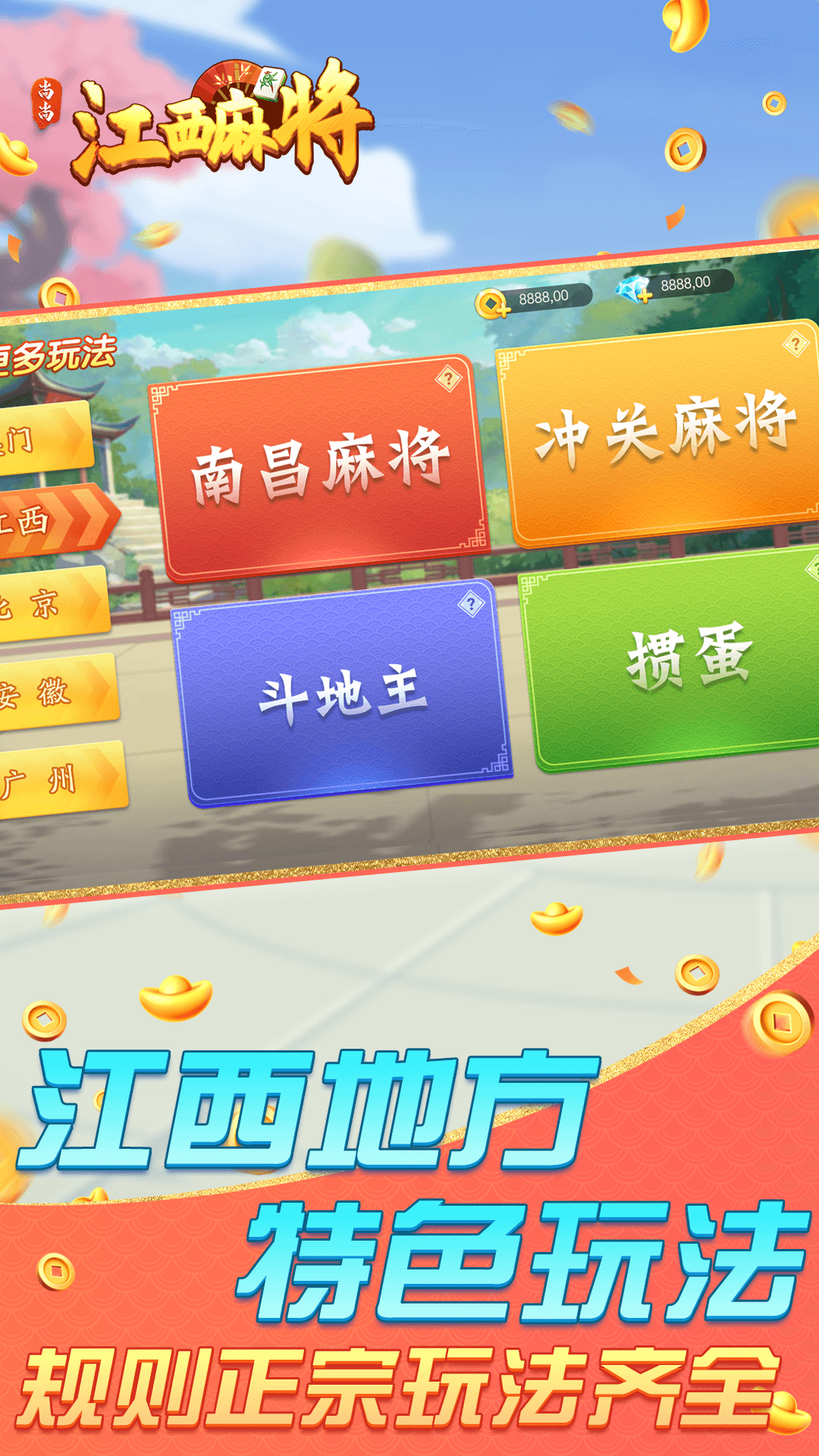 冲关麻将、南昌麻将、斗地主。深入本地特色,玩法正宗齐全。