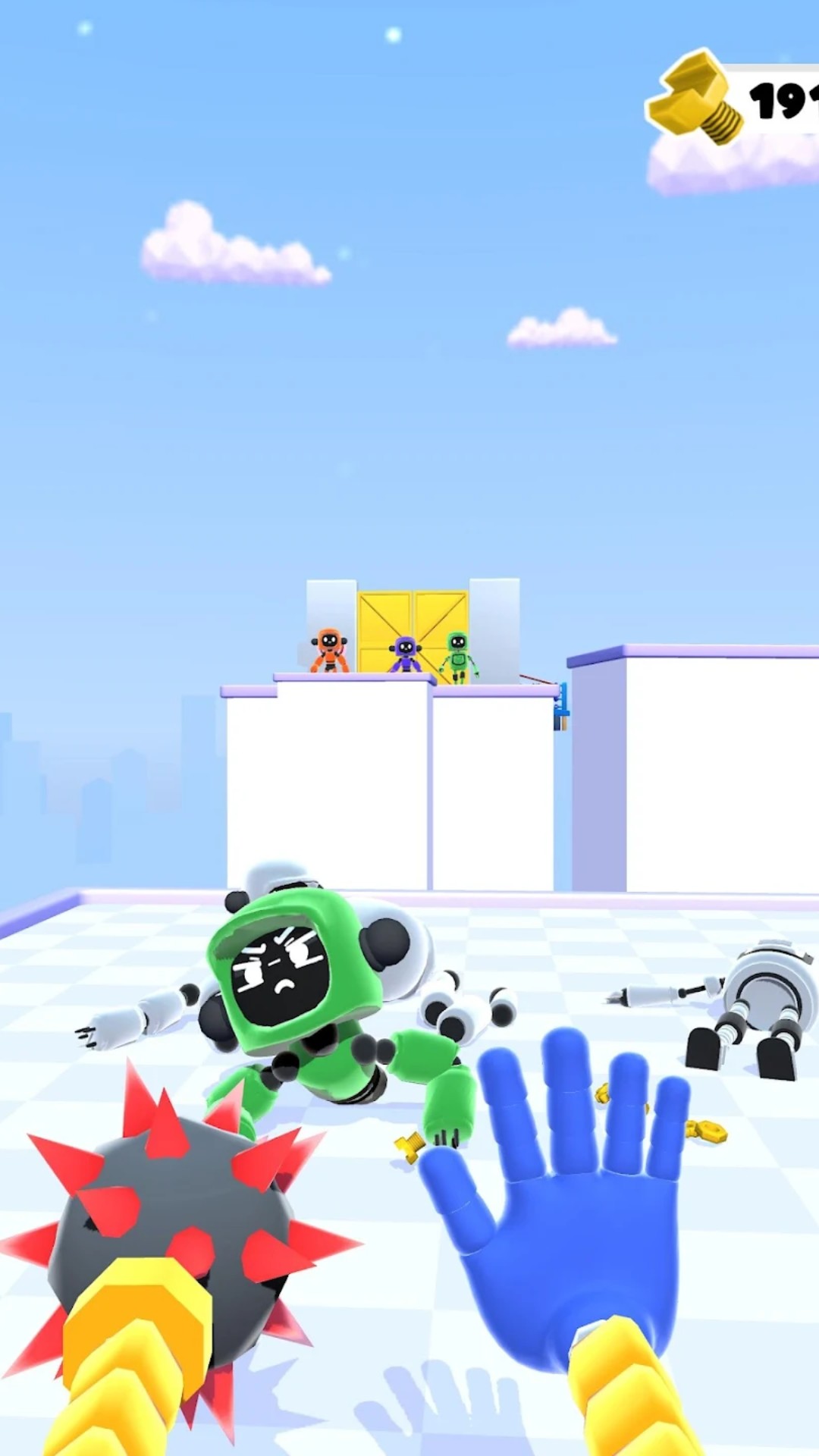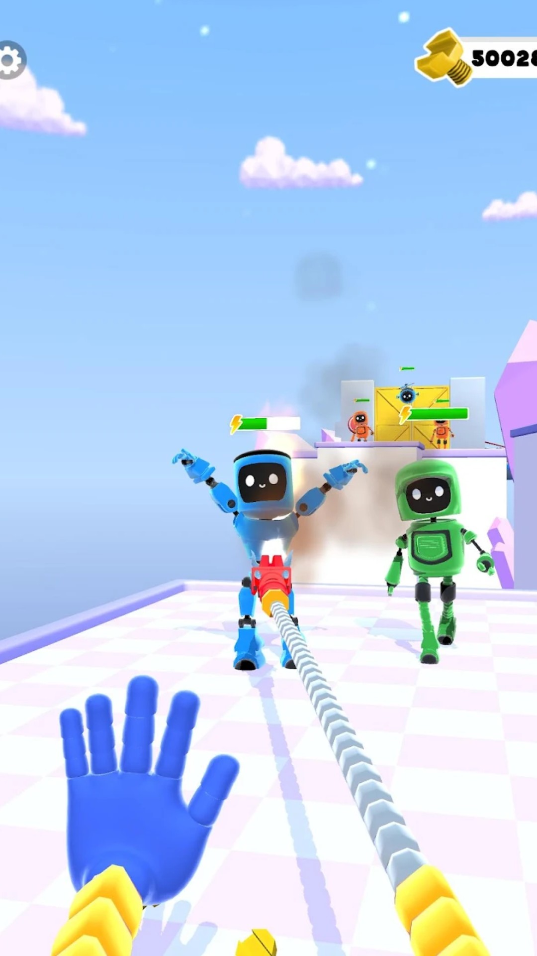 收集机器人螺栓以创建新的超级机器人手。它们就像元素游戏中的魔手。选择您应该戴上哪种手套来击败机器人。每只手都可以拥有自己的手套力量。使用磁铁和电力的超级力量,或者一只手拿手榴弹,另一只手拿钉锤。