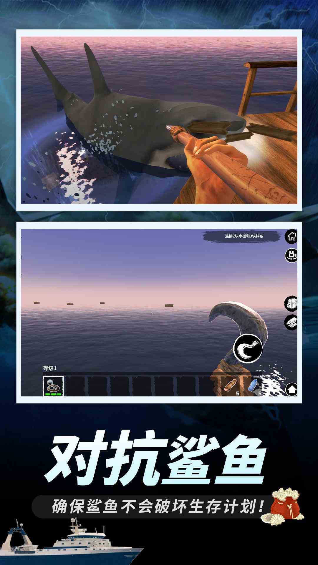 一款真实沙盒求生游戏,在茫茫大海上醒来,在一只木筏上需要努力想办法活下去,收集海里的资源,扩大木筏面积,打造各类求生工具,武器等,鲨鱼会攻击你的木筏哦,时刻关注自己的身体状况,及时进食,喝水等,在充满危险的大海上活下去。