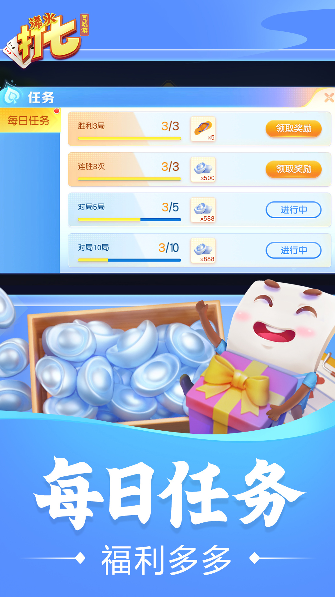 同城游浠水打七是发源于湖北黄冈市浠水地区的一种升级类扑克游戏。打七儿的玩法灵活多变,娱乐性十足。并且特有的数点、抱卖鸡和找朋友玩法,极大的提高了游戏的对抗性。现同城游将打七儿搬上了网络平台,以浠水地道的规则为基础,并结合了简单人性化的操作以及流行有趣的元素,玩家可以随时随地登录游戏和其他玩家比拼牌技、互动交流。
