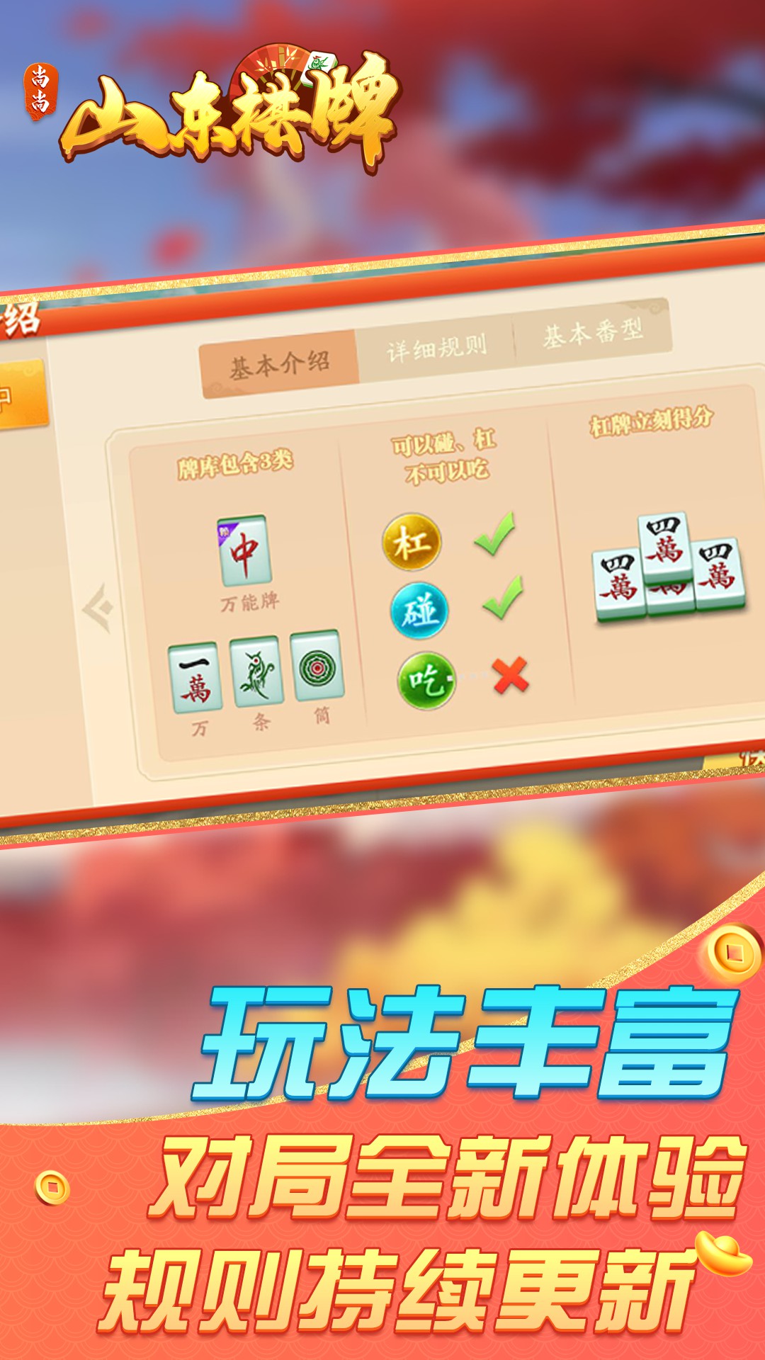烟台麻将、济南麻将、斗地主。深入本地特色,玩法正宗齐全。