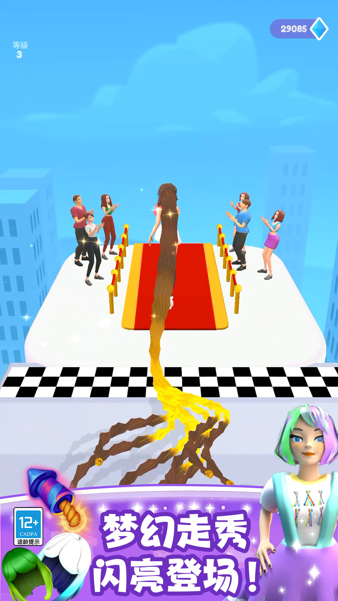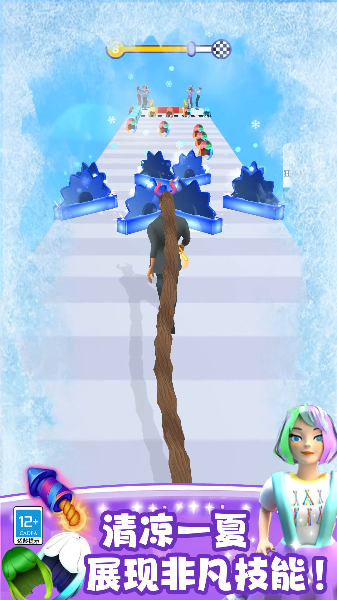 这是一款趣味性的休闲游戏,简约的画风设计符合所有玩家追求,而且简单易上手的操作难度,对于新手玩家也显得格外优化,游戏过程中玩家需收集道路上的头发来增加你的发量,待你长发及腰,通关后可获取的奖励就愈加丰富。海量关卡的精心设计,进一步提升了玩家的游玩体验,